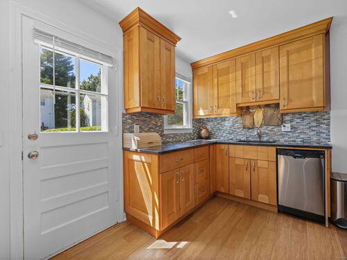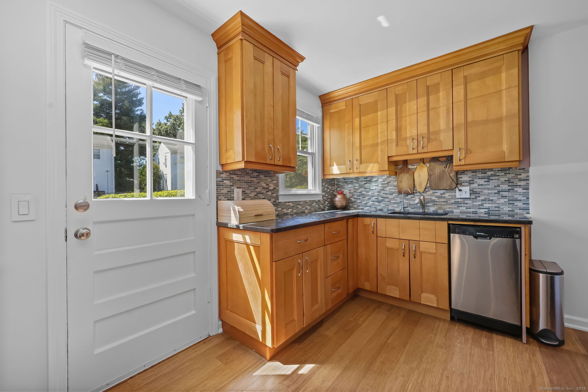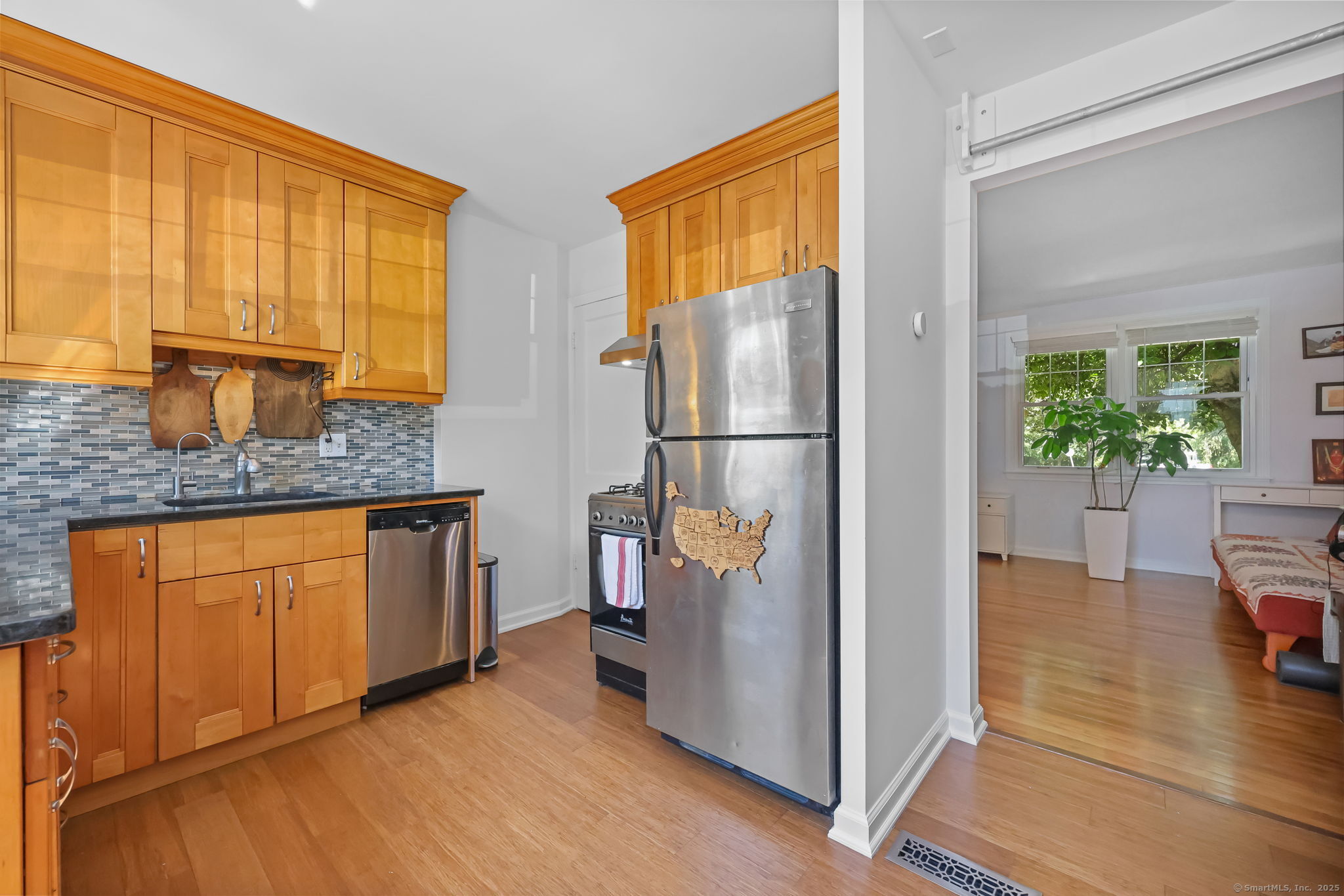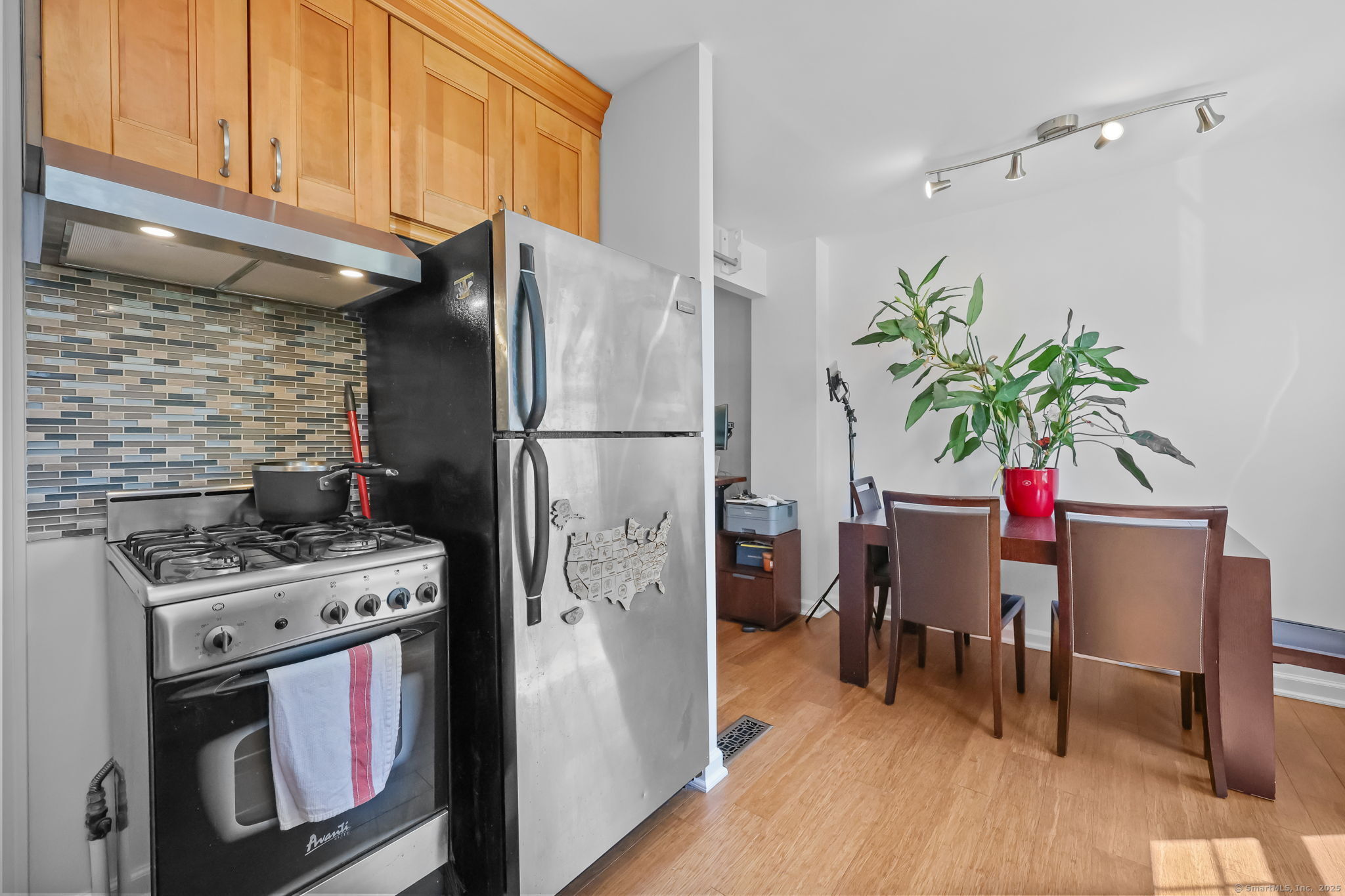 Nestled in the Sylvan Knoll Community, this charming 2-bed, 1-bath, 3-level townhouse offers the perfect blend of comfort, convenience, and modern updates. Sylvan Knoll is a quiet, pet-friendly, owner-occupied co-op complex where taxes are included in the monthly common charges. Step inside to find newly refinished hardwood flooring, recessed lighting, and double-pane windows with new blinds and trims. The opened wall allows natural light to pass through living and dining areas and the kitchen is outfitted with a Frigidaire refrigerator, 4-burner gas stove with a vented hood, and ample cabinet space. Upstairs features hardwood floors that have been sanded and stained, with fresh trim throughout. Complete bathroom remodel with new fixtures, waterproofing, tiling, flooring, and finishing touches. Additional highlights include a 2023 water heater, Nest thermostat system for efficient heating and cooling, and an attic with flooring and insulation-providing excellent storage. The lower level is complete with well-maintained tile flooring and a separate storage/utility room with a new LG washer and electric dryer. Outside enjoy a private patio and garden, with easy access to parking. Conveniently located near Exit 9 on I-95, and just minutes from Cove Island Beach, Cummings Park, Chelsea Piers Athletic Club, plus a short drive to downtown Stamford and the Metro-North station. This home has been thoughtfully maintained and updated, making it truly move-in ready!
