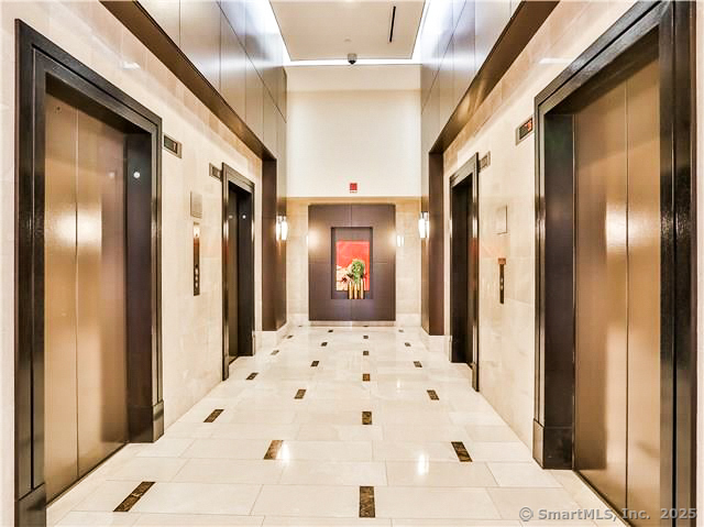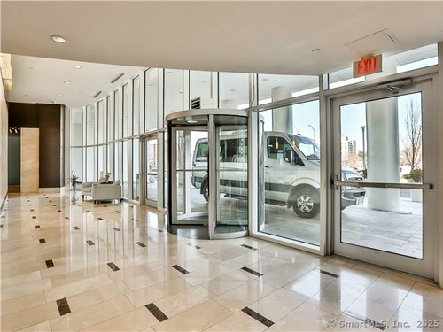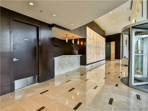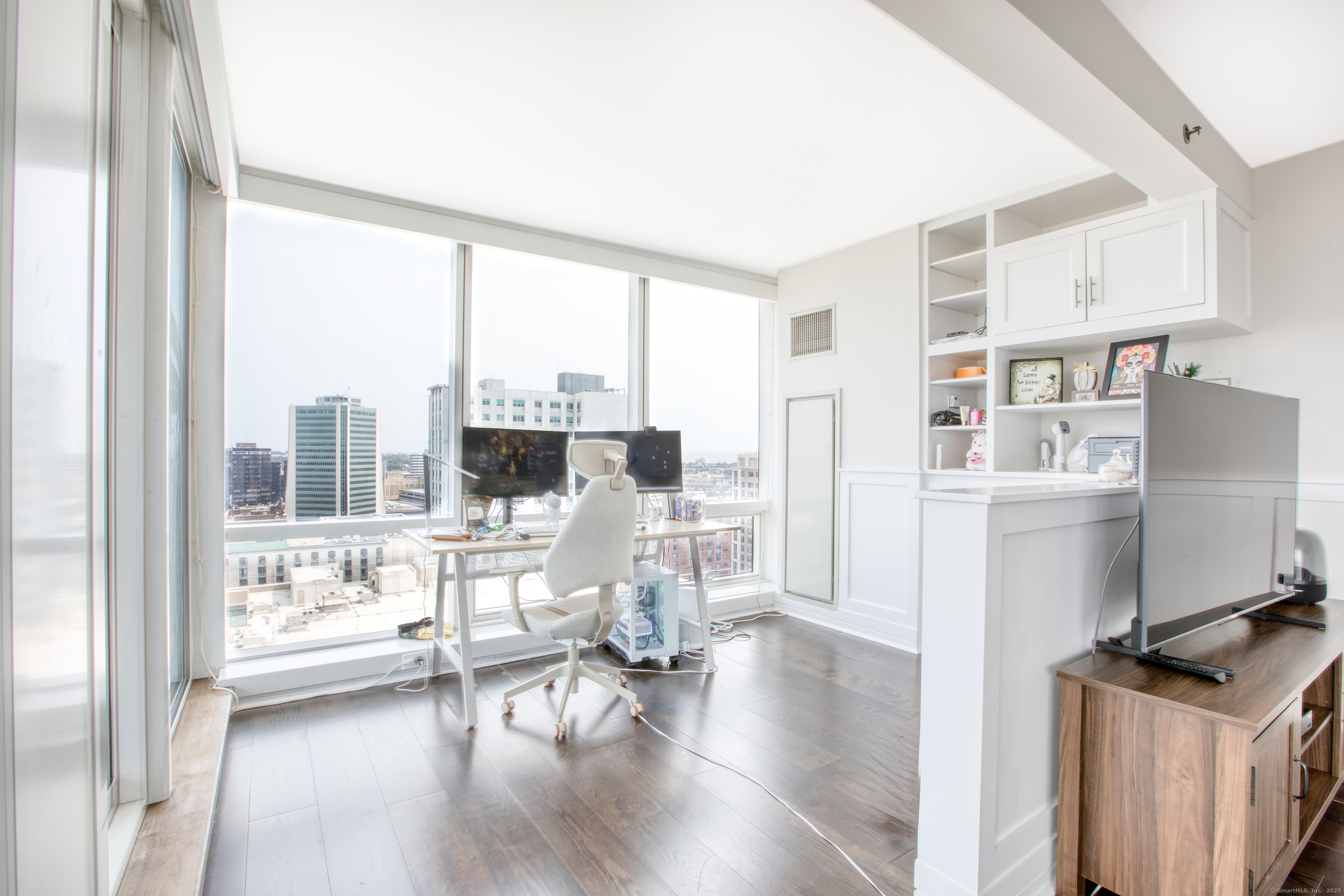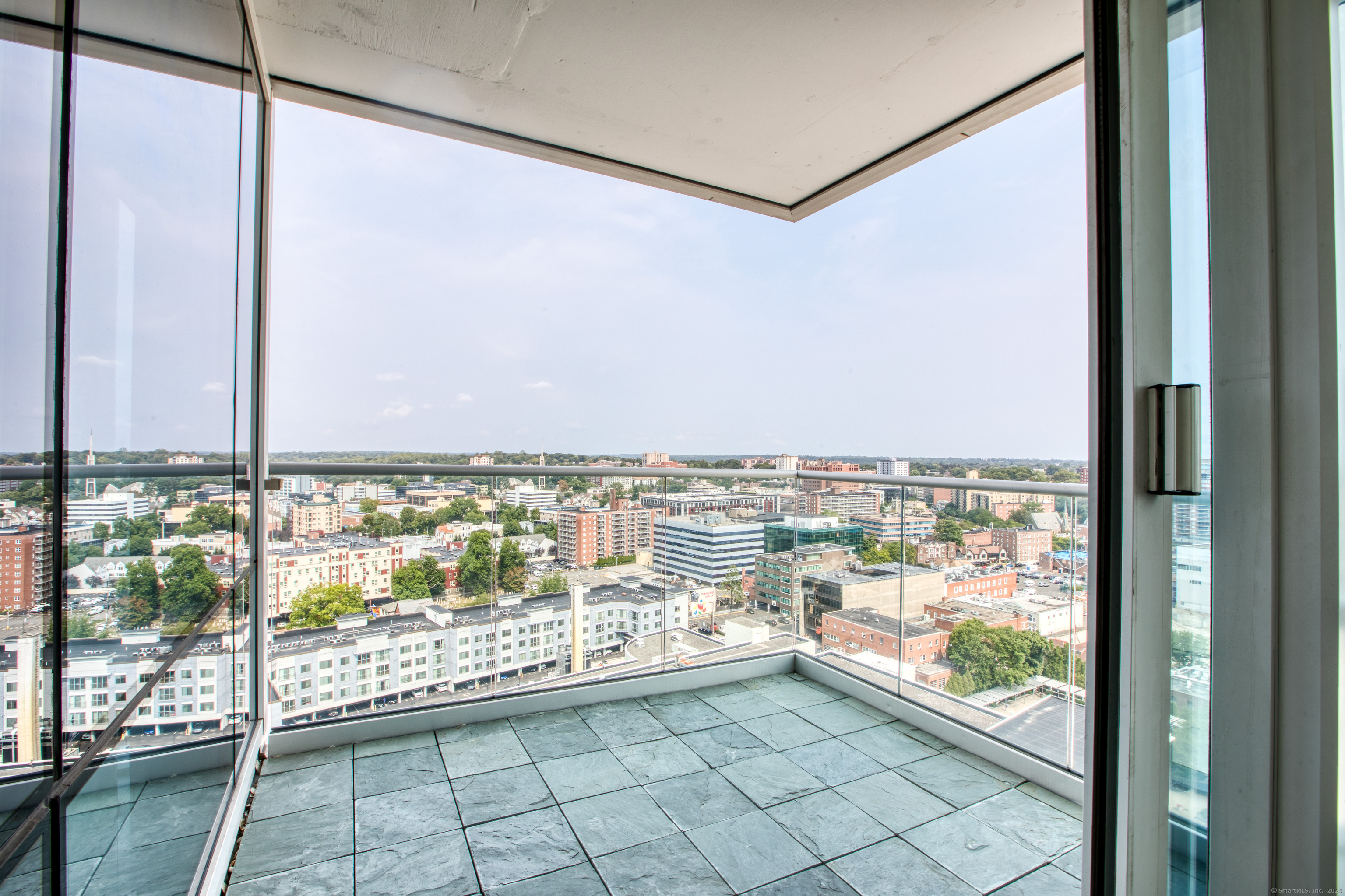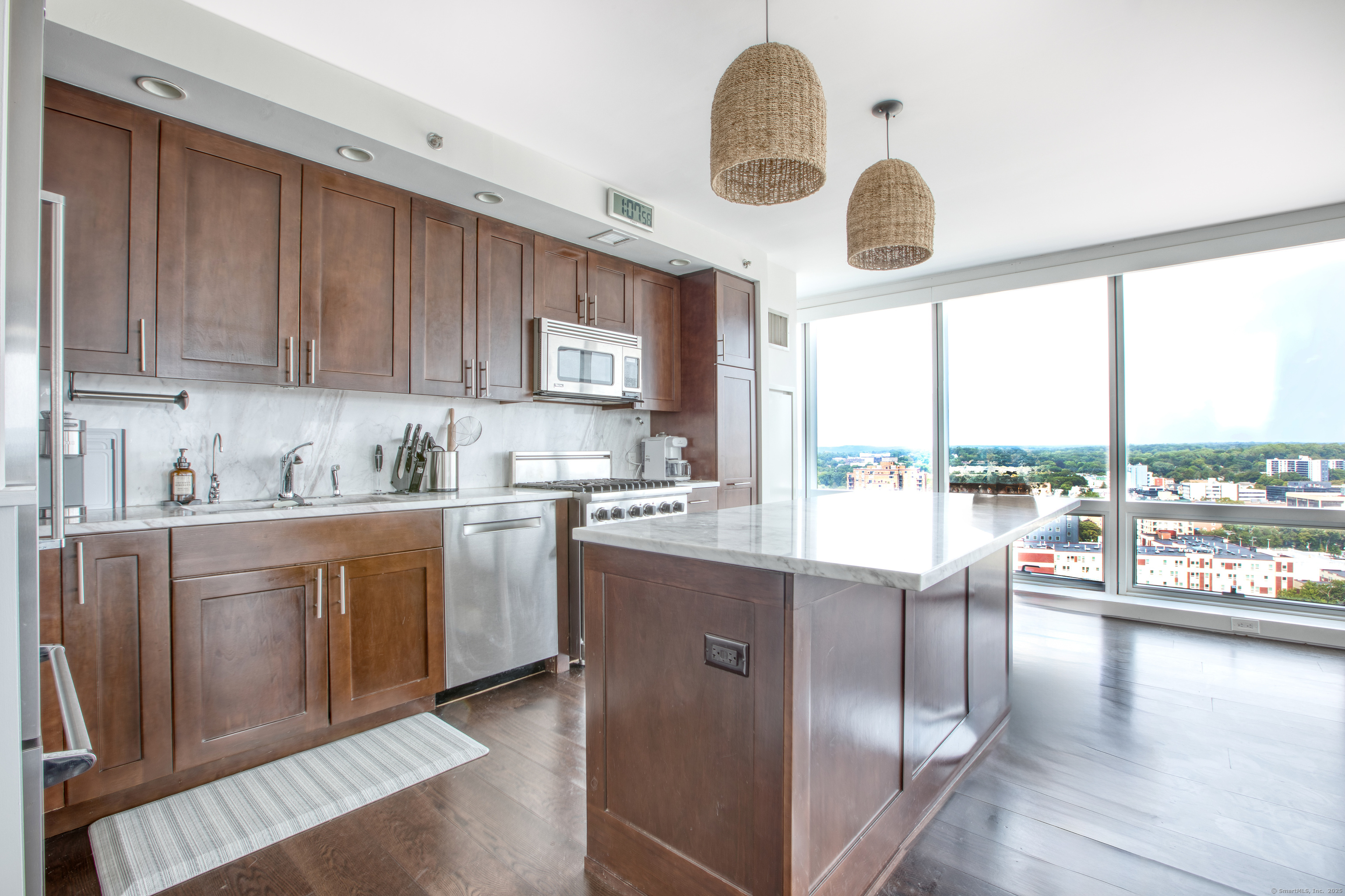 Light-filled corner unit on the 19th floor of Park Tower, Stamford's premier luxury condominium. A private balcony showcases spectacular city views, while inside the kitchen is appointed with white marble countertops and backsplash, hardwood floors, an office nook, and remote-controlled blinds. Both bedrooms feature en-suite baths and custom walk-in closets, with an additional powder room for guests. Residents enjoy top-tier amenities including a 24/7 doorman, pool, fitness center, playroom, and more-delivering the ultimate in comfort and convenience in the heart of Stamford. Shuttle service to Metro-North ensures an effortless commute.