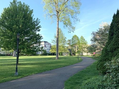 This end unit is unique because it has no shared walls with neighbors. It is a stunning unit with beautiful refinished hardwood floors, lots of windows, high ceilings, fully redone kitchen cabinets, freshly painted, plaster walls, curved archways and pretty views. The parking lot is just steps away. Two spaces are included. Woodside Green is located about a mile from the train station. It is an easy walk to downtown. There is shopping, gym, Starbucks , restaurants just across the street from the complex. The grounds are lovely with specimen trees and a park-like setting.