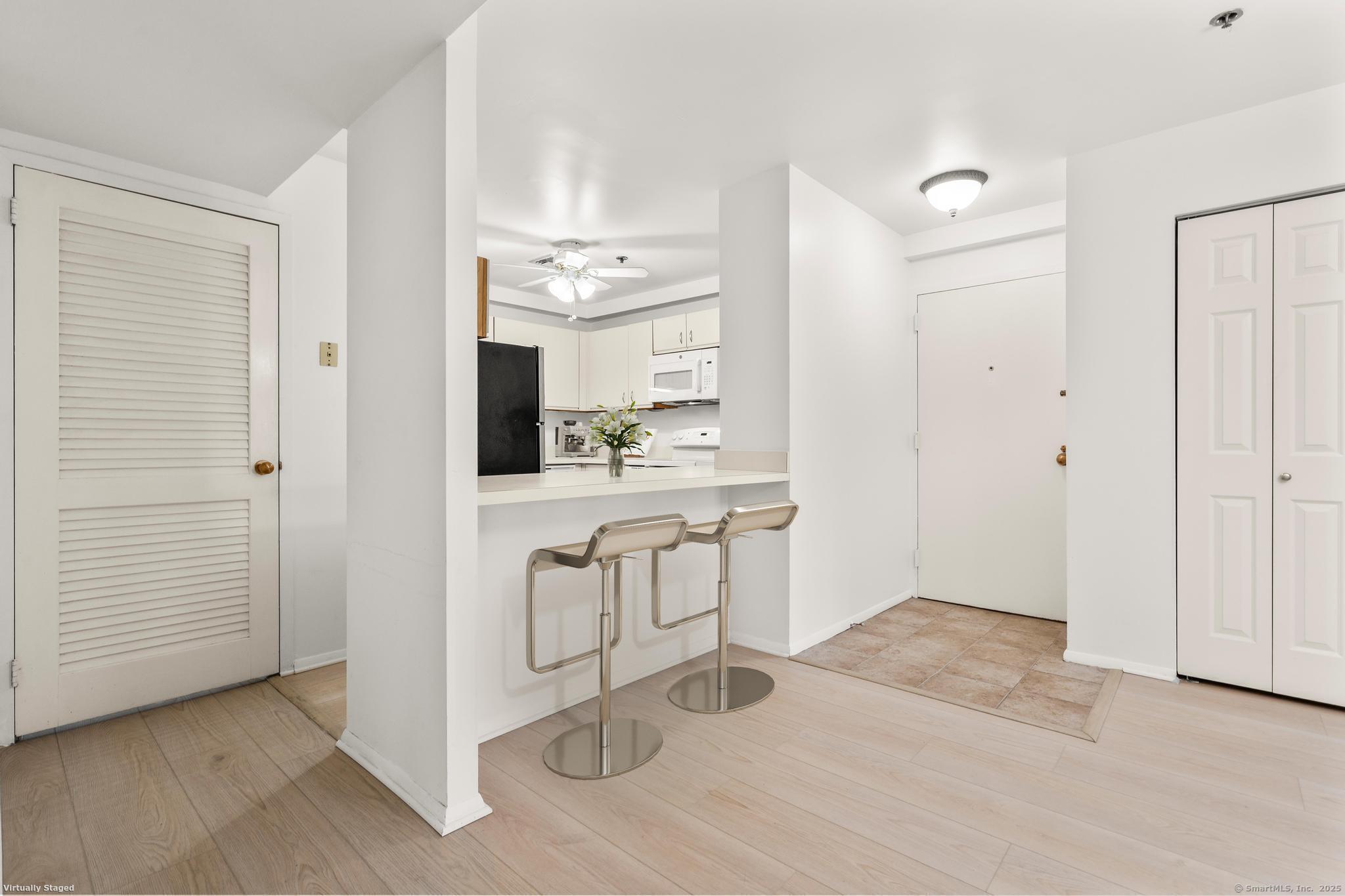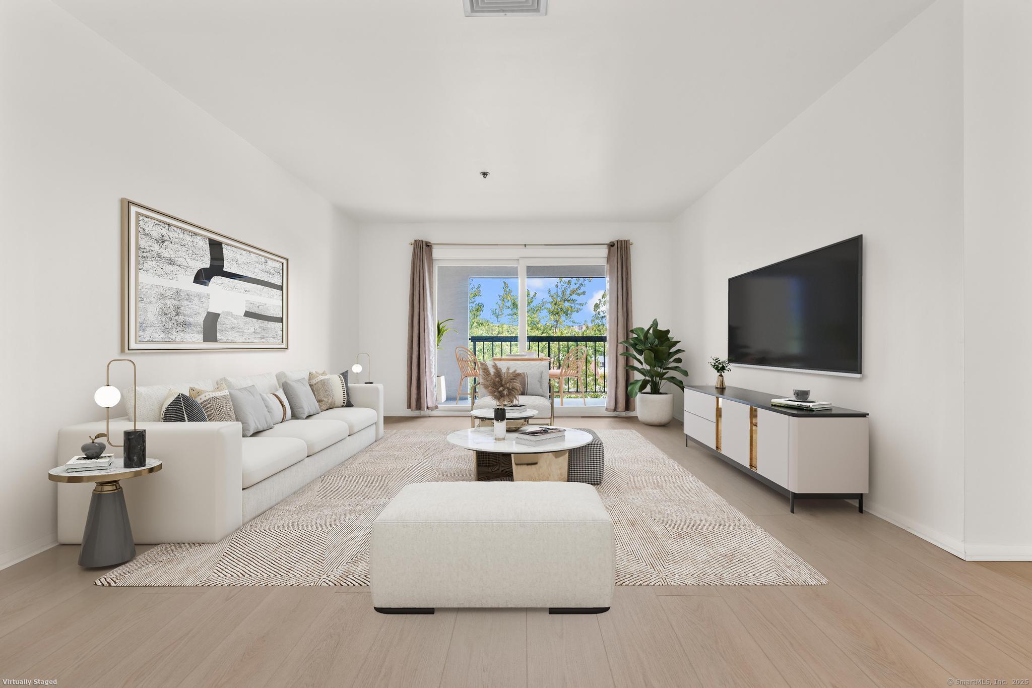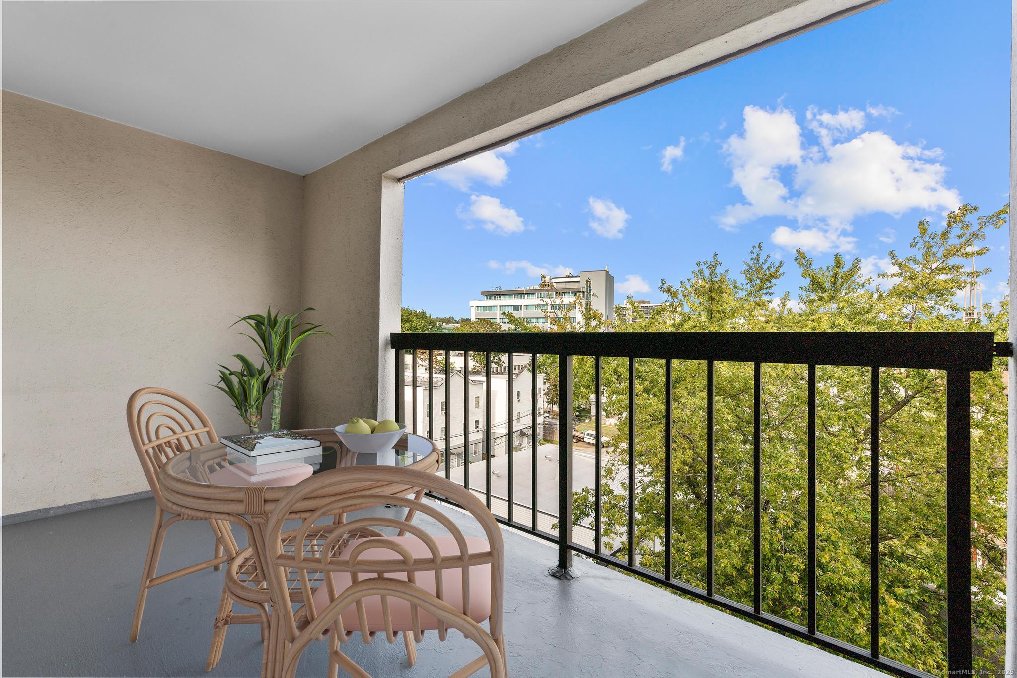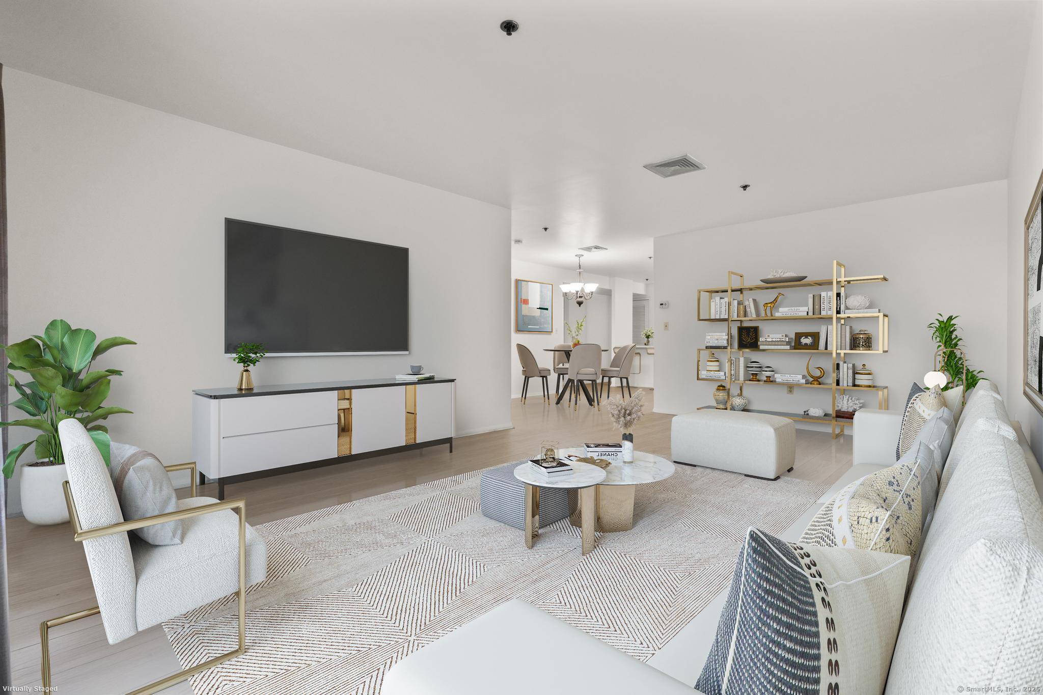 Discover elevated living in this turnkey 2 bedroom 2 bathroom condo perfectly situated in a private building in downtown Stamford. Offering 1,407 square feet of open concept living space, this condo combines comfort, convenience and style with thoughtful updates throughout. Step into a sun-filled oversized living and dining area, with a large slider leading out to a spacious private balcony overlooking the city, the perfect spot to enjoy morning sunrises quietly located in the back of the building, off the street. Back inside, the kitchen features a breakfast bar designed for both entertaining and everyday living. Luxurious primary bedroom features an en-suite bathroom and a walk in closet. Second bedroom is oversized w/ ample closet space. A second full bathroom serves the second bedroom and guests with ease. Features include a newer HVAC system, a newer hot water heater, all new flooring & in-unit full size laundry. Residents of this well maintained elevator building enjoy outstanding amenities including a state of the art fitness center w/ sauna and two parking spaces with one reserved garage spot and an additional covered space on a first come first serve basis. Located just steps from downtown Stamford, Mill River Park, Scalzi Park, shopping, dining, entertainment & the train station, this home delivers the perfect combination of luxury and convenience.
