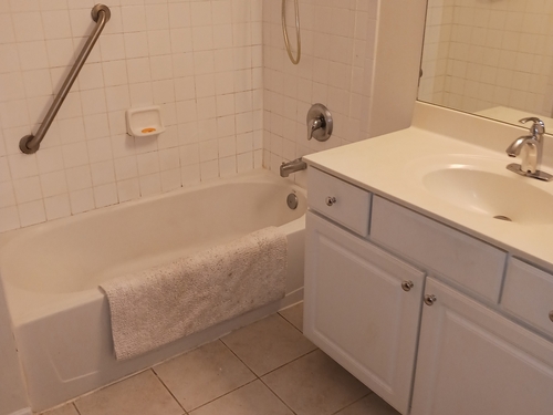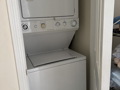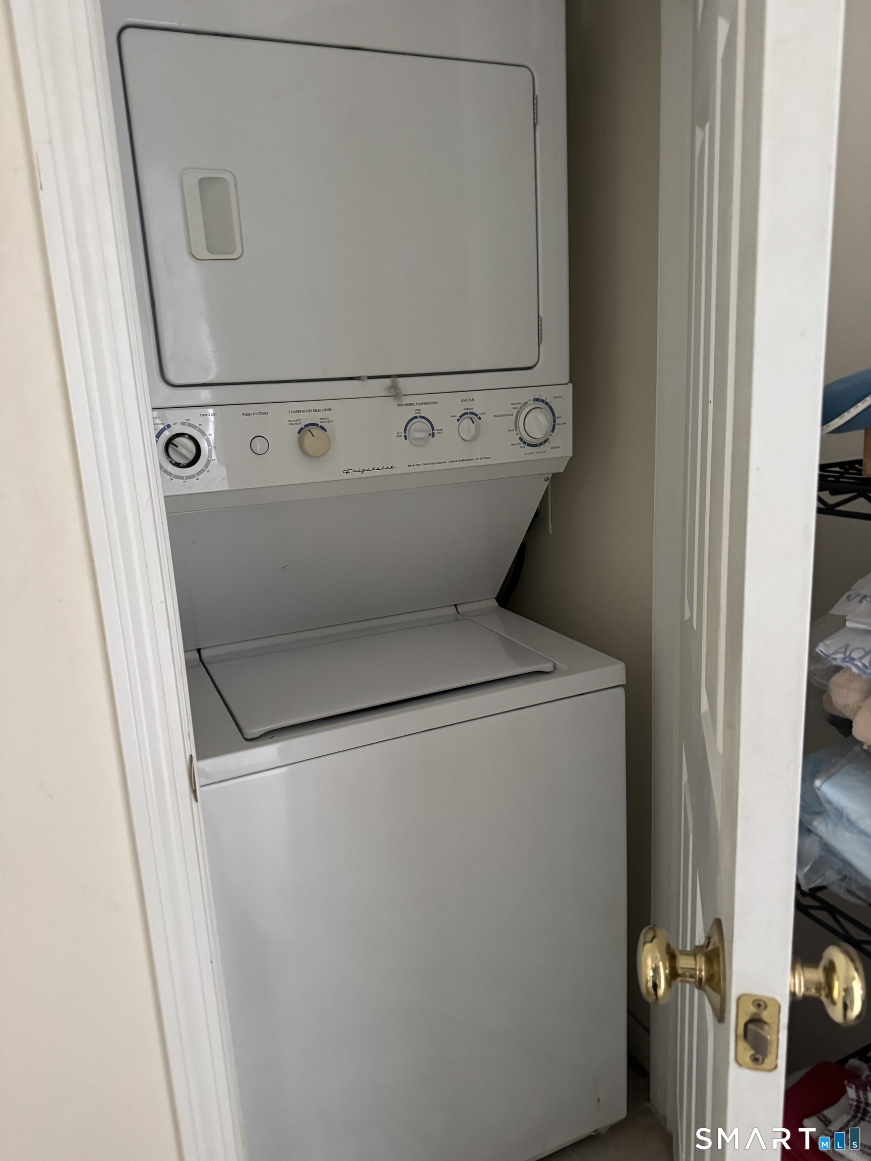 Top-floor condominium with a den, private balcony, in-unit laundry, central air, and covered garage parking. The Wall Street district is currently undergoing active redevelopment, and nearby construction is visible from the unit. Interior features include an open living/dining area, a primary bedroom with a full bath, and an additional half bath. Built in 2004 and professionally managed. Steps to dining, transportation, and area amenities.