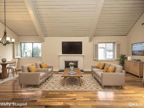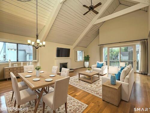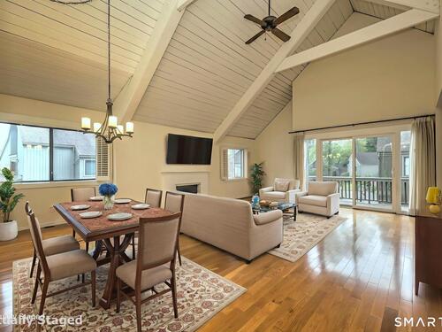 Vaulted Ceiling, Balcony/Deck, Ceiling Fan, Gas Log Fireplace, Sliders, Hardwood Floor