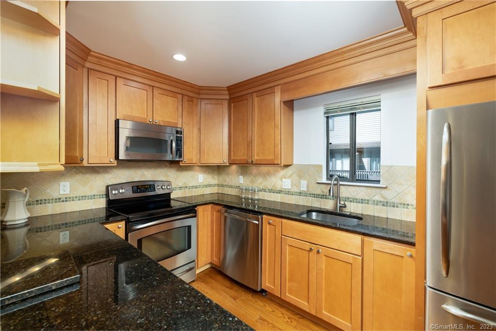 Experience modern comfort and style in this spacious ranch-style condo, perfectly situated in a sought-after gated community in mid-city Stamford. With a prime central location, two sparkling pools, and thoughtful updates throughout, this home stands out as an ideal residence or smart investment. Sunlight pours into the open-concept living area, flowing seamlessly into the dining space and updated kitchen. The kitchen impresses with granite countertops, stainless steel appliances, and timeless design-perfect for cooking and entertaining alike. The expansive bedroom offers calm and comfort with two oversized closets, while the renovated bathroom delivers a spa-inspired retreat. Gleaming hardwood floors and freshly painted walls create a bright, move-in-ready setting that feels both elegant and inviting. Enjoy ultimate convenience with in-unit laundry, generous storage, and a massive crawlspace beneath the unit for all your extras. Step through double sliders from the dining room to a large wood balcony overlooking beautifully landscaped grounds. The Chesterfield is a meticulously maintained, peaceful community offering 24-hour security, lush scenery, and two resort-style pools for relaxation and recreation. Moments from shopping, dining, entertainment, and parks, this condo combines contemporary living with unbeatable convenience. Don't miss the opportunity-schedule your showing today and experience luxury living in one of Stamford's premier gated communities.