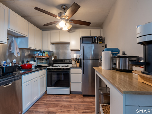 Discover this turnkey studio condo investment at 27 Northhill Street, Unit N5, Stamford, CT 06907, in vibrant Springdale. Built in 1975, this 482 sq ft 5th-floor unit features an open layout with north/east views, natural light via newer windows, parquet flooring, and a modern kitchen with white cabinets, breakfast bar, and appliances (refrigerator, stove, oven, dishwasher, microwave). Building upgrades include new roof and gas heating; heat/hot water in monthly charges. Wall/window A/C, laundry steps from door, elevator, secure entry, in-house gym. Pets: up to 2 household (no dogs). Parking: reserved spot #12 in garage ($45/mo added to $353.53 HOA, total $398.53). Move-in/out fee: $200. Rented at $1,650/mo to reliable tenant eager to stay, offering immediate cash flow. Prime location: Walk Score 76, Bike 60, Transit 42; walk to Springdale Metro-North (1-hr NYC commute), shops, parks, cafes, Mianus River Park; near downtown Stamford, I-95, Merritt Parkway, buses, Bradley Airport (1 hr). Zoned for local schools with private/charter options. Ideal for passive income in appreciating market.