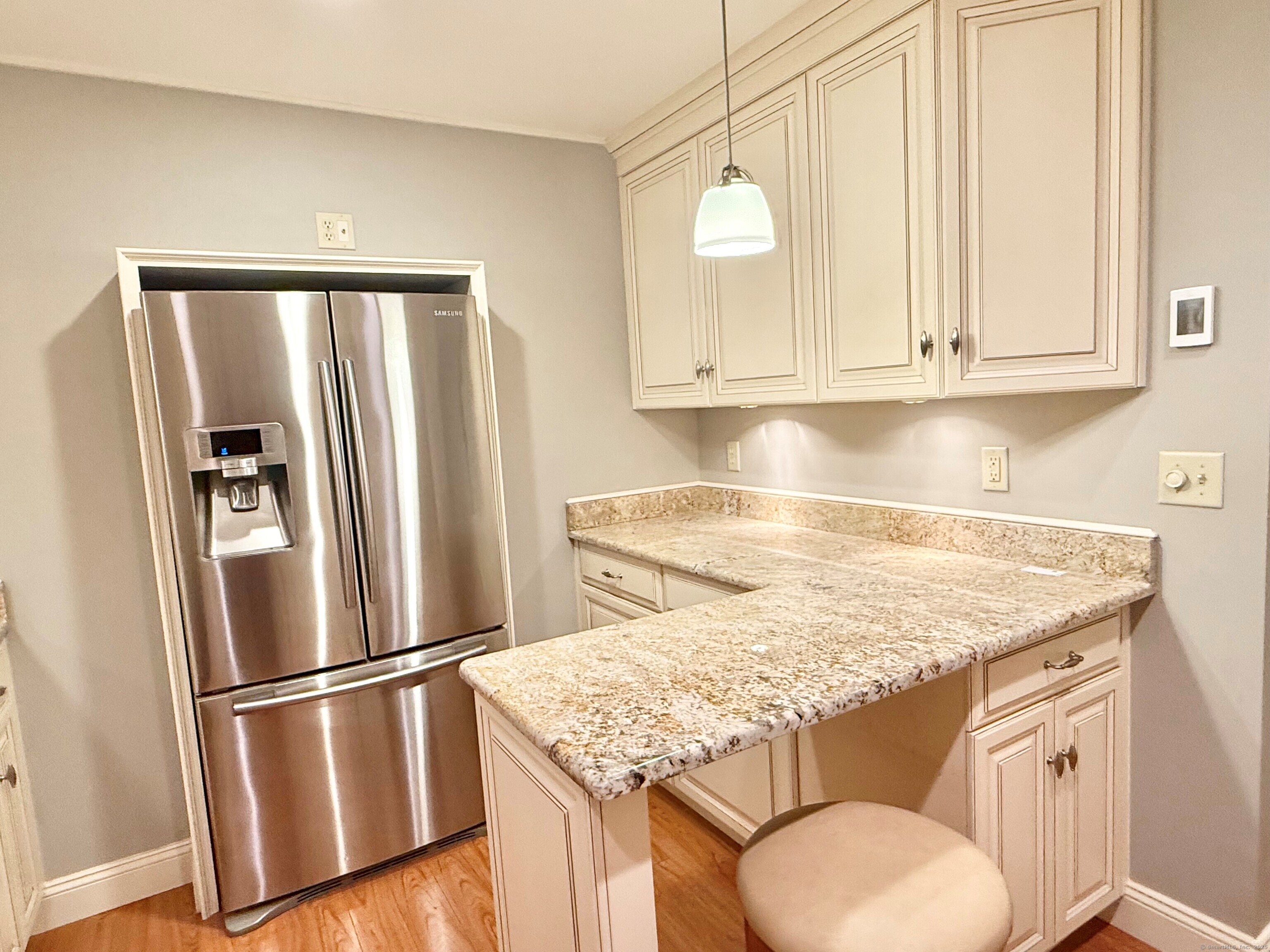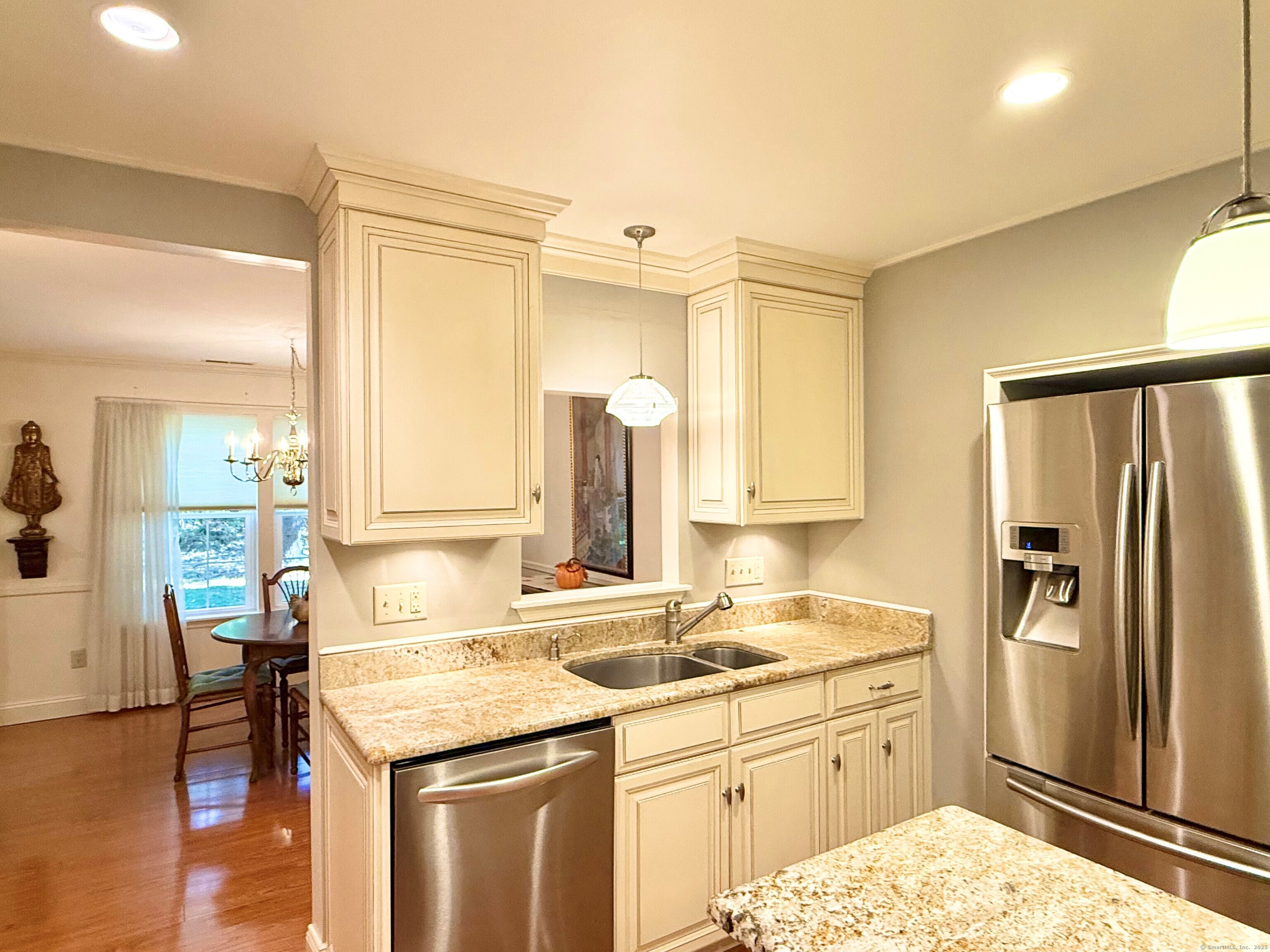 Very rare opportunity "Butler Model " ranch style condo offers a true, one level living space with absolutely no stairs - including the adjoining 2 car garage. Located in the highly desirable Trumbull Town Commons, this 2 bedroom, 2 bath condo offers a most convenience location in a meticulously maintained community. The inviting living room, offers a wood burning fireplace with sliding doors that leads to a patio with a private garden like retreat. A nice size den offers versatile space for a home office or exercise room. The primary suite offers a large walk-in closet with a full updated bath. The second bedroom, also features a walk-in closet and access to the second full updated bath. The stylish kitchen, with newer stainless steel appliances and walk - in pantry, flows into a large sunny dining room. If you are looking for one level, with absolutely no stairs, this might be your new home. Enjoy radiant energy efficent floors in the kitchen, hallway and bathrooms to keep your feet warm! Easy access to the pool, restaurants, highway, shopping. HIGHEST AND BEST BY TUESDAY 10/28 BY NOON.