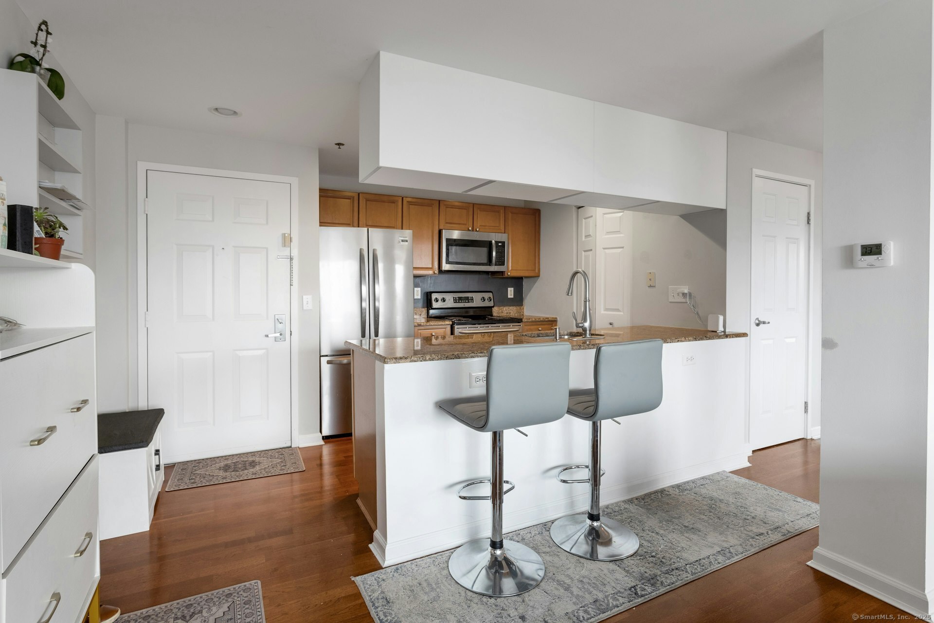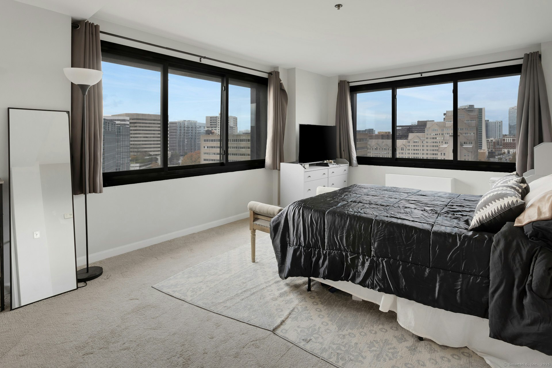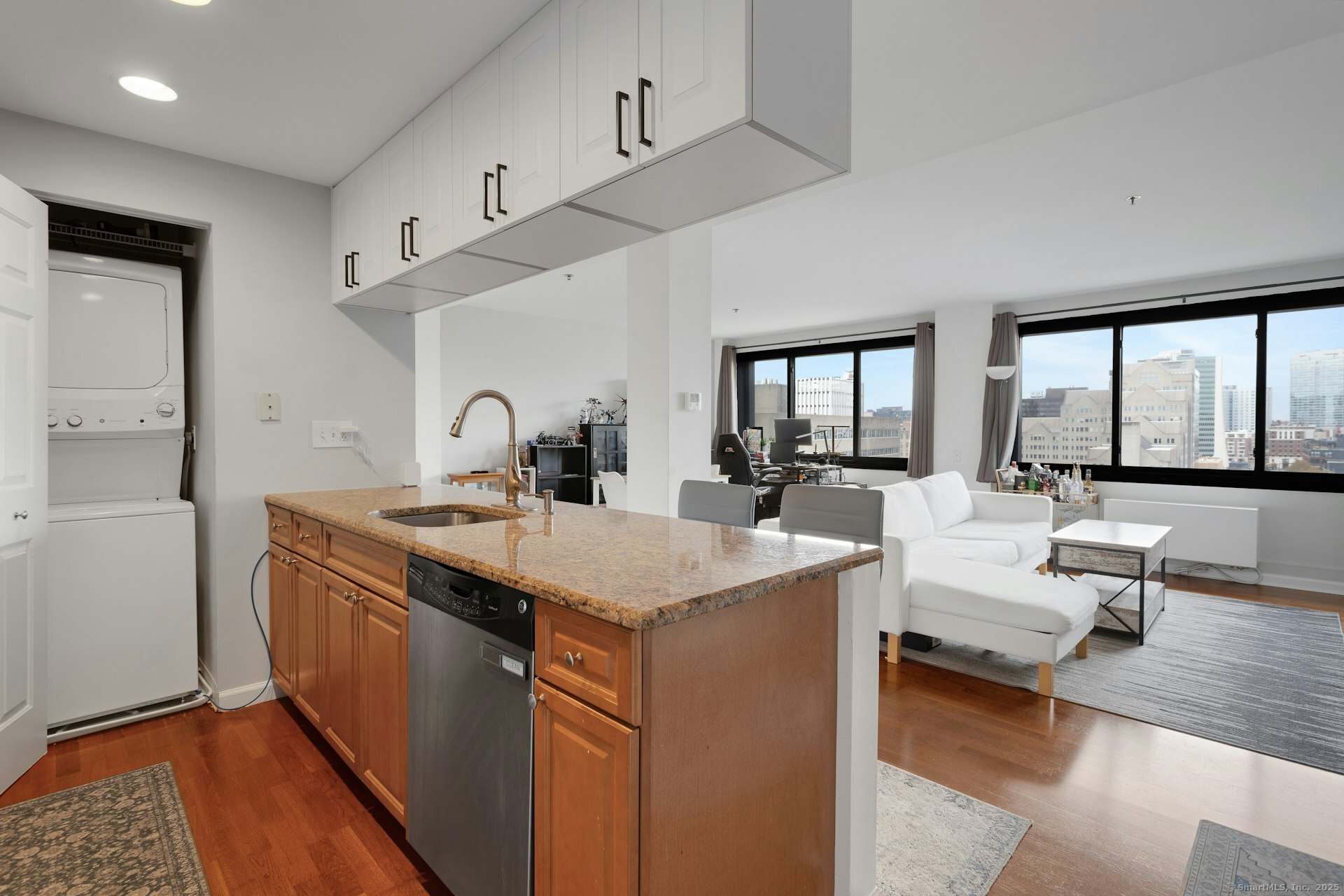 Step into this inviting top floor end unit! Move-in ready two bedroom, two bath currently being used as a large, one bedroom. Wall can be easily replaced, and converted back. This open concept layout is perfect for entertaining with a wall of windows with fantastic city views and natural light. Kitchen with breakfast bar with new overhead cabinets, granite countertops and stainless steel appliances. Ensuite bedroom has two exposures, with distant views of Long Island Sound. Enjoy convenient in-town living located just minutes from trains, highways, shopping, and restaurants. This unit offers the perfect balance of accessibility and comfort. Newer, washer and dryer, all windows replaced in 2023, as well as 2 new heating/AC combo units. The Windemere has secure, reserved garage parking (tandem for two cars), a fitness center, a terrace with BBQ grills, a live-in superintendent and is pet friendly! Whether you're a first-time homebuyer, downsizing, or looking for a great investment property, this condo offers incredible value in a prime location.