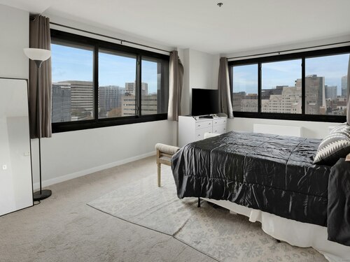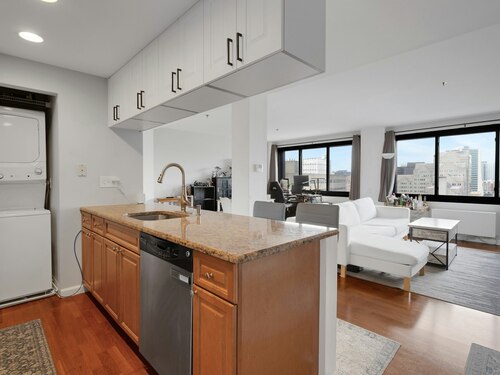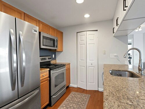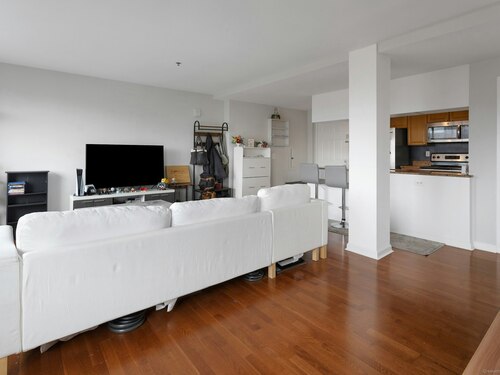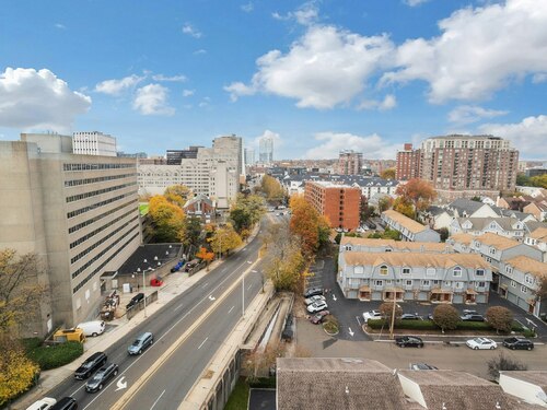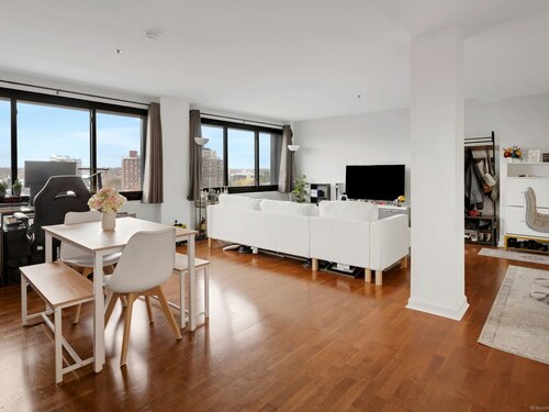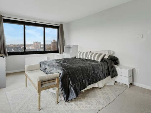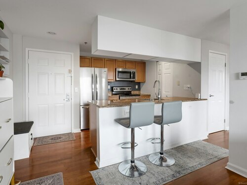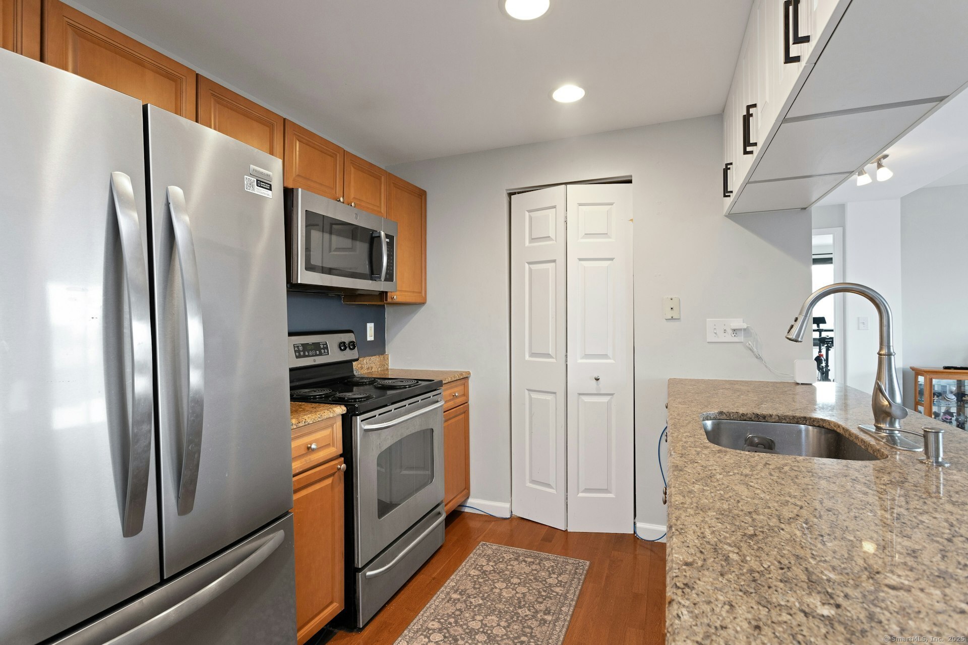 Step into this inviting top floor end unit! Move-in ready two bedroom, two bath currently being used as a large, one bedroom. Wall can be easily replaced, and converted back. This open concept layout is perfect for entertaining with a wall of windows with fantastic city views and natural light. Kitchen with breakfast bar with new overhead cabinets, granite countertops and stainless steel appliances. Ensuite bedroom has two exposures, with distant views of Long Island Sound. Enjoy convenient in-town living located just minutes from trains, highways, shopping, and restaurants. This unit offers the perfect balance of accessibility and comfort. Newer, washer and dryer, all windows replaced in 2023, as well as 2 new heating/AC combo units. The Windemere has secure, reserved garage parking (tandem for two cars), a fitness center, a terrace with BBQ grills, a live-in superintendent and is pet friendly! Whether you're a first-time homebuyer, downsizing, or looking for a great investment property, this condo offers incredible value in a prime location.
