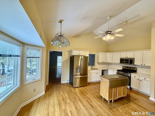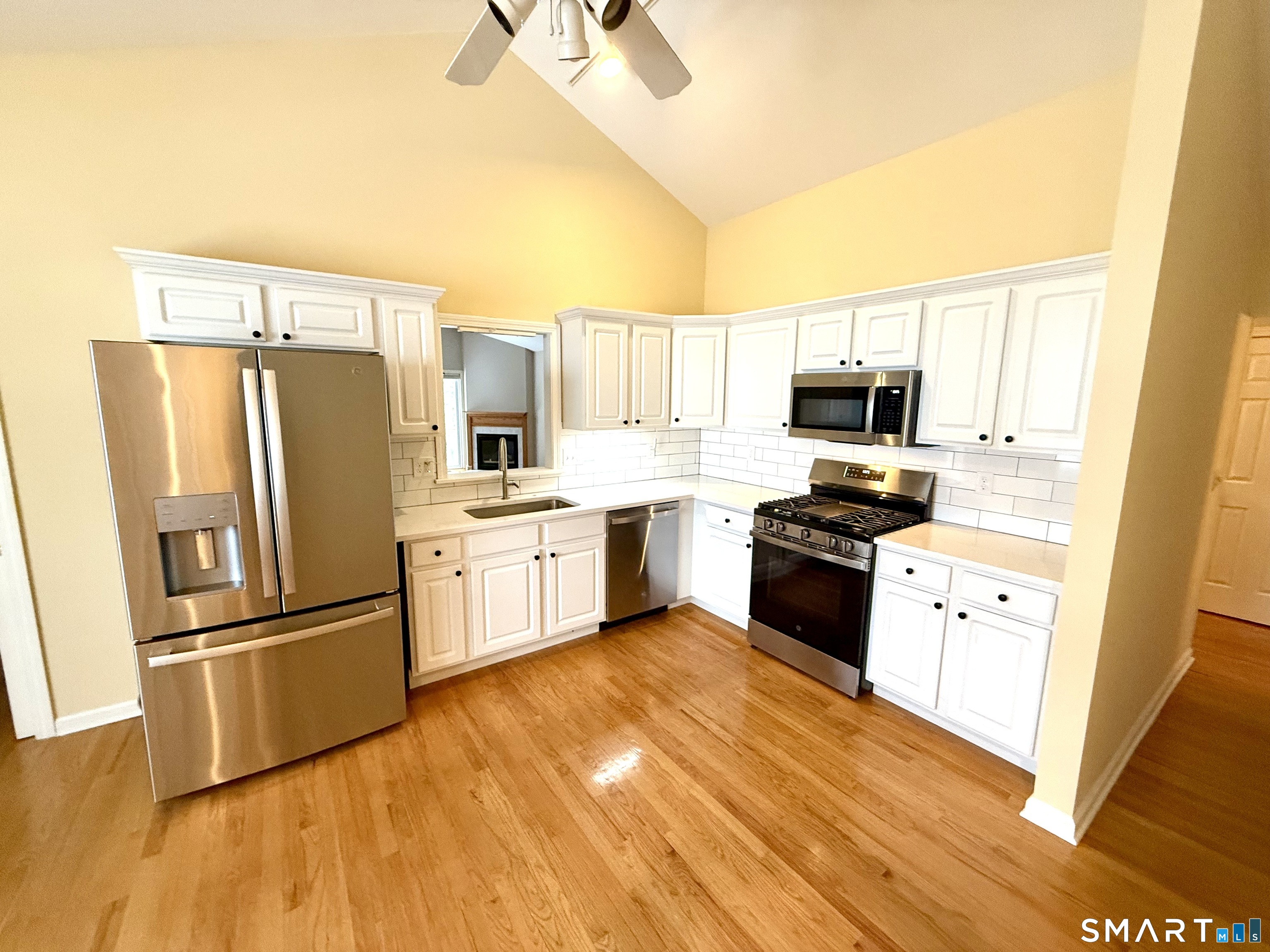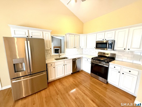 Welcome to Greystone on the Lake, a highly sought-after community offering stunning, one-level living at it's best. This elegant ranch, end unit, features convenient entry with only a few steps from both the attached 2-car garage and front door. The open floor plan showcases soaring volume ceilings, gleaming hardwood floors, clean neutral interior paint, and newer carpeting in all bedrooms. The beautifully updated kitchen features new granite countertops, new tiled backsplash, new sink faucets, new gas oven range, new dishwasher, new microwave, and newer refrigerator. The spacious primary suite offers abundant closets and a luxurious bath with whirlpool tub, walk-in shower, and double-sink vanity. Enjoy peaceful, wooded views from the private deck accessed through sliders from the living room. The living room also has a recently commissioned custom oak trim surrounding the gas fireplace. Main level laundry includes both washer and dryer. A huge walk-out basement provides exceptional storage or future living space. Quiet cul-de-sac location with a short walk to the pool completes this exceptional offering. Please read agent to agent remarks prior to submitting an offer.