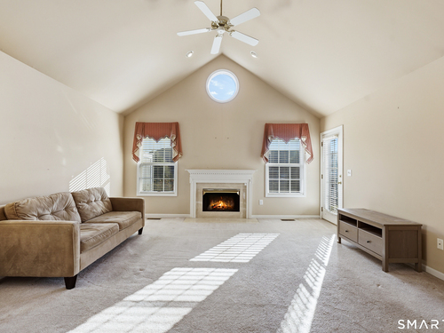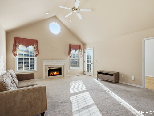 Living Room (Main Level)Vaulted Ceiling, Balcony/Deck, Gas Log Fireplace, Wall/Wall Carpet