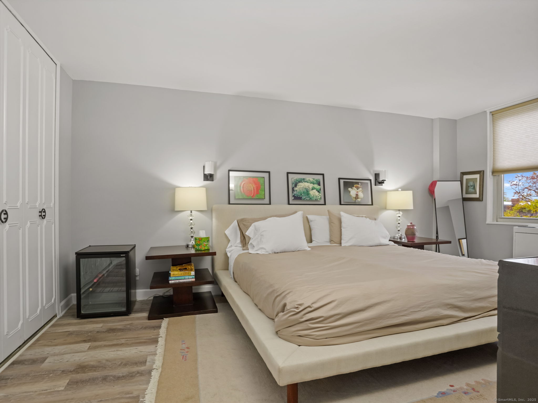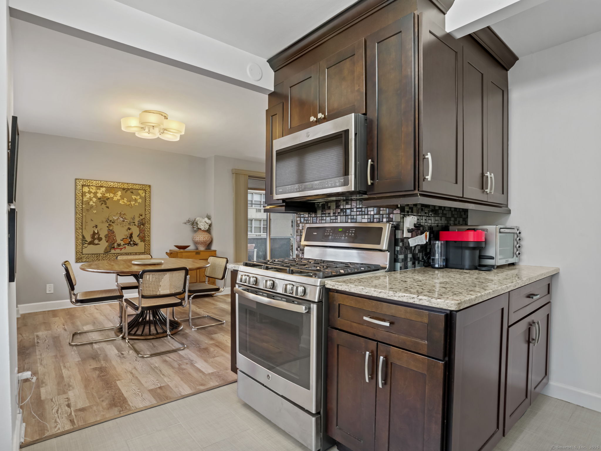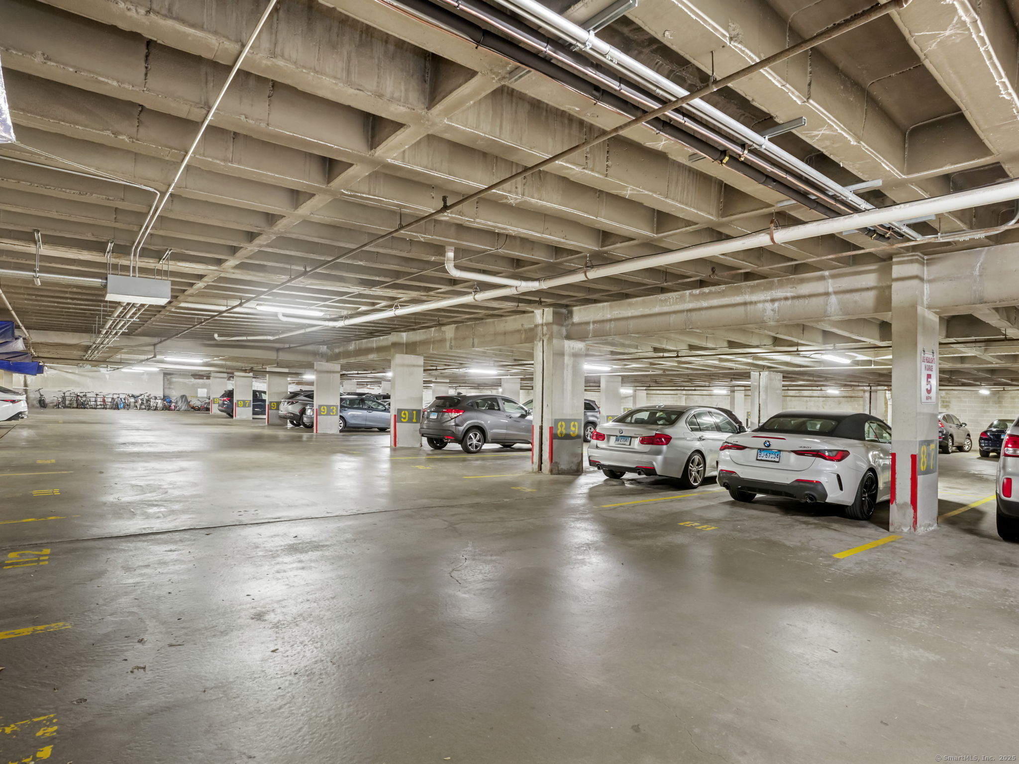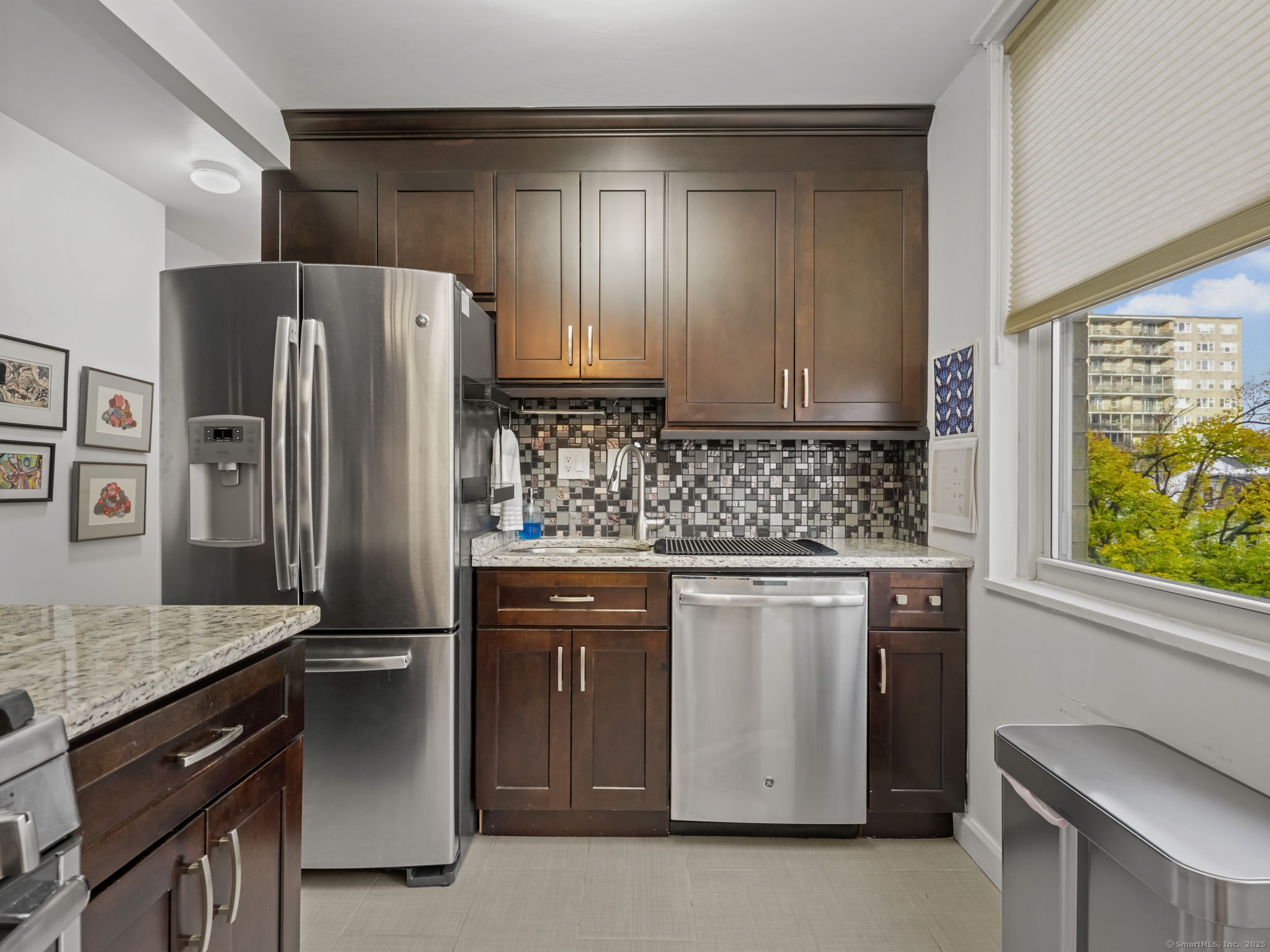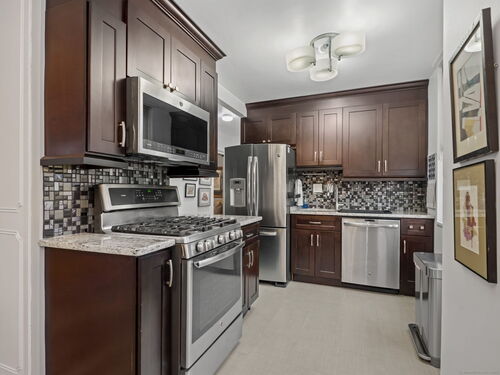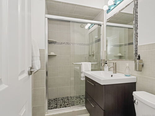 Elegant and light-filled corner residence offering over 1,200 square feet of refined living space. This beautifully updated two-bedroom, two-bath condominium features a sophisticated open-concept layout with a renovated kitchen showcasing granite countertops and stainless-steel appliances that seamlessly flow into the spacious living and dining areas. Numerous windows capture multiple sunlit exposures and open to an oversized screened-in balcony-ideal for morning coffee. The serene primary suite includes a renovated en-suite bath and generous closets, complemented by a second bedroom with walk-in closet and a second renovated bath. Residents enjoy a well-appointed fitness center with sauna, assigned garage parking, abundant guest parking, storage unit and a prime location just 1 mile from downtown Stamford's shopping, dining, and transportation. A perfect blend of comfort, convenience, and understated luxury.