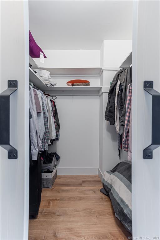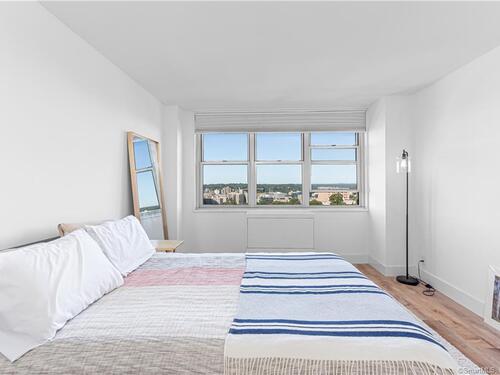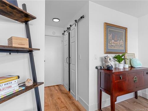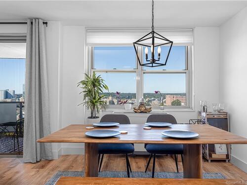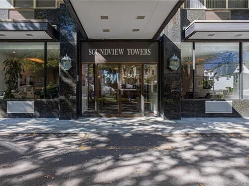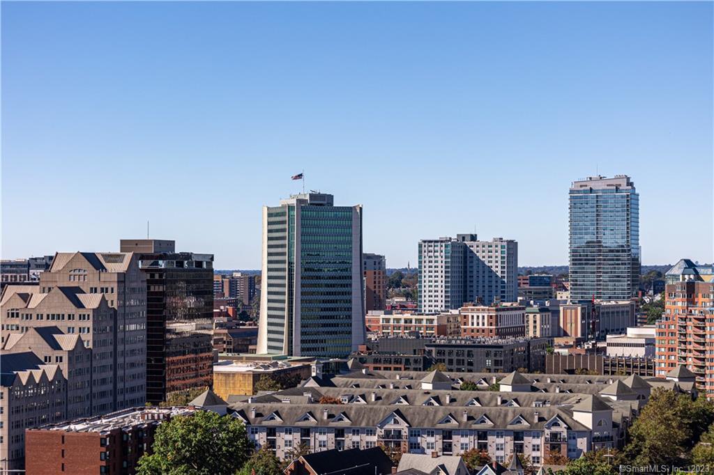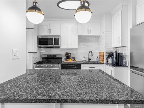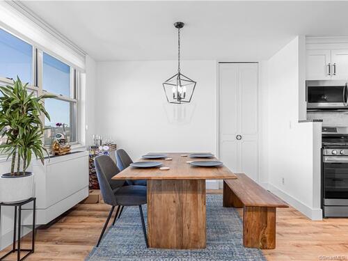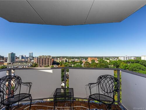 Welcome to life at the TOP of Soundview Towers! The majestic views of the Stamford skyline and the dazzling sunsets from the balcony of the 16th floor penthouse are unparalleled. This oversized one bedroom condo has been tastefully and fully renovated and modernized. The open concept living room, kitchen, and dining room provide a lovely spacious feeling. The new kitchen with white cabinets, unique blue hued granite countertops, and complimentary backsplash adds a tasteful aura to the space. Culinary delights are prepared on all new stainless-steel appliances with gas range. There is a huge & bright master bedroom with a barn door walk-in closet and a beautiful view of the city. Unlike many condos, there is ample room for storage with five closets including two walk-in. The new floors throughout aesthetically bring the space together. The bathroom has also been totally updated; the imported tiling adds a touch of sophistication. Two new HVAC units assure proper cooling and heating throughout the year. This gem is a model home of convenience and affordability. Soundview towers is a premier doorman building within a short stroll of the fine restaurants of downtown Stamford and its energetic night life. For those commuters, I-95 and the Stamford train station are just minutes away. The monthly common charges include heat, cooking gas, water/hot water and trash. This sought-after complex has a pool, fitness center with sauna room, covered parking and ample visitor parking.