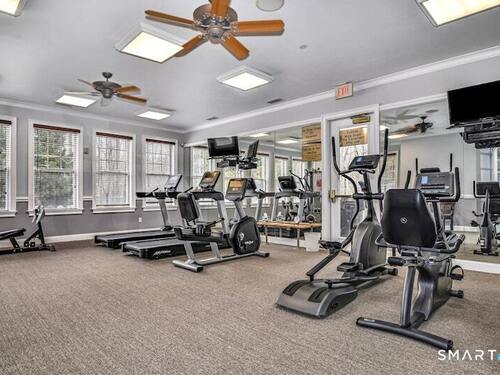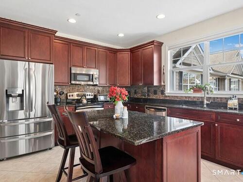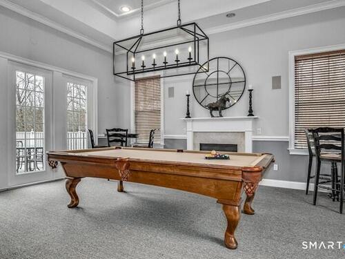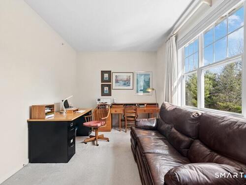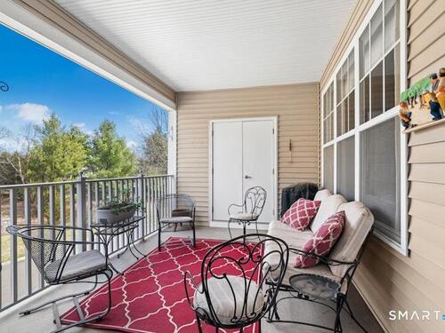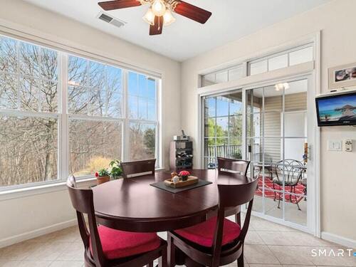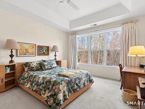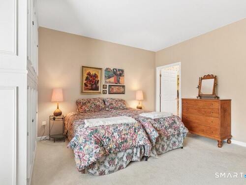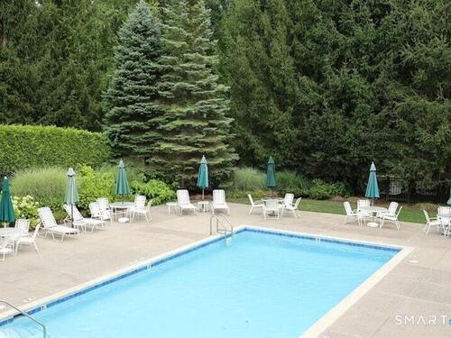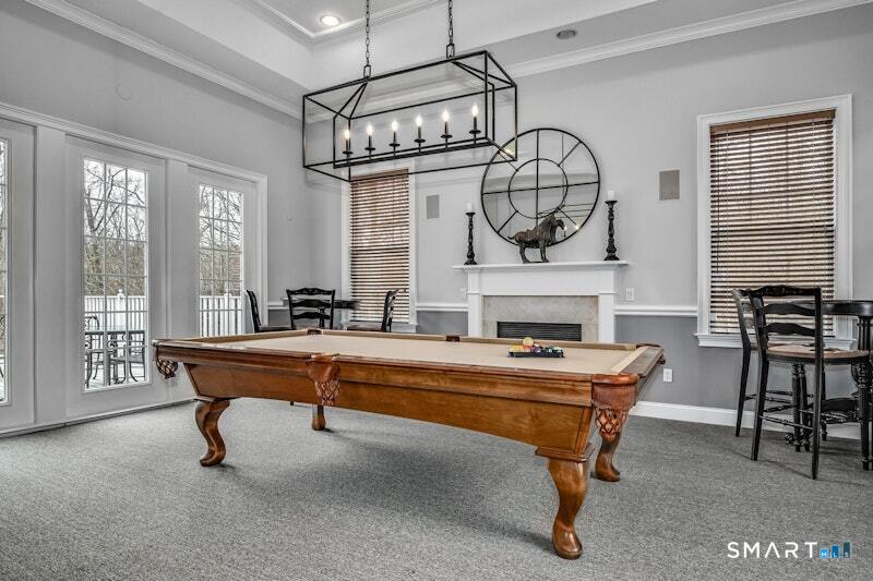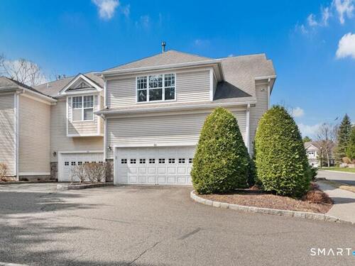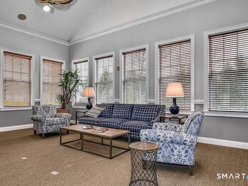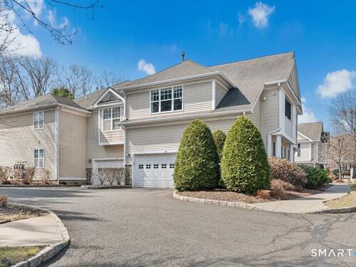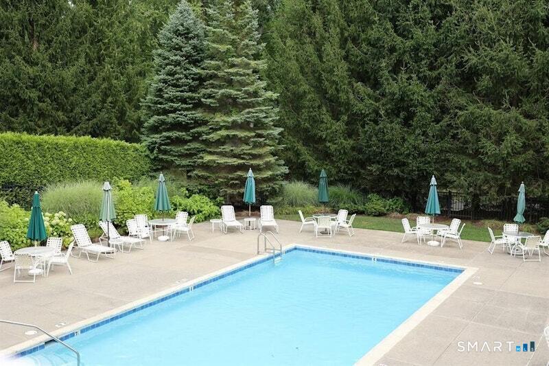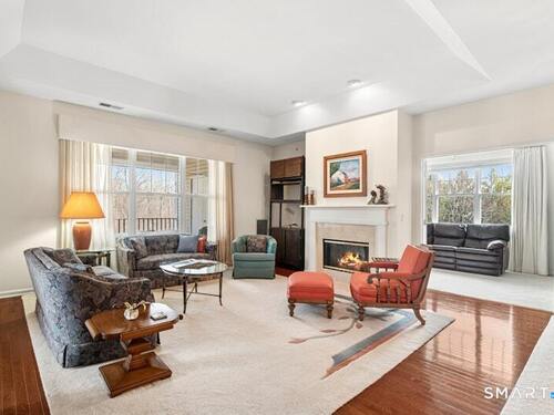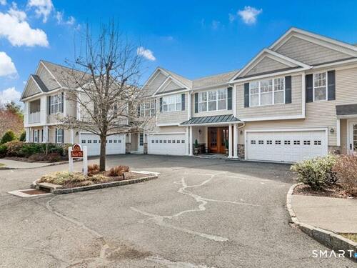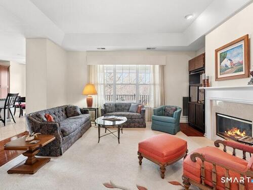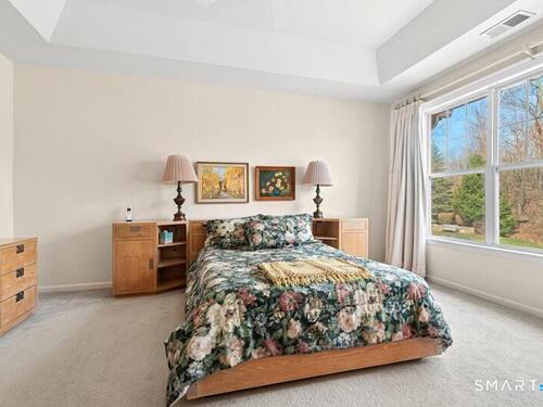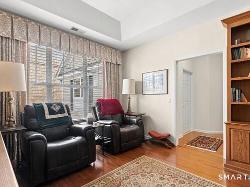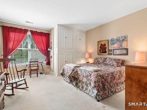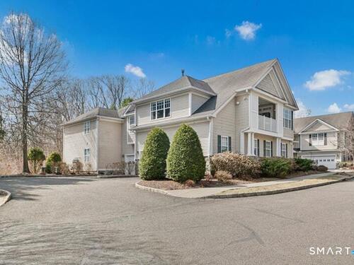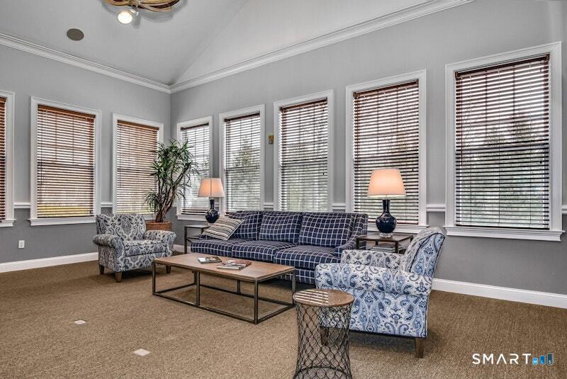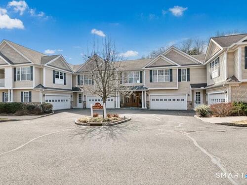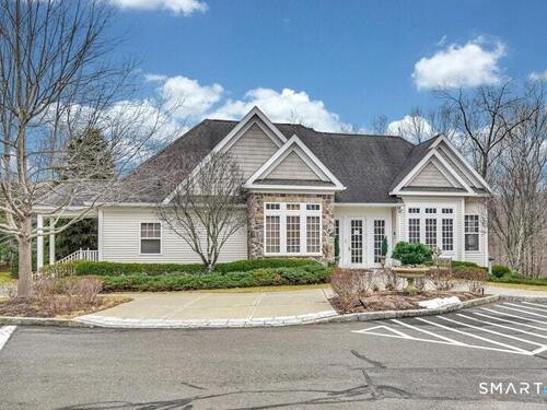 Wonderful opportunity to own this exquisite ranch-style condo in a beautiful 55+ community. This luxurious penthouse unit offers exceptional privacy with no neighbors above or below and is the largest model available, featuring 7 spacious rooms with trey ceilings and custom built-in cabinets and bookcases. The home includes a private primary suite with large walk-in closet and remodeled stall shower, while both bedrooms are ensuite. Additional living spaces include an office and a den. A separate laundry room with linen closet adds convenience. The cherry kitchen features a large island with breakfast bar, granite countertops, newer stainless steel LG refrigerator, built-in desk, and extra pantry cabinets with pull-out drawers. Enjoy a gas fireplace and a covered balcony overlooking peaceful woodland views. The building offers private two-car garages on main level and CCTV intercoms. Residents enjoy a clubhouse with billiard room, social hall with kitchen, fitness center, locker rooms, pool with spa, and outdoor grills as well as putting green and bocce court. Conveniently located near Exits 8 and 9 of I-84.