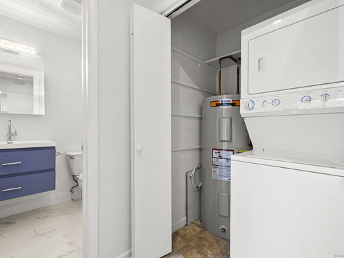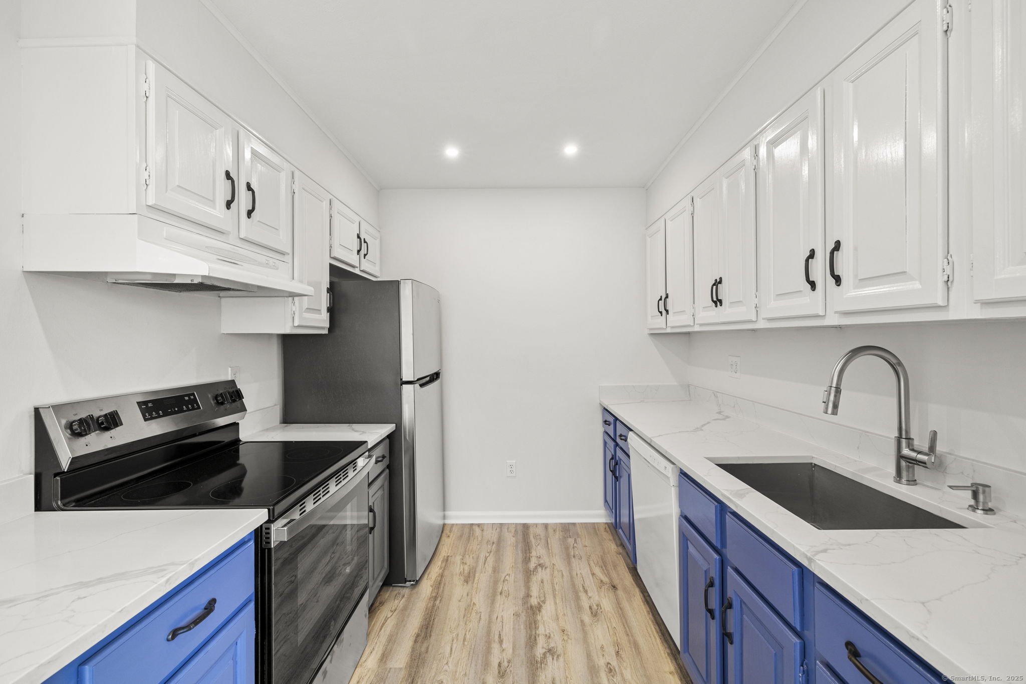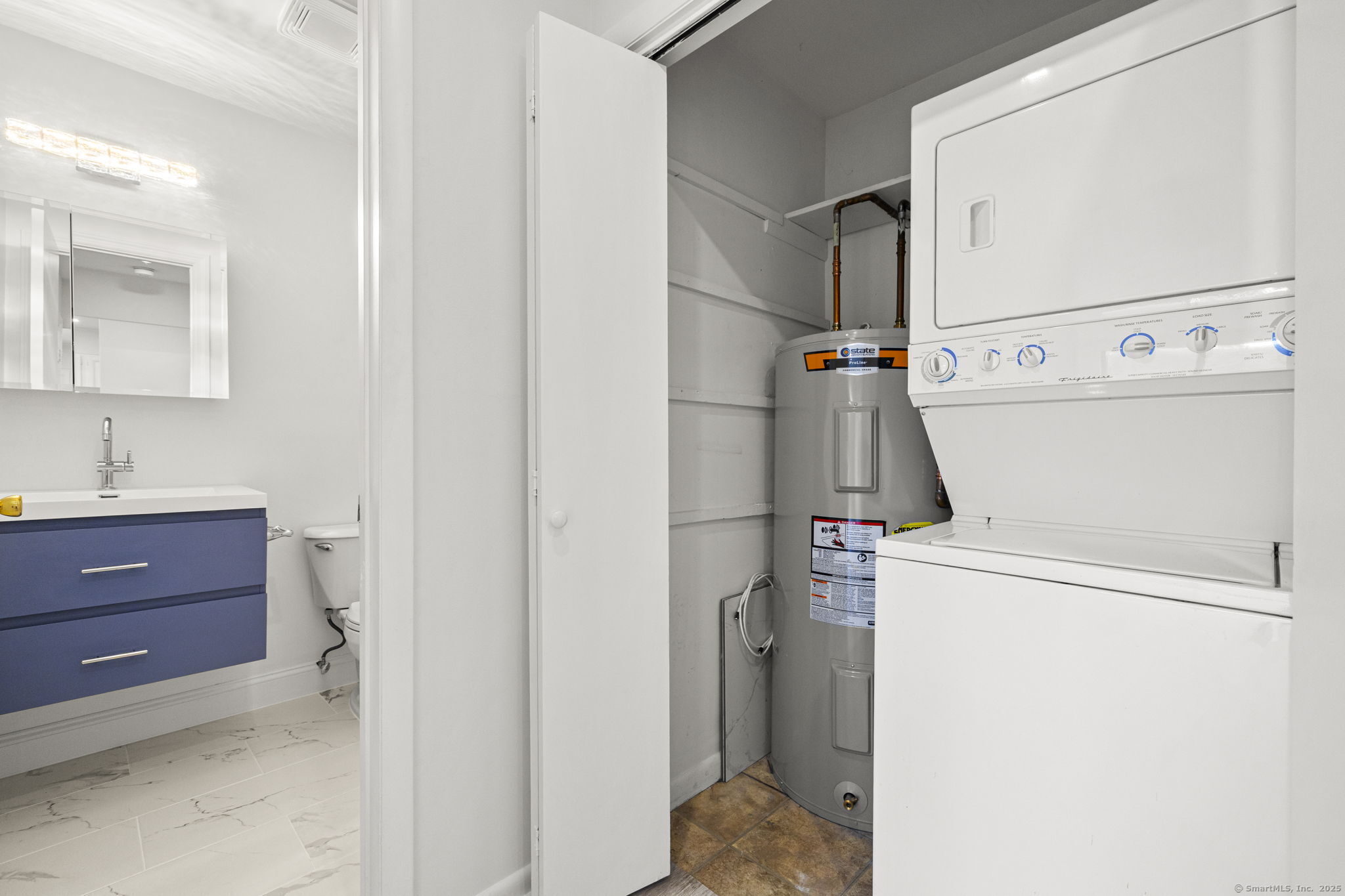 Rarely available end unit with natural light and added privacy. This fully renovated 1-bedroom condo features a modern kitchen, stylish bathroom with walk-in shower, private balcony, and in-unit washer/dryer. Located on the second level, it offers quiet living with no upstairs neighbors. Secure building with reserved parking space and visitor parking. On-site storage facility. Prime location - just a 5-minute walk to: Cove Island Park with two beaches, hiking trails, tennis, basketball, and softball fields, Cove Island Marina with boat slips, Cove Island Wildlife Sanctuary, Terry Conners Ice Skating Rink, Chelsea Piers Athletic Club of Connecticut. Close to shopping, dining, public transportation, and I-95.