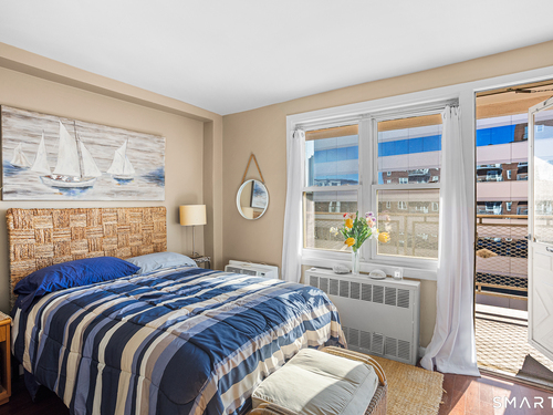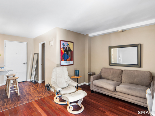 Experience effortless downtown living in this bright and well-designed studio at 700 Summer Street. The open layout features a stylish kitchen with an island perfect for casual dining, seamlessly connecting to a spacious living area with hardwood floors. A separate south-facing sleeping nook opens to a private 6th-floor balcony, where city skyline views and abundant natural light create an inviting retreat. The unit is finished with a modern, immaculate bathroom and generous double closets for storage. This professionally managed building offers sought-after amenities including a secure lobby, elevators, fitness center, and a beautifully landscaped central courtyard. Heat, hot water, and cooking gas are included in the monthly HOA. Ideally located just steps from Stamford's vibrant restaurants, shops, theaters, and UConn Stamford campus, with convenient access to Manhattan by train or car.