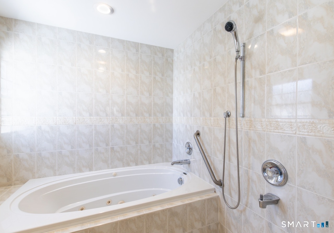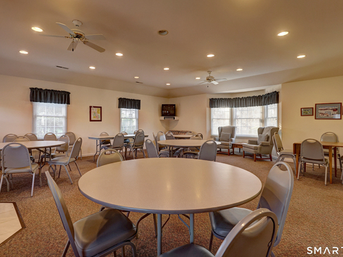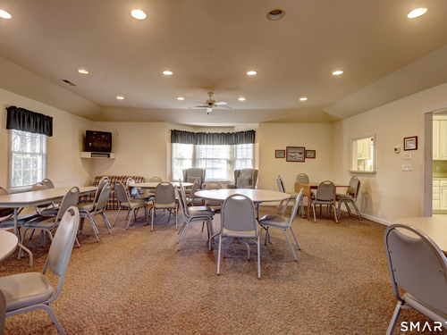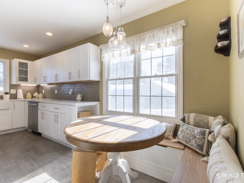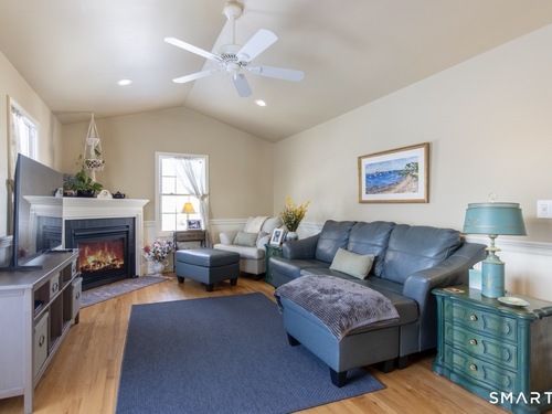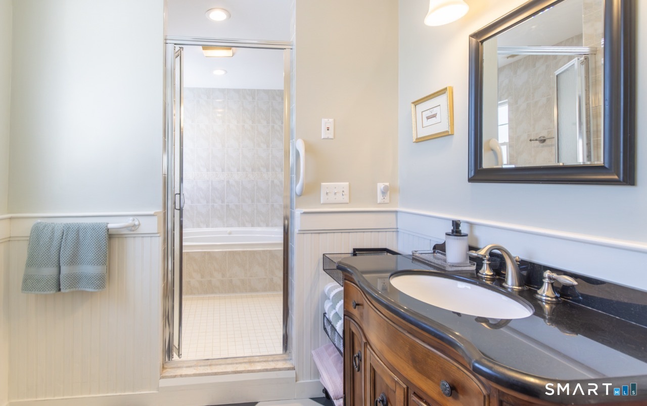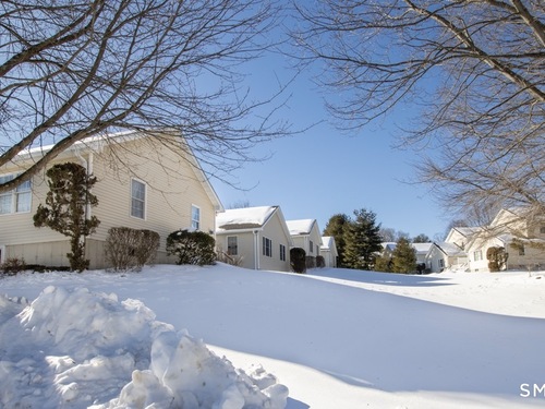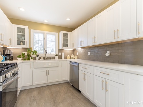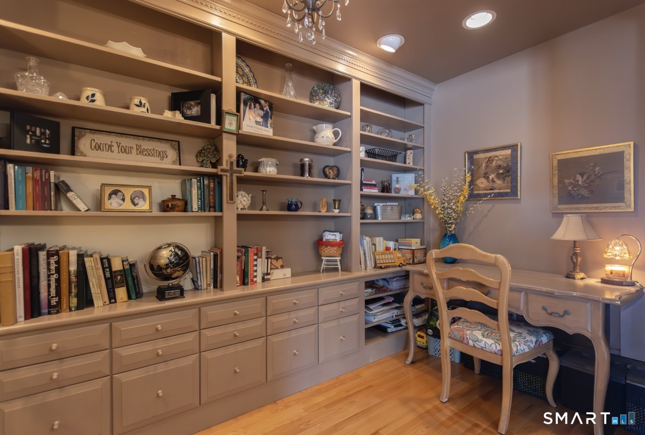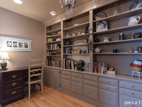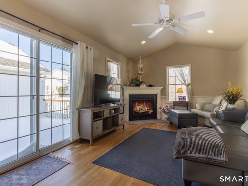 Better than new, this move-in-ready 1st Floor luxury condominium has been beautifully updated and meticulously maintained, featuring hardwood floors throughout the main level, abundant natural light, custom millwork and built-ins, an open floor plan, cathedral ceilings, generous storage, and a living room with a cozy gas fireplace and sliders to a private Trex-style deck overlooking a stunning grassy property framed by classic stone walls and mature trees beyond. The brand-new, fully remodeled kitchen is a true standout, offering all-new flooring, quartz countertops, ceramic farmhouse sink, stainless steel appliances, gas stove, high-end custom cabinetry, and pantry storage. The space is anchored by a charming eat-in area with custom built-in bench seating, creating a warm and inviting spot for casual meals and conversation. The main level includes a spacious dining and living room combination, a library or home office with extensive built-ins, and a primary suite with a full bath featuring both a walk-in shower and whirlpool tub, along with his-and-hers closets. Additional conveniences include a half bath, laundry area, and direct garage access. The finished lower level offers approximately 1,290 square feet (per tax records), providing exceptional space for guests or personal use. This bonus area features new luxury tile flooring, a large family room with full bath, cedar closet, walk-in closet, a rare set of Bilco doors to the exterior-making moving in a breeze.