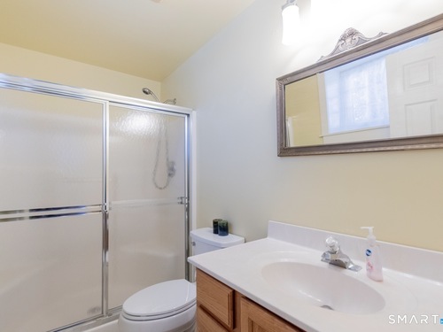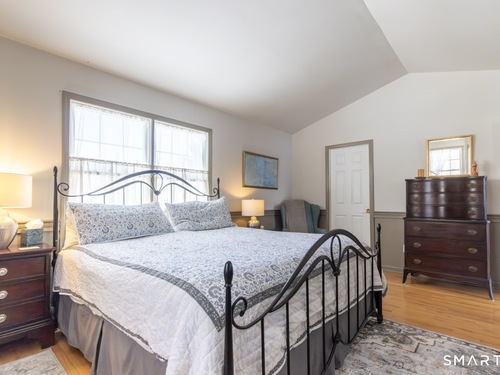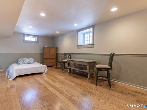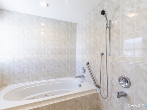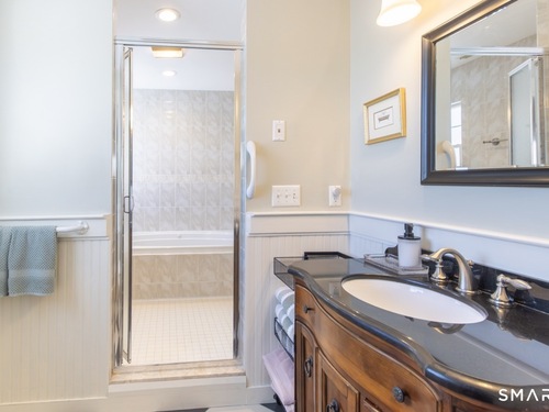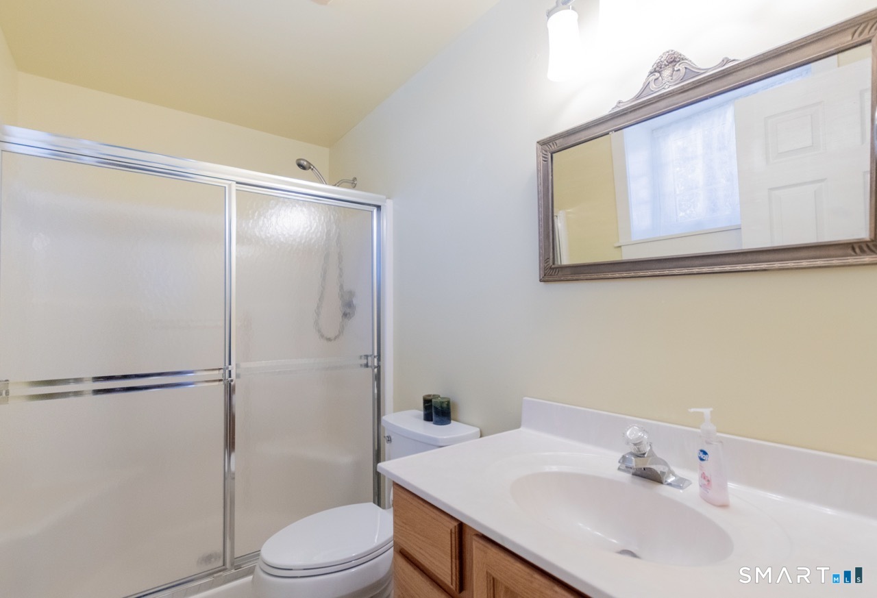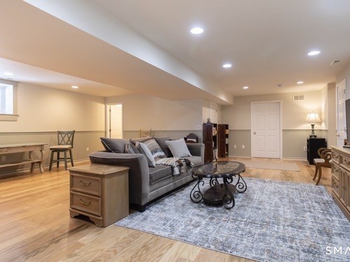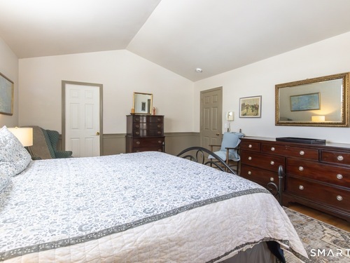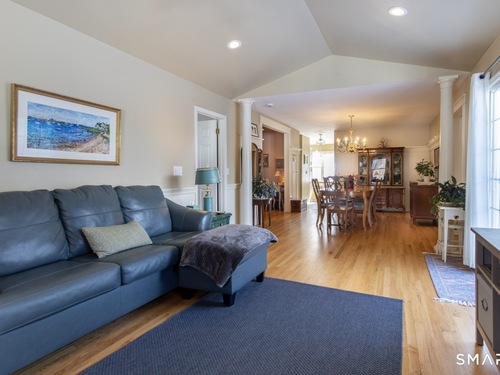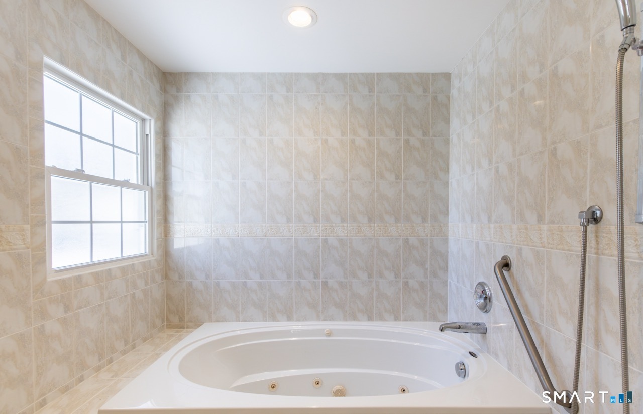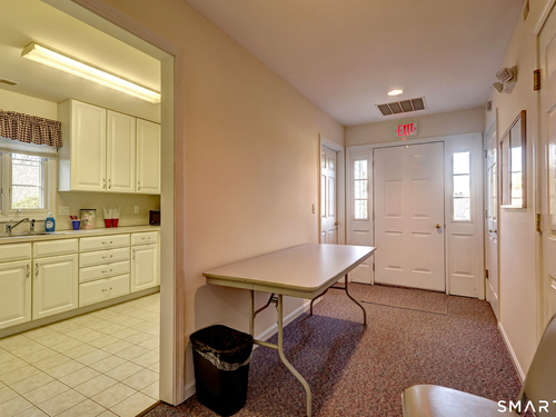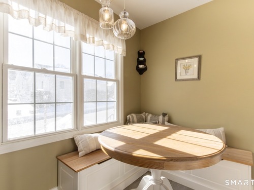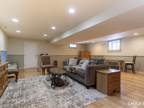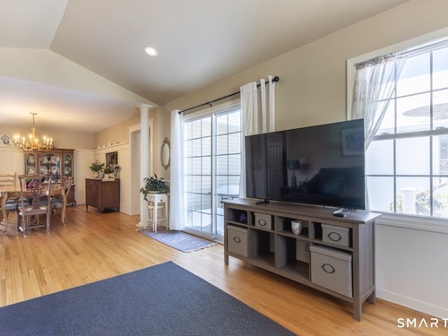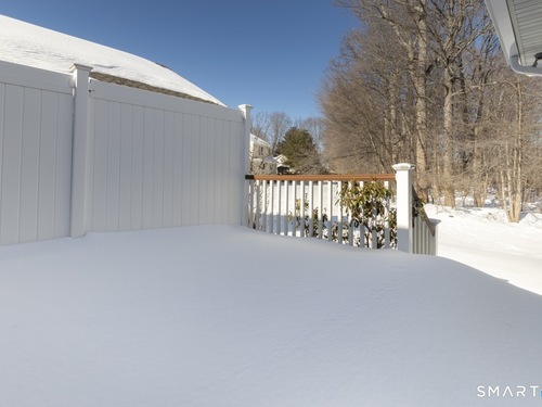 Better than new, this move-in-ready 1st Floor luxury condominium has been beautifully updated and meticulously maintained, featuring hardwood floors throughout the main level, abundant natural light, custom millwork and built-ins, an open floor plan, cathedral ceilings, generous storage, and a living room with a cozy gas fireplace and sliders to a private Trex-style deck overlooking a stunning grassy property framed by classic stone walls and mature trees beyond. The brand-new, fully remodeled kitchen is a true standout, offering all-new flooring, quartz countertops, ceramic farmhouse sink, stainless steel appliances, gas stove, high-end custom cabinetry, and pantry storage. The space is anchored by a charming eat-in area with custom built-in bench seating, creating a warm and inviting spot for casual meals and conversation. The main level includes a spacious dining and living room combination, a library or home office with extensive built-ins, and a primary suite with a full bath featuring both a walk-in shower and whirlpool tub, along with his-and-hers closets. Additional conveniences include a half bath, laundry area, and direct garage access. The finished lower level offers approximately 1,290 square feet (per tax records), providing exceptional space for guests or personal use. This bonus area features new luxury tile flooring, a large family room with full bath, cedar closet, walk-in closet, a rare set of Bilco doors to the exterior-making moving in a breeze.