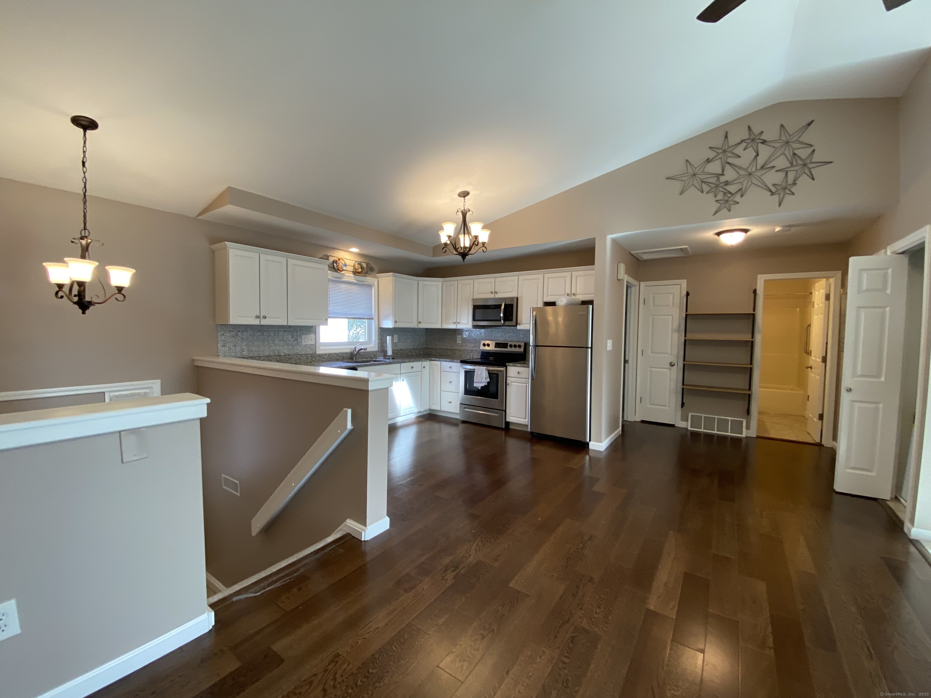 Welcome to Myrtle Gardens! This great location condo offers easy access from the main road with no hills. This ranch style condo is an end unit with mother nature outside your windows. Enter from your front door or from your garage area which keeps you dry during the stormy winter months and offers storage. Our open floor plan offers a skylight in the living room, kitchen with plenty of cabinets and stainless steel appliances, stackable washer and dryer in unit, attic access, master bedroom with plenty of lighted closet space, ceiling fan with light, own entrance to bathroom and views to mother nature. Our second bedroom also offers plenty of closet space, ceiling fan with light, and views to mother nature. In the warmer months our new trex deck is overside with a special area for a grill that doesn't take away from the oversized dining space. Outdoor storage and outdoor electrical is an added plus. with a slider to a new oversized trek deck. Low common charges and move in ready! This move in ready condo offers a walkable area to Center Stage or the Riverwalk!