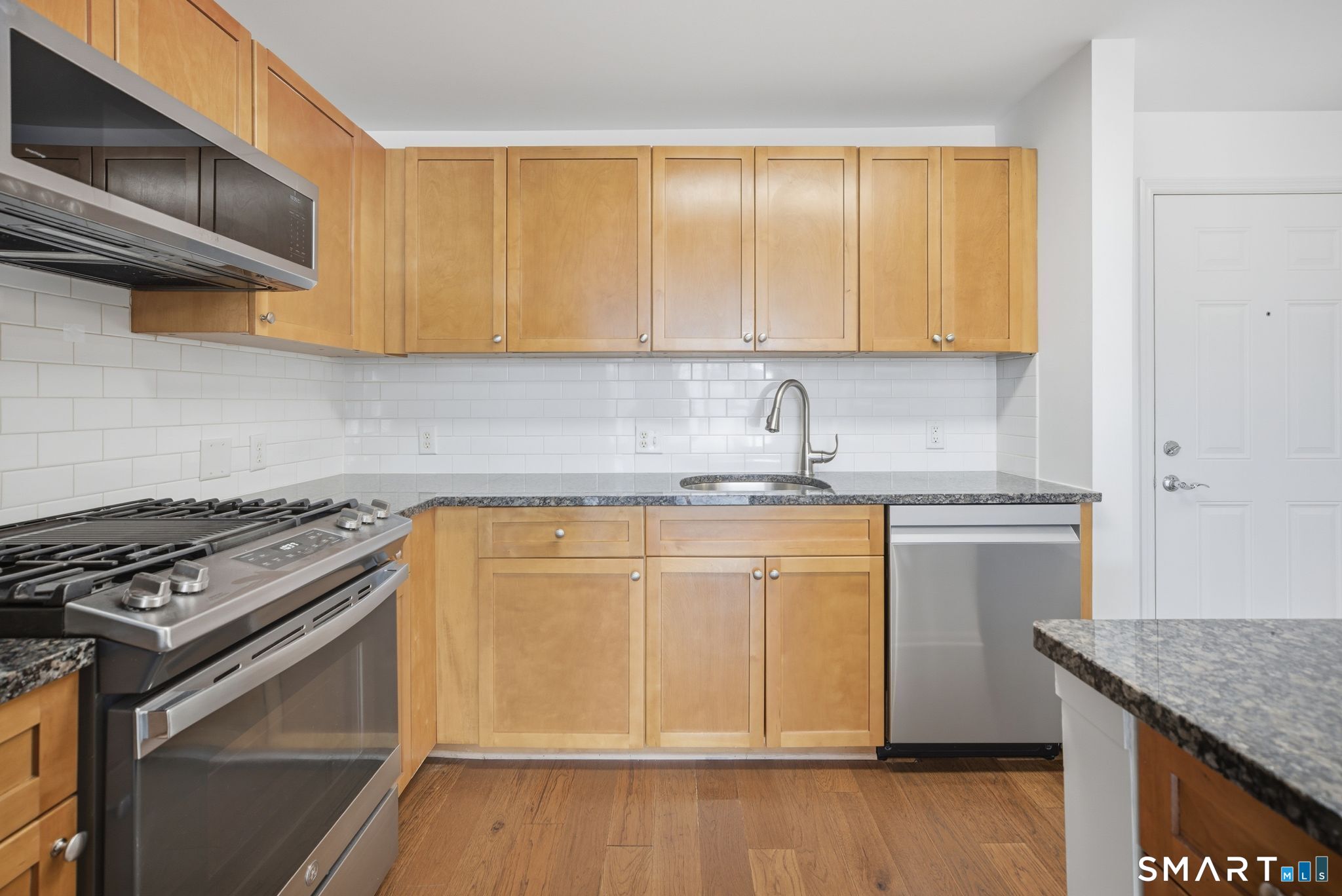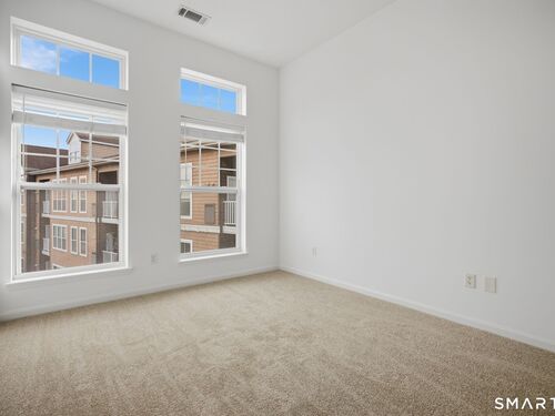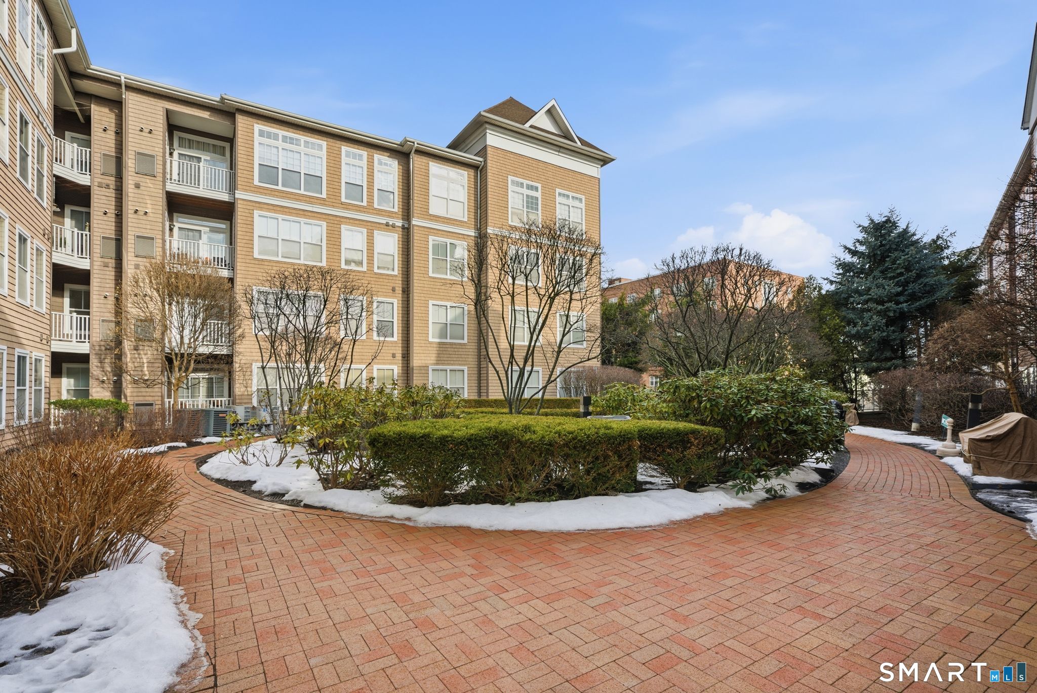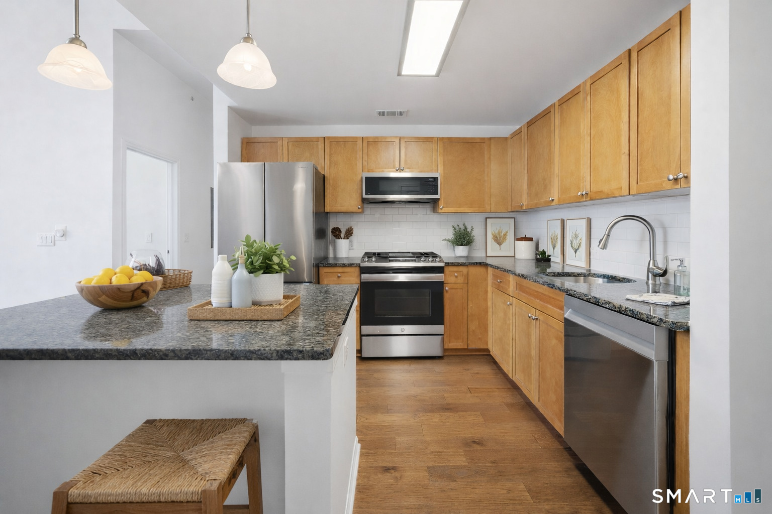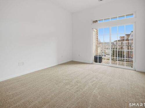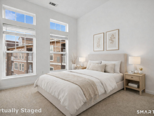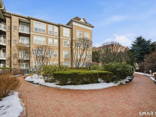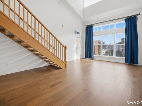 Welcome to this top-floor coveted loft style residence at Eastside Commons, offering refined urban living with serene courtyard views. Located on the 5th floor, this meticulously cared for home has been freshly painted throughout and features engineered hardwood flooring, delivering a polished, move-in ready feel. The open concept layout is highlighted by a dramatic two-story living and dining area, ideal for entertaining or everyday comfort. The kitchen is beautifully updated with all new 2024 stainless steel smart appliances, including gas range, microwave, refrigerator, and dishwasher, along with a center island that flows seamlessly into the main living space. Step out onto your private balcony overlooking the landscaped courtyard. The primary suite offers an ensuite full bath and walk-in closet, while the second bedroom with walk-in closet, additional full bath, and versatile loft space provide flexibility for a home office, den, or guest retreat. Brand new carpeting adds comfort to the bedrooms and loft areas, and in-unit laundry includes a new washer and dryer from 2023. Recent upgrades include a smart thermostat, updated HVAC, and new water heater from 2022. The building offers elevator access, concierge service, a fitness center, courtyard, and shuttle service. Includes 2 parking spaces (1 assigned, 1 floating) in secured underground garage. Incredible walkable location near downtown Stamford, shops, restaurants, and the train station with quick access to I-95.