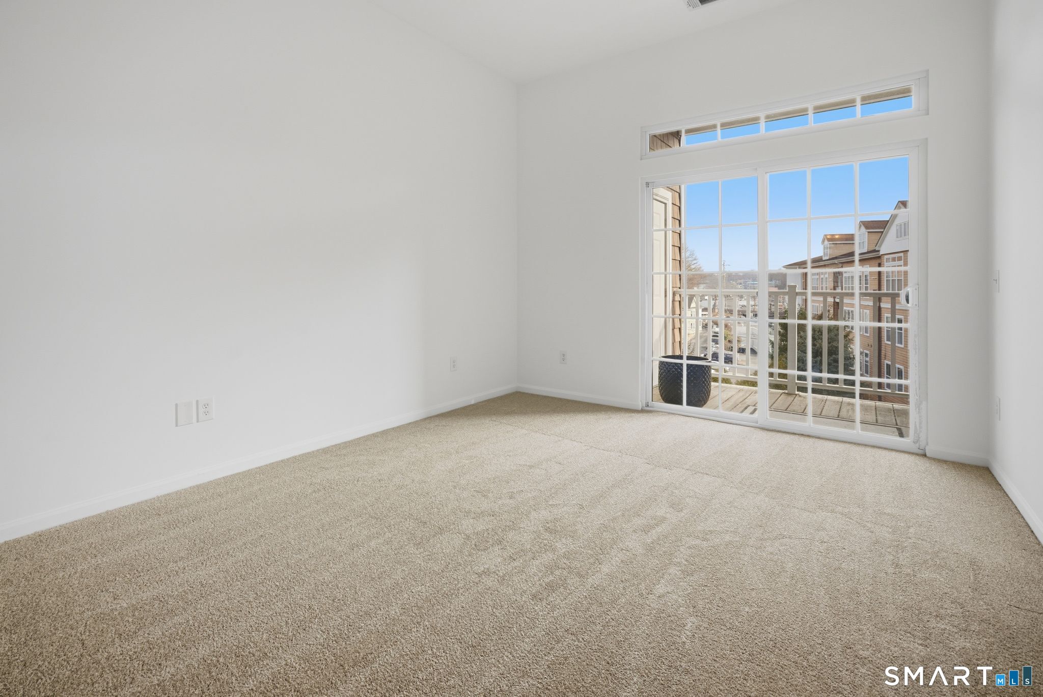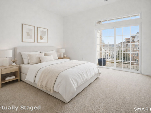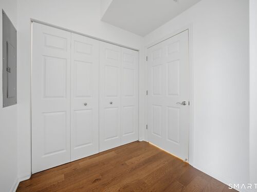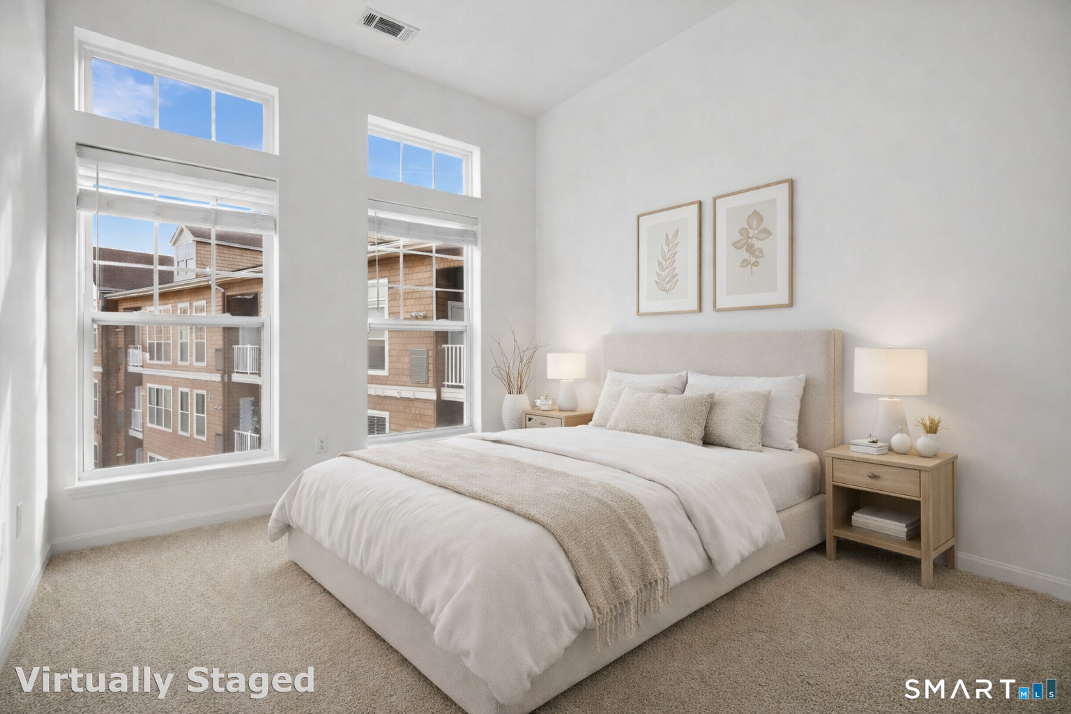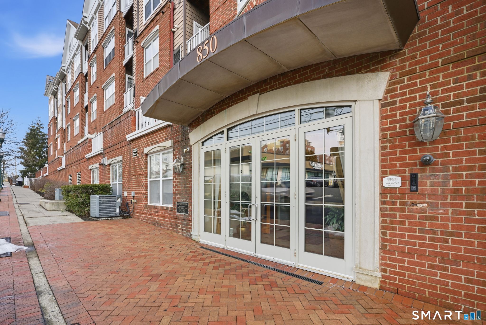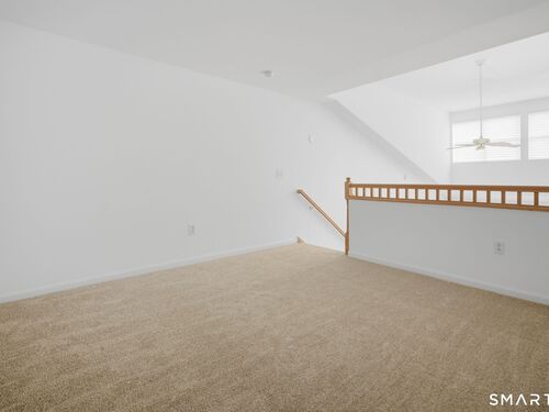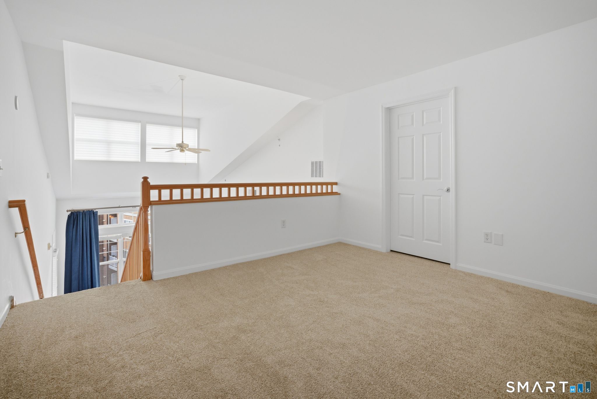 Welcome to this top-floor coveted loft style residence at Eastside Commons, offering refined urban living with serene courtyard views. Located on the 5th floor, this meticulously cared for home has been freshly painted throughout and features engineered hardwood flooring, delivering a polished, move-in ready feel. The open concept layout is highlighted by a dramatic two-story living and dining area, ideal for entertaining or everyday comfort. The kitchen is beautifully updated with all new 2024 stainless steel smart appliances, including gas range, microwave, refrigerator, and dishwasher, along with a center island that flows seamlessly into the main living space. Step out onto your private balcony overlooking the landscaped courtyard. The primary suite offers an ensuite full bath and walk-in closet, while the second bedroom with walk-in closet, additional full bath, and versatile loft space provide flexibility for a home office, den, or guest retreat. Brand new carpeting adds comfort to the bedrooms and loft areas, and in-unit laundry includes a new washer and dryer from 2023. Recent upgrades include a smart thermostat, updated HVAC, and new water heater from 2022. The building offers elevator access, concierge service, a fitness center, courtyard, and shuttle service. Includes 2 parking spaces (1 assigned, 1 floating) in secured underground garage. Incredible walkable location near downtown Stamford, shops, restaurants, and the train station with quick access to I-95.