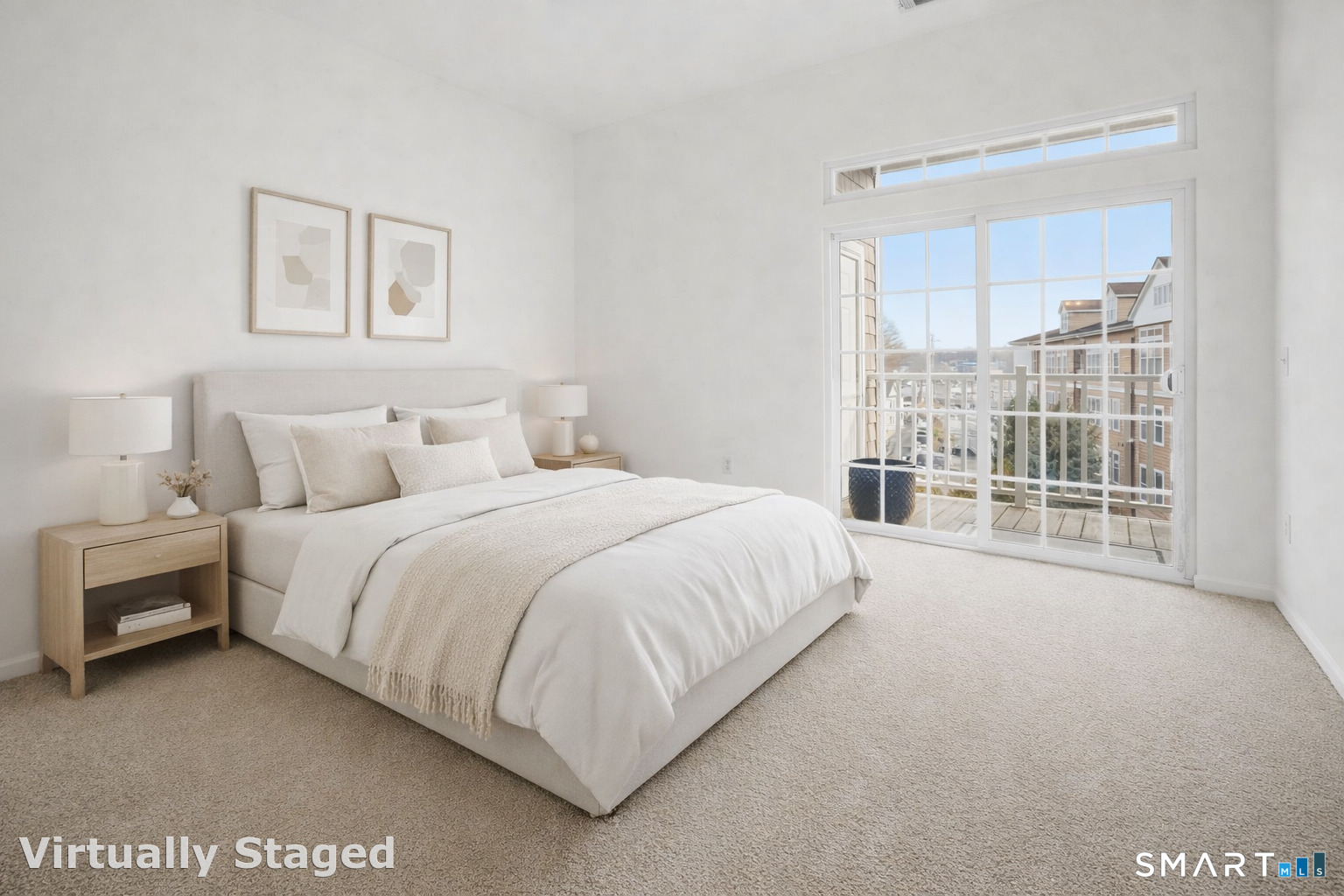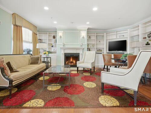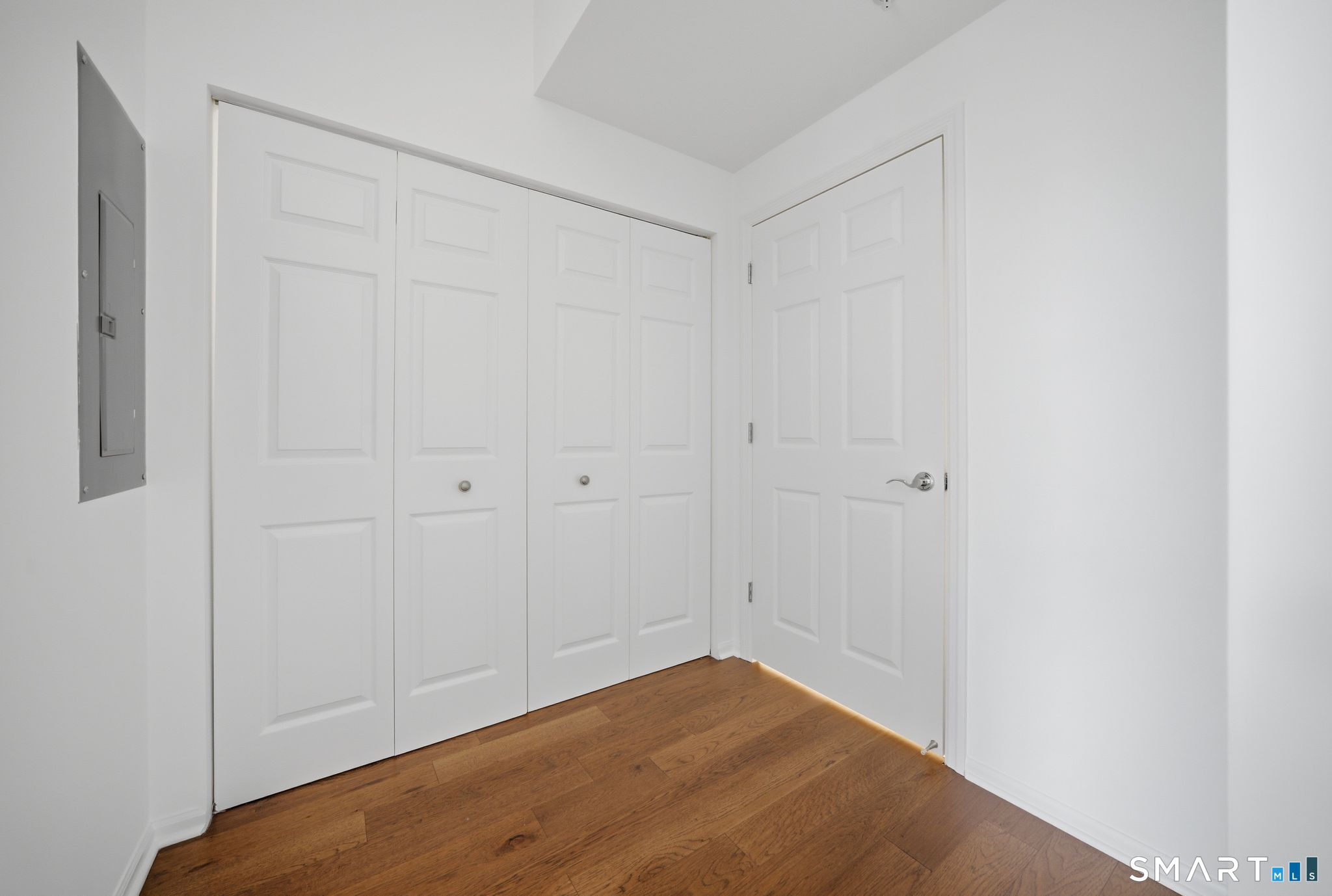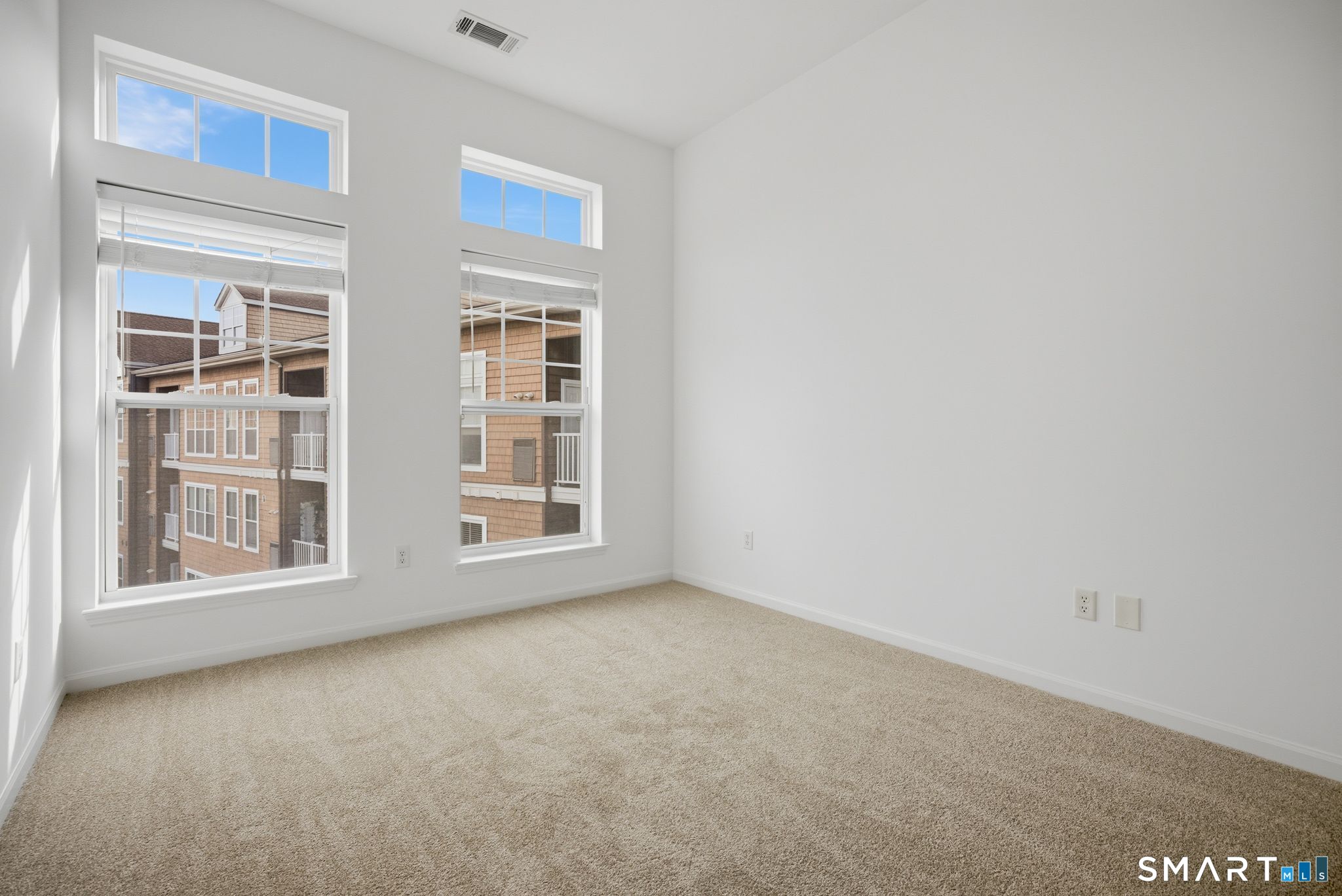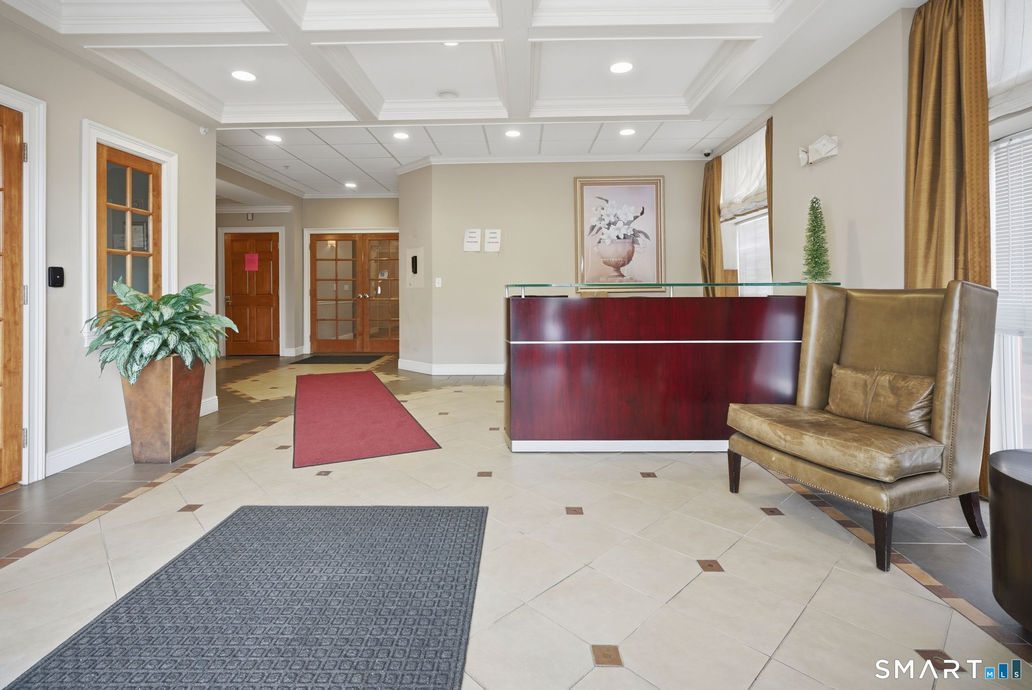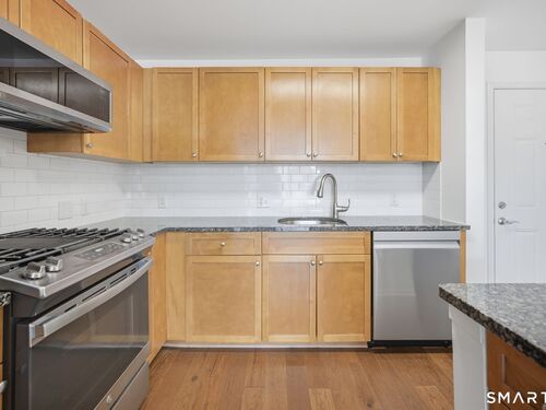 Welcome to this top-floor coveted loft style residence at Eastside Commons, offering refined urban living with serene courtyard views. Located on the 5th floor, this meticulously cared for home has been freshly painted throughout and features engineered hardwood flooring, delivering a polished, move-in ready feel. The open concept layout is highlighted by a dramatic two-story living and dining area, ideal for entertaining or everyday comfort. The kitchen is beautifully updated with all new 2024 stainless steel smart appliances, including gas range, microwave, refrigerator, and dishwasher, along with a center island that flows seamlessly into the main living space. Step out onto your private balcony overlooking the landscaped courtyard. The primary suite offers an ensuite full bath and walk-in closet, while the second bedroom with walk-in closet, additional full bath, and versatile loft space provide flexibility for a home office, den, or guest retreat. Brand new carpeting adds comfort to the bedrooms and loft areas, and in-unit laundry includes a new washer and dryer from 2023. Recent upgrades include a smart thermostat, updated HVAC, and new water heater from 2022. The building offers elevator access, concierge service, a fitness center, courtyard, and shuttle service. Includes 2 parking spaces (1 assigned, 1 floating) in secured underground garage. Incredible walkable location near downtown Stamford, shops, restaurants, and the train station with quick access to I-95.
