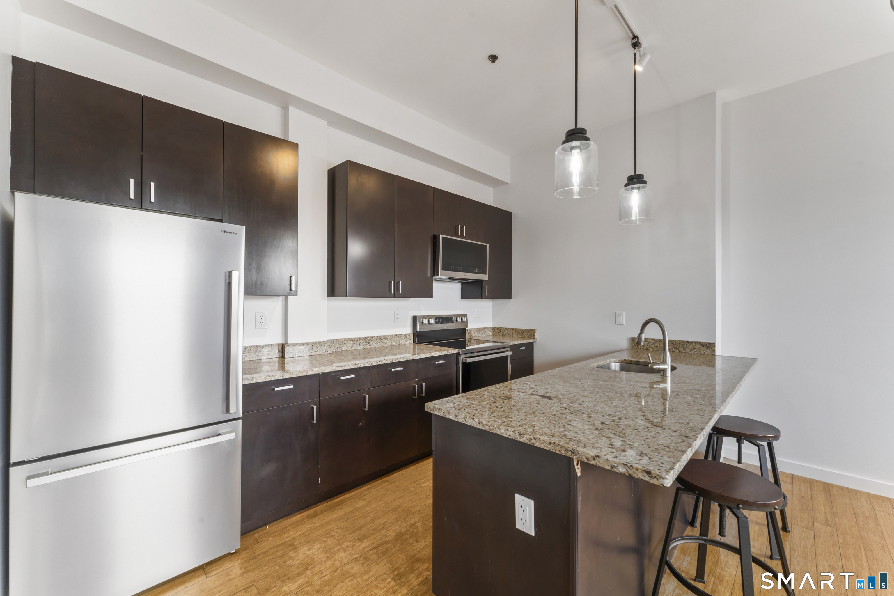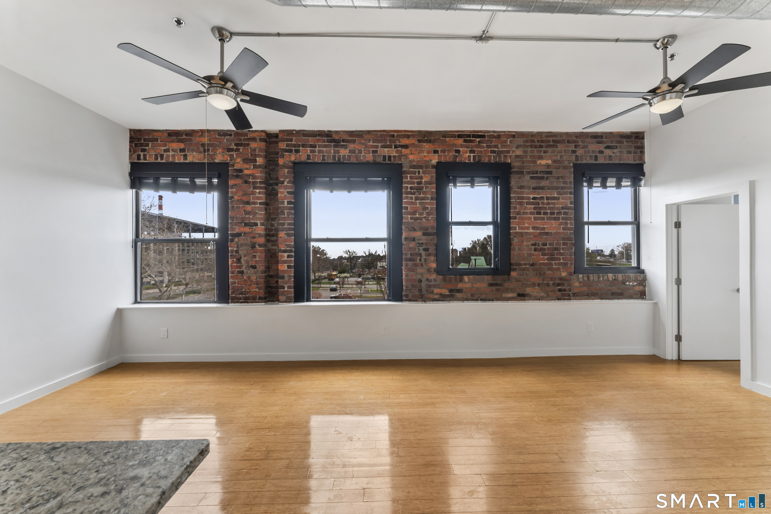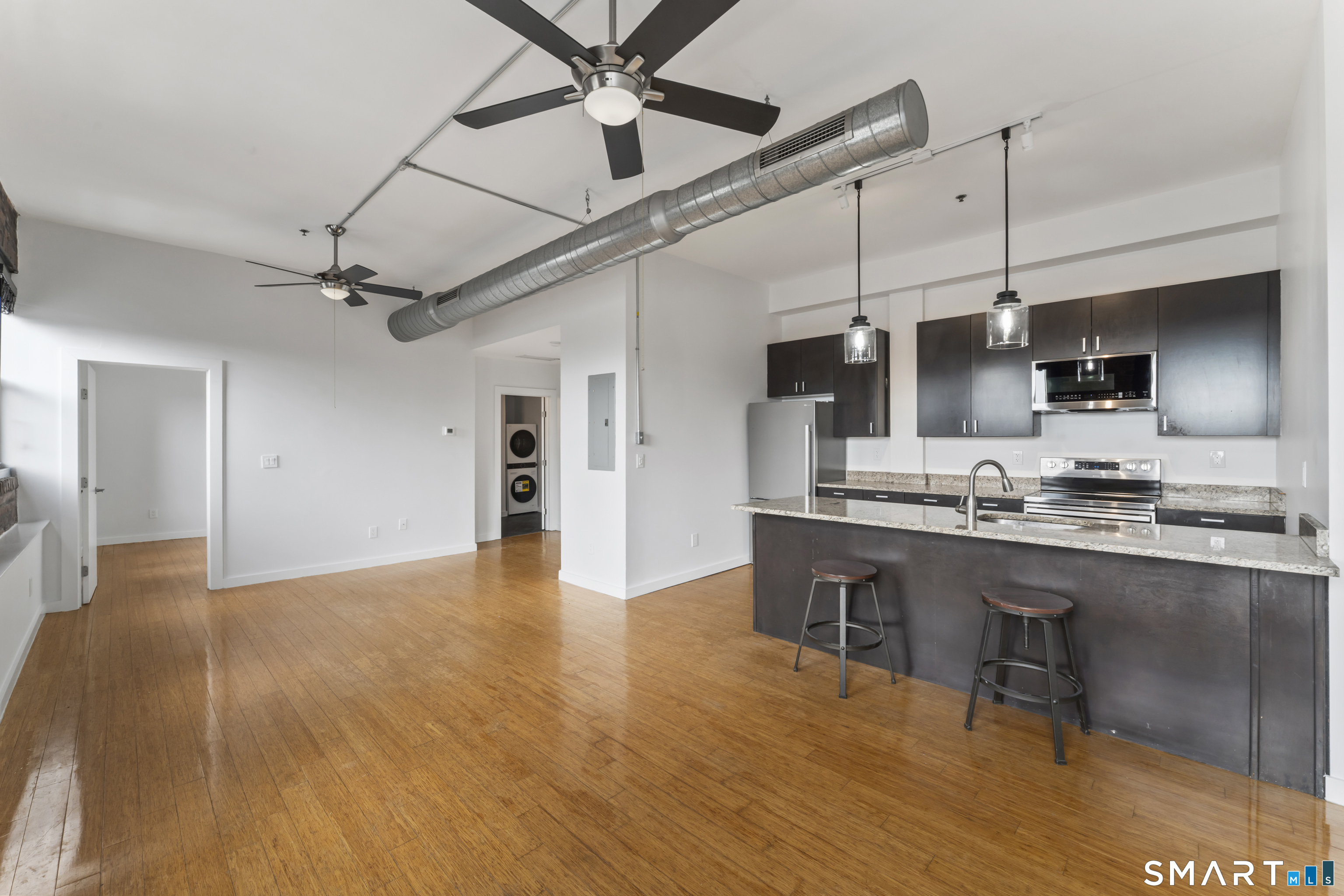 Welcome to 881 Lafayette Unit 3K! This beautifully renovated one bedroom condo is bathed in sunlight featuring an open floor plan and 9' ceilings. The bright and sunny kitchen boasts a large island with granite counter tops, BRAND NEW kitchen appliances and generous cabinets. Freshly painted and with gleaming bamboo floors, the space effortlessly flows to enhance continuity from the living space to the primary bedroom. Large windows allow for optimal sun light with exposed brick highlighting water views of Long Island Sound. With a BRAND NEW washer and dryer in unit, bathroom includes full bathtub and tiled floors. The building is centrally located and just a few minutes from the heart of Downtown Bridgeport, The Ampitheatre, The Arena, the Train Station, Port Jeff Ferry, I95, Housatonic Community College, University of Bridgeport and the most amazing beaches Connecticut!