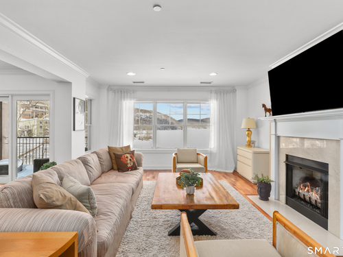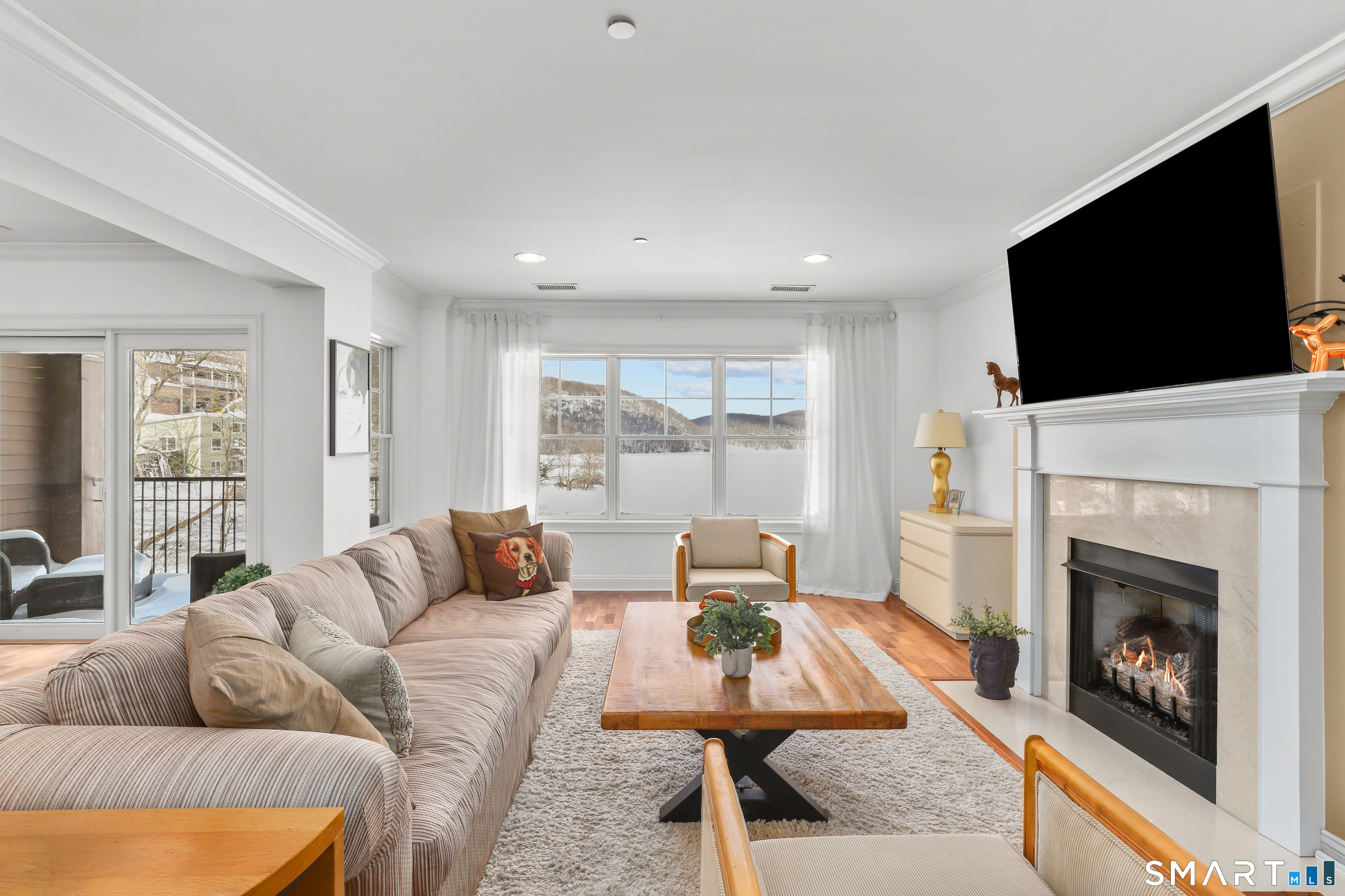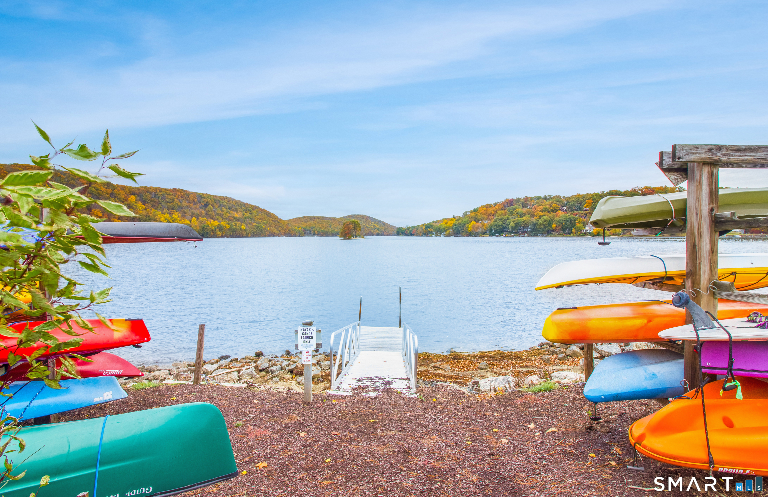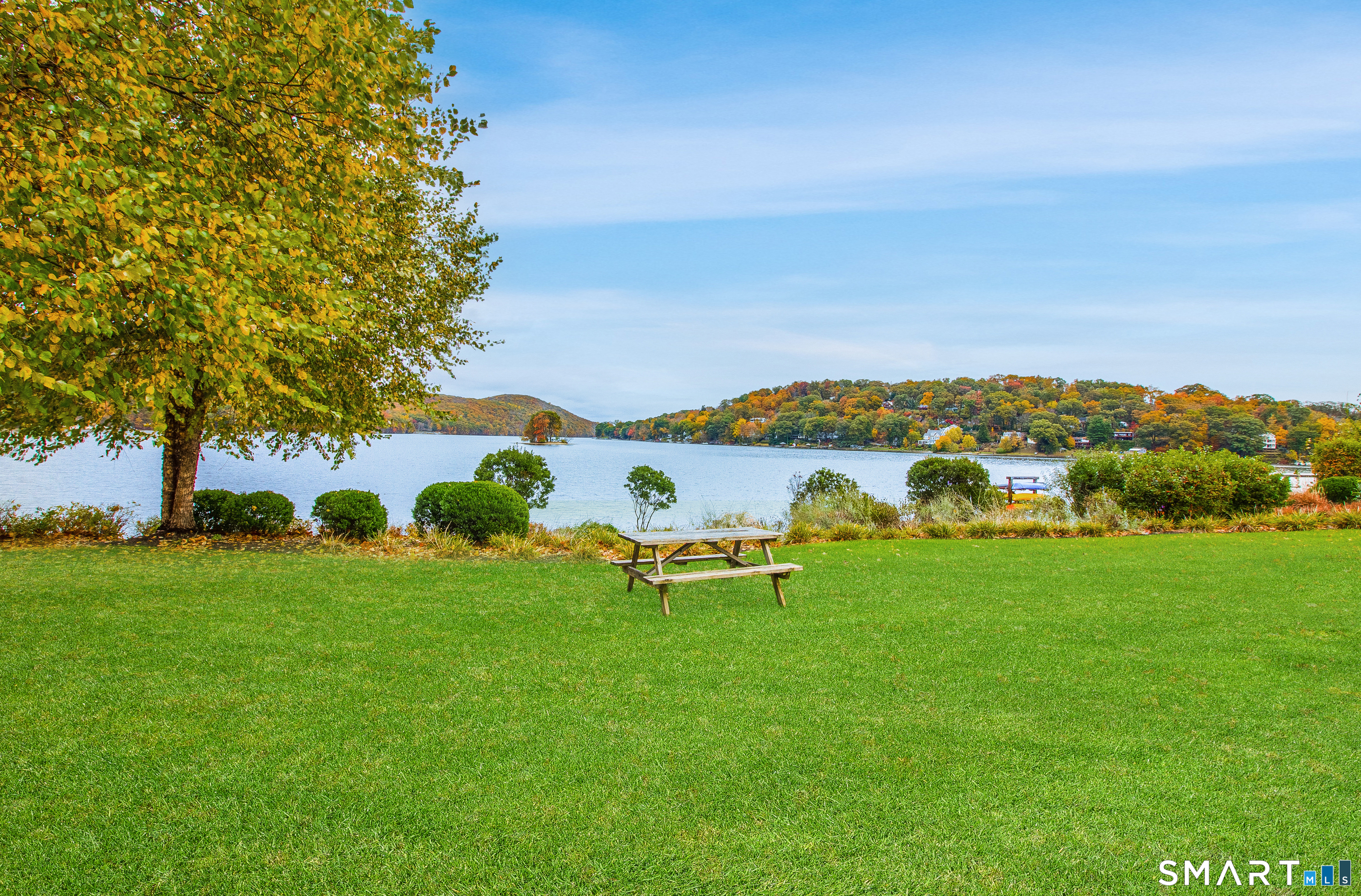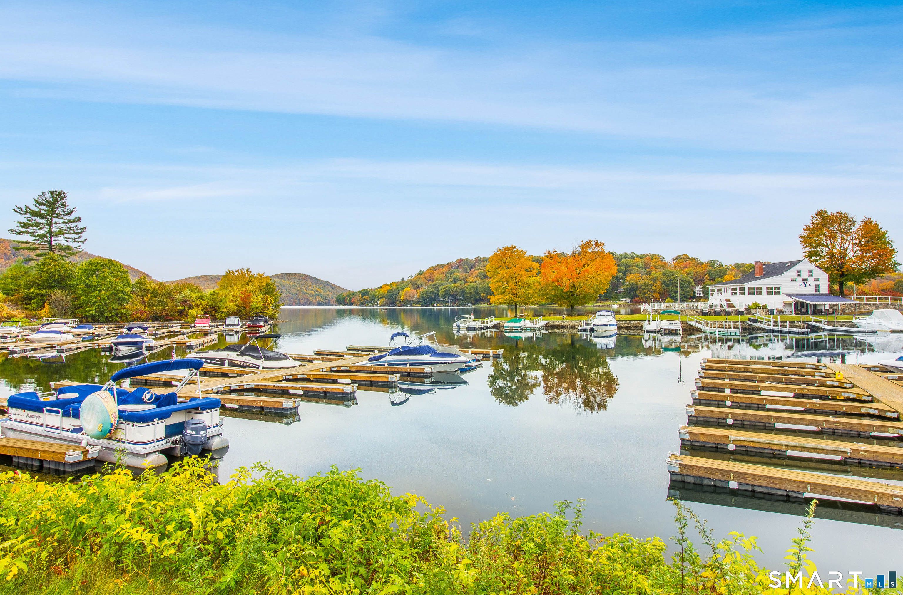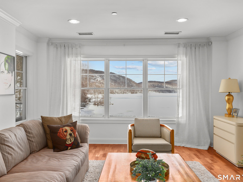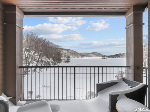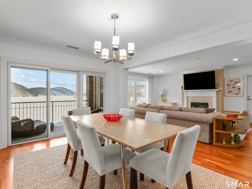 Set within the premier building at Poet's Landing, this beautifully appointed residence offers one of the most coveted vantage points in the community - an unobstructed, straight-down-the-lake view paired with immediate access to Poet's Landing's private pool, beach, park, and fitness center. Positioned to capture sweeping water views, the home enjoys a rare sense of openness and connection to Candlewood Lake that few units can match. A covered balcony becomes a true extension of the living space, ideal for morning coffee, evening sunsets, or simply watching the lake change throughout the day. Inside, the open-concept layout is both refined and inviting, anchored by rich cherry floors and high ceilings that enhance the natural light and sense of scale. The chef's kitchen is outfitted with Sub-Zero refrigeration, a Wolf range, ASKO dishwasher, granite countertops, and custom cabinetry, seamlessly connecting to the dining and living areas - perfect for entertaining or relaxed everyday living.