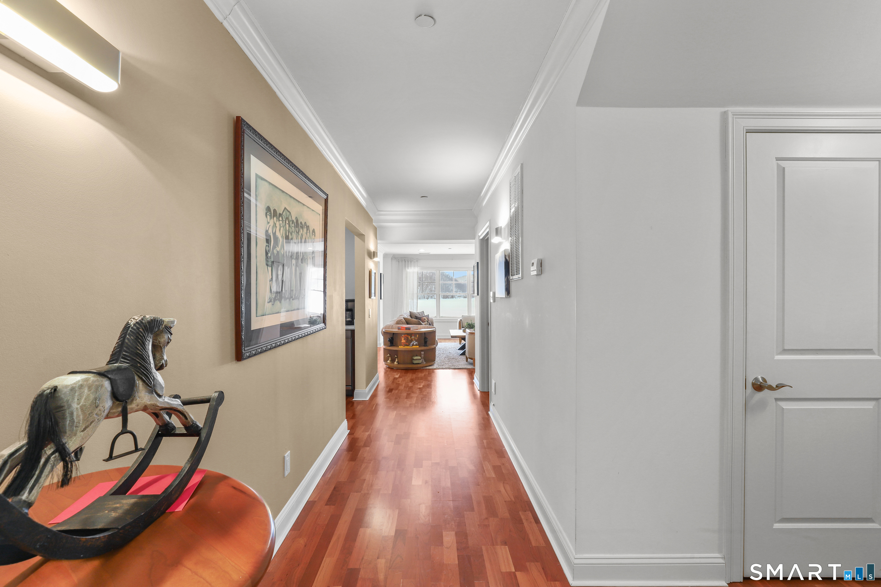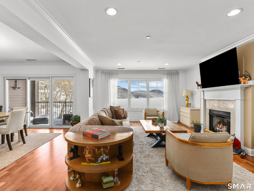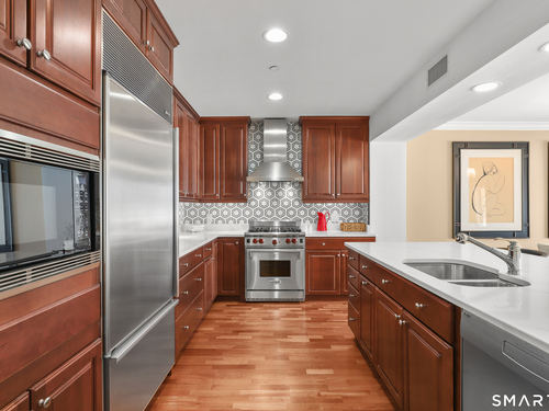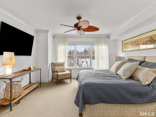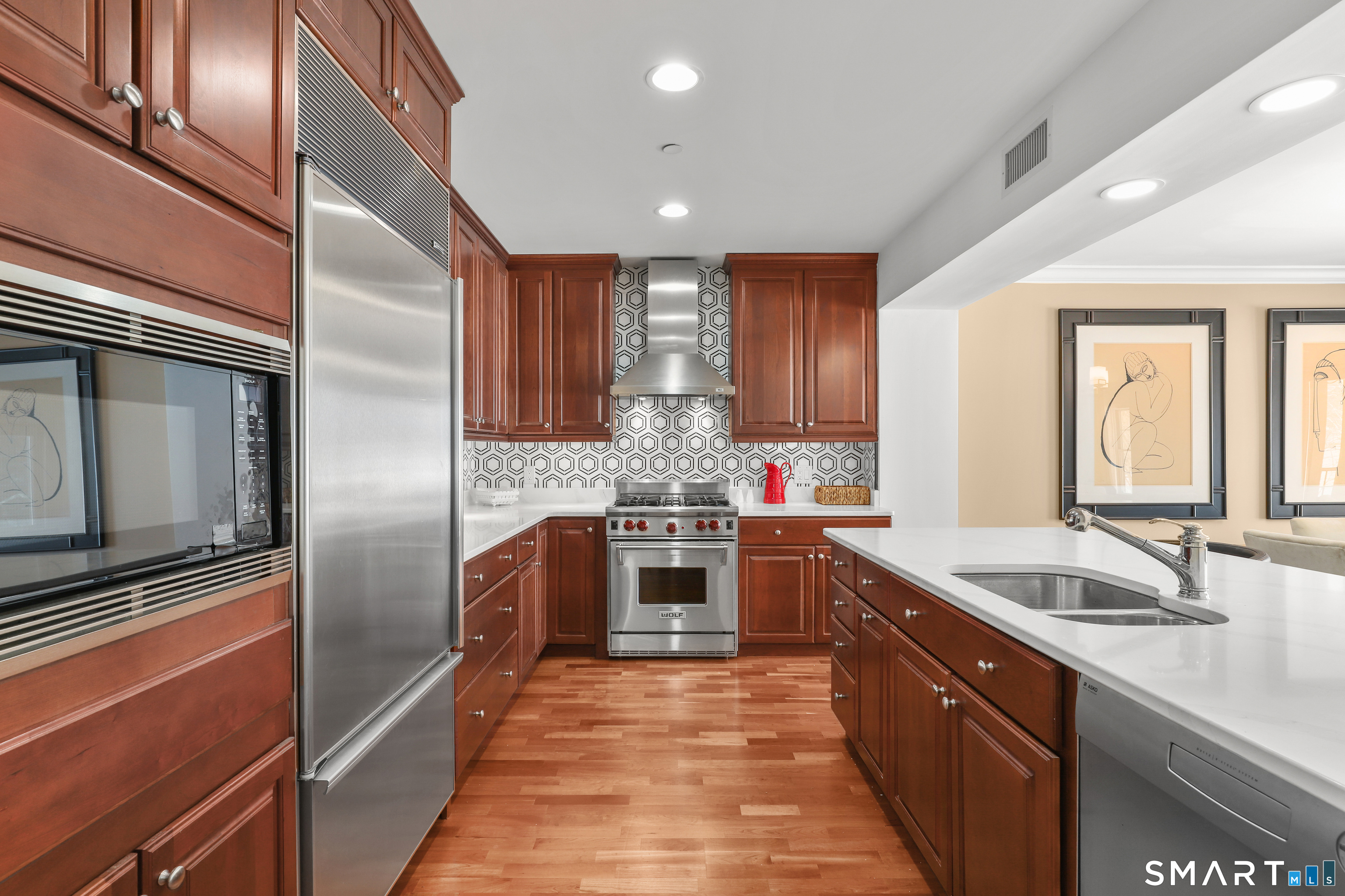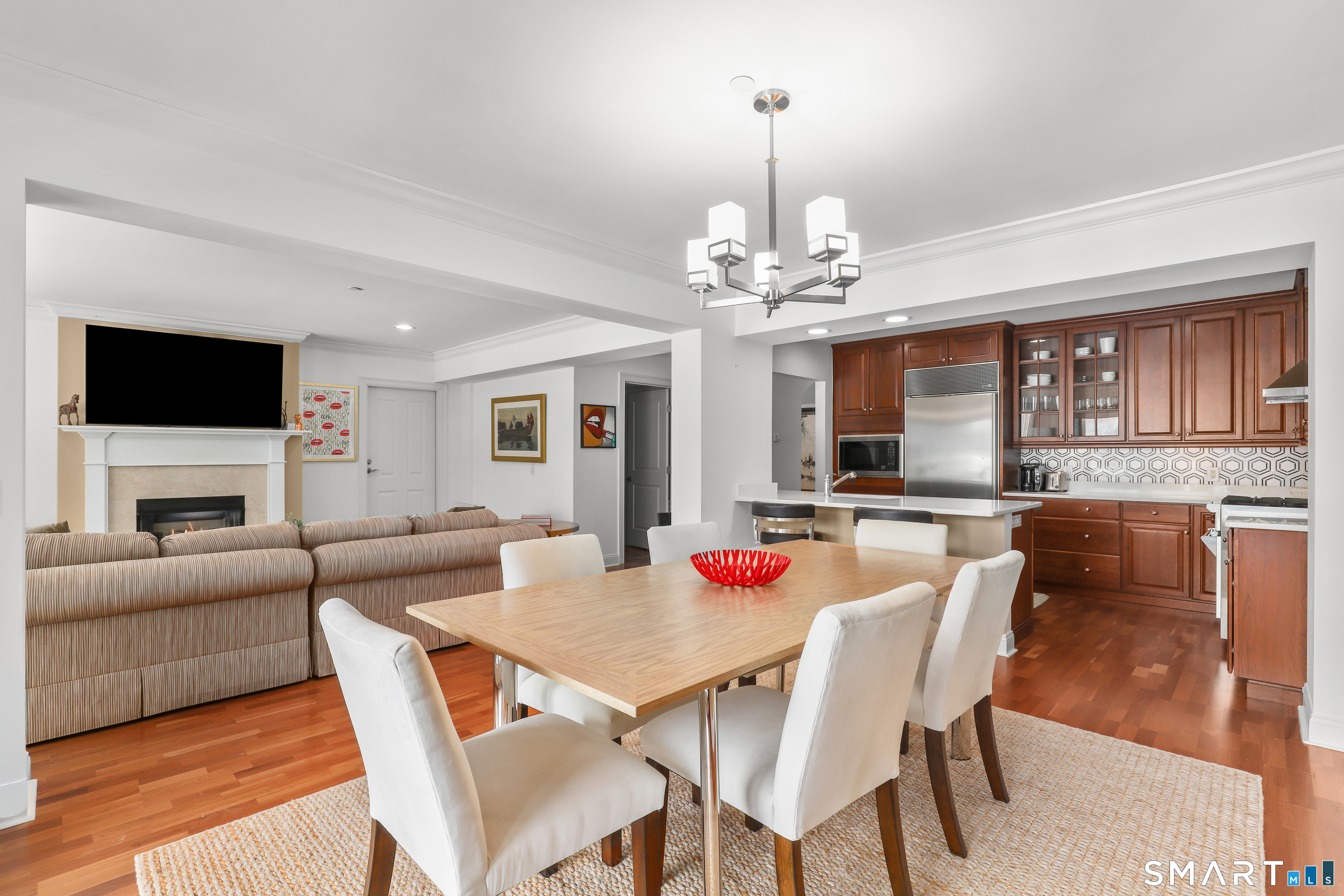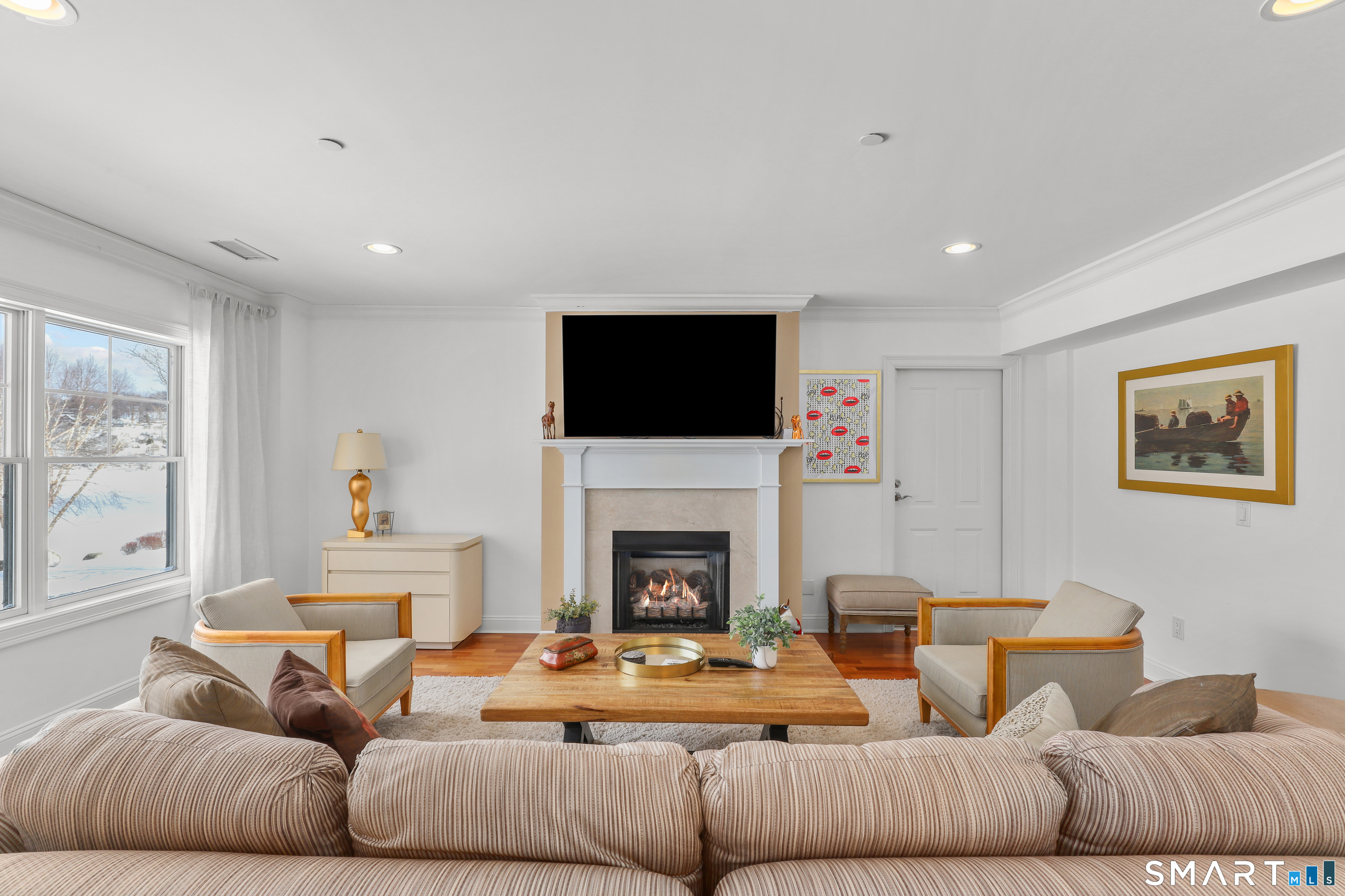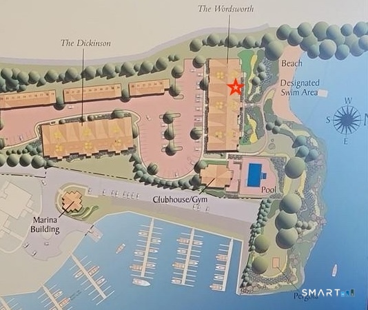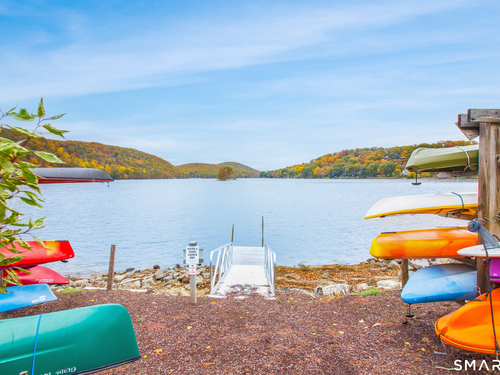 Set within the premier building at Poet's Landing, this beautifully appointed residence offers one of the most coveted vantage points in the community - an unobstructed, straight-down-the-lake view paired with immediate access to Poet's Landing's private pool, beach, park, and fitness center. Positioned to capture sweeping water views, the home enjoys a rare sense of openness and connection to Candlewood Lake that few units can match. A covered balcony becomes a true extension of the living space, ideal for morning coffee, evening sunsets, or simply watching the lake change throughout the day. Inside, the open-concept layout is both refined and inviting, anchored by rich cherry floors and high ceilings that enhance the natural light and sense of scale. The chef's kitchen is outfitted with Sub-Zero refrigeration, a Wolf range, ASKO dishwasher, granite countertops, and custom cabinetry, seamlessly connecting to the dining and living areas - perfect for entertaining or relaxed everyday living.