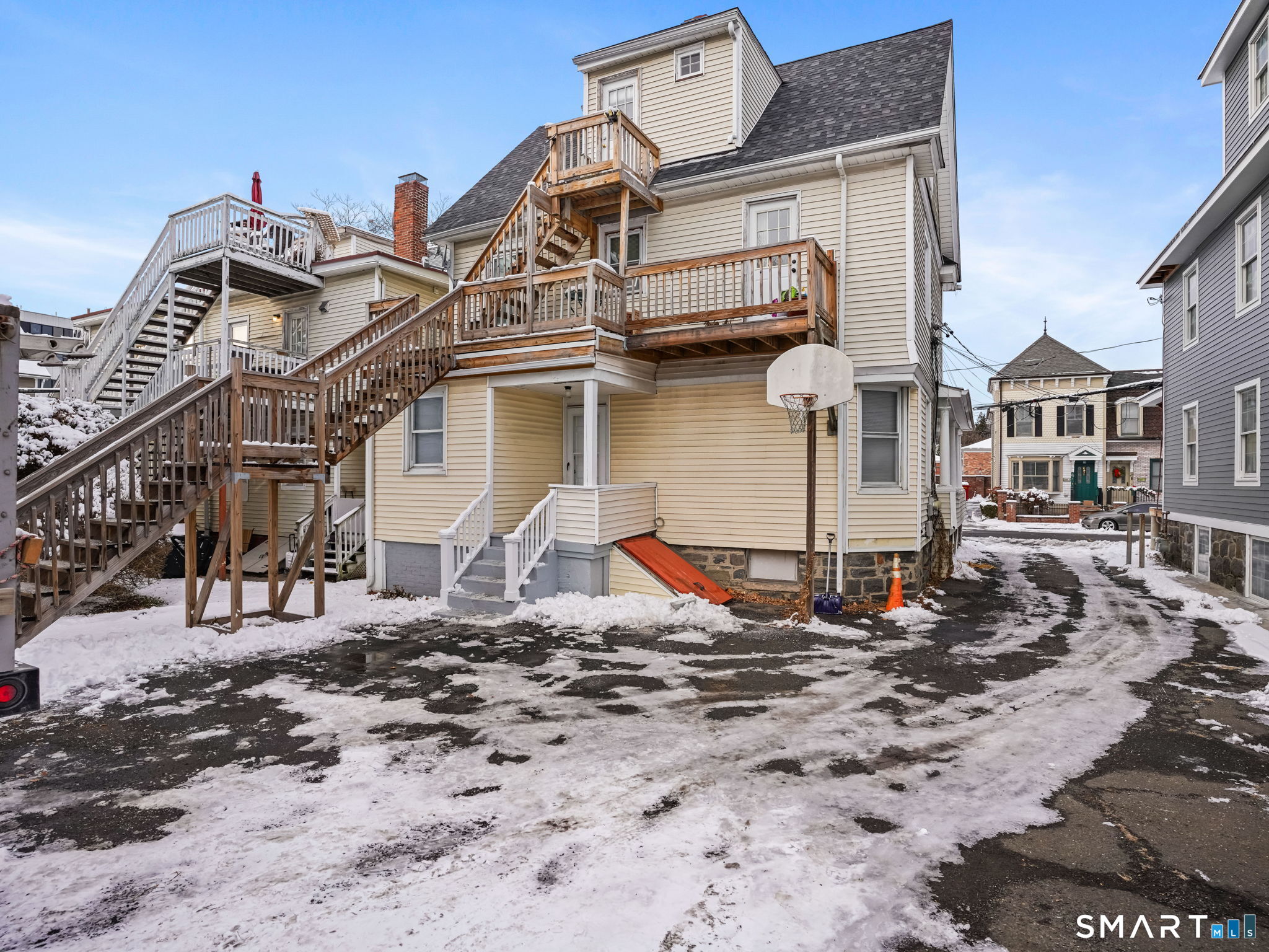 Exceptional opportunity to own a fully updated three-family home in the heart of downtown, ideal for investors or owner-occupants seeking income with urban convenience. Each unit has been thoughtfully renovated while preserving original character, offering the perfect blend of historic charm and modern living. The property features a 1-bedroom unit on the first floor, a spacious 2-bedroom unit on the second floor, and a 1-bedroom unit on the third floor. All apartments are fully updated and currently rented, showcasing modern kitchens and bathrooms, hardwood floors throughout, and original architectural details that add warmth and character. A stunning grand interior front staircase and wraparound porch enhance the building's curb appeal, while vinyl siding provides low-maintenance ownership. Each unit offers the rare convenience of both front and rear entrances, along with fire-escape back stairs for added functionality. Additional highlights include ample off-street parking and separately metered utilities, with tenants paying their own gas heat and electric, making this a smart, efficient investment. Centrally located near downtown amenities, dining, shopping, transportation, and nightlife, this property offers strong rental appeal and lifestyle flexibility. A turnkey multifamily asset with income in place-perfect for an investor or an owner-occupant looking to live downtown while offsetting expenses with rental income.