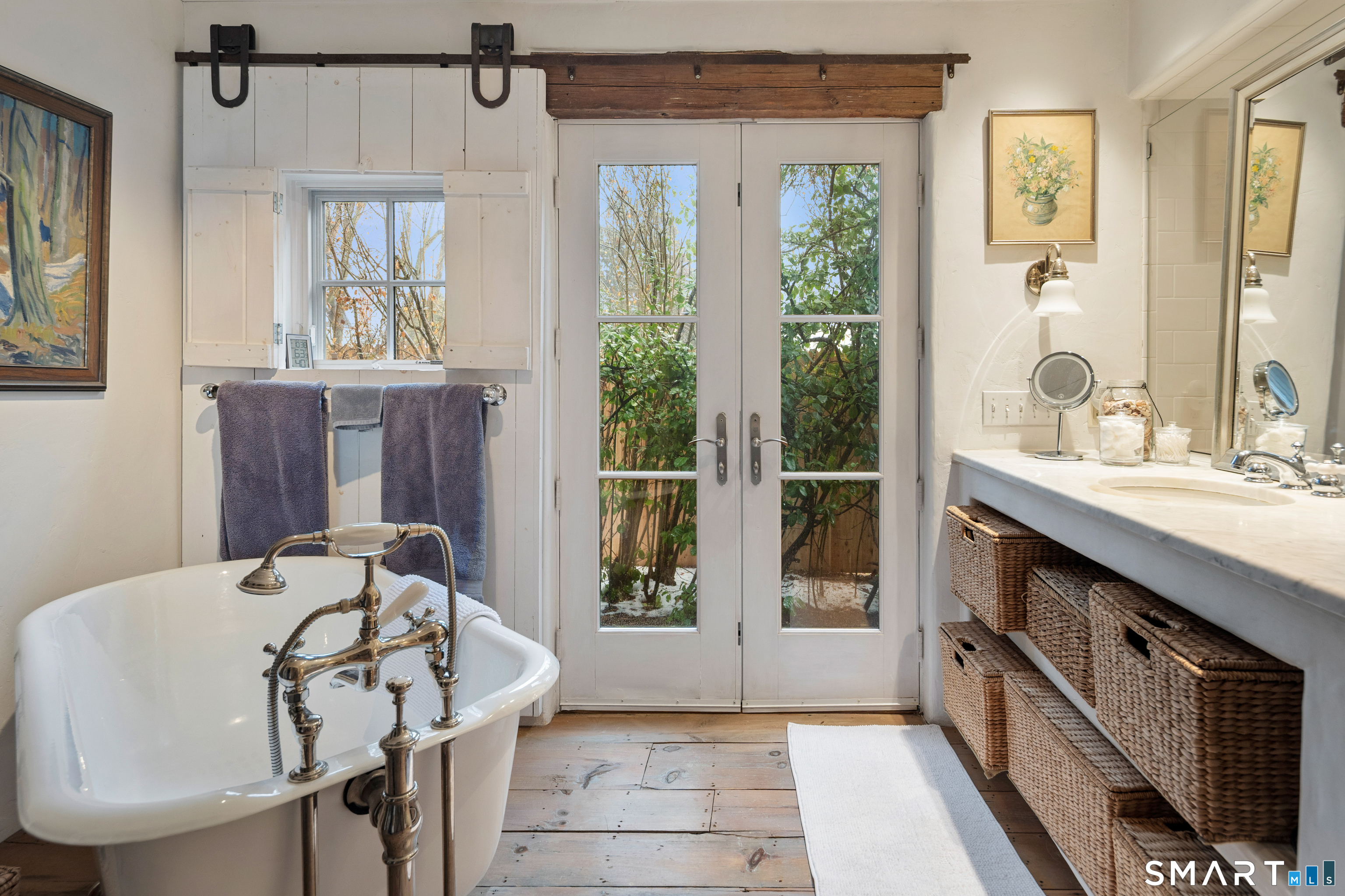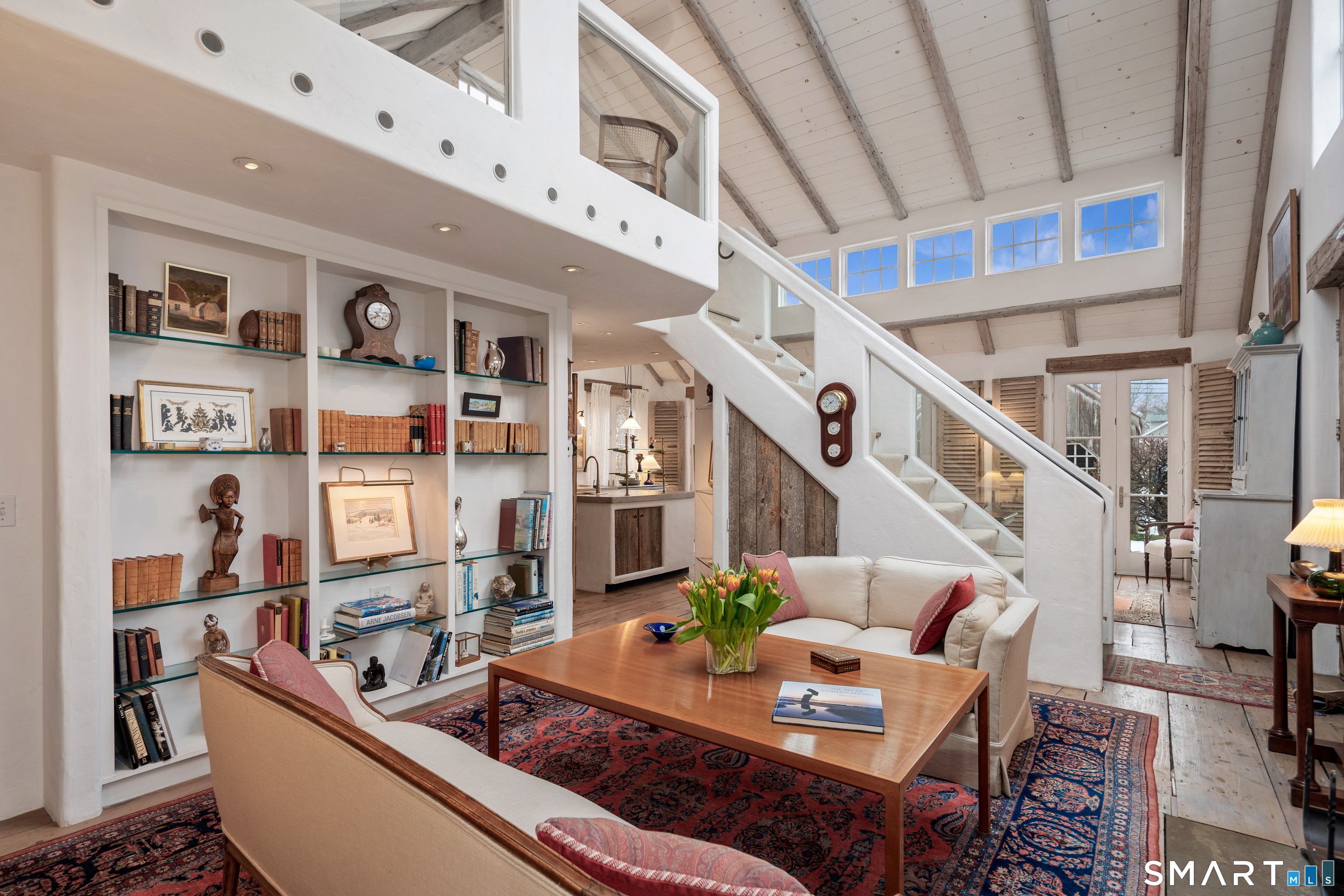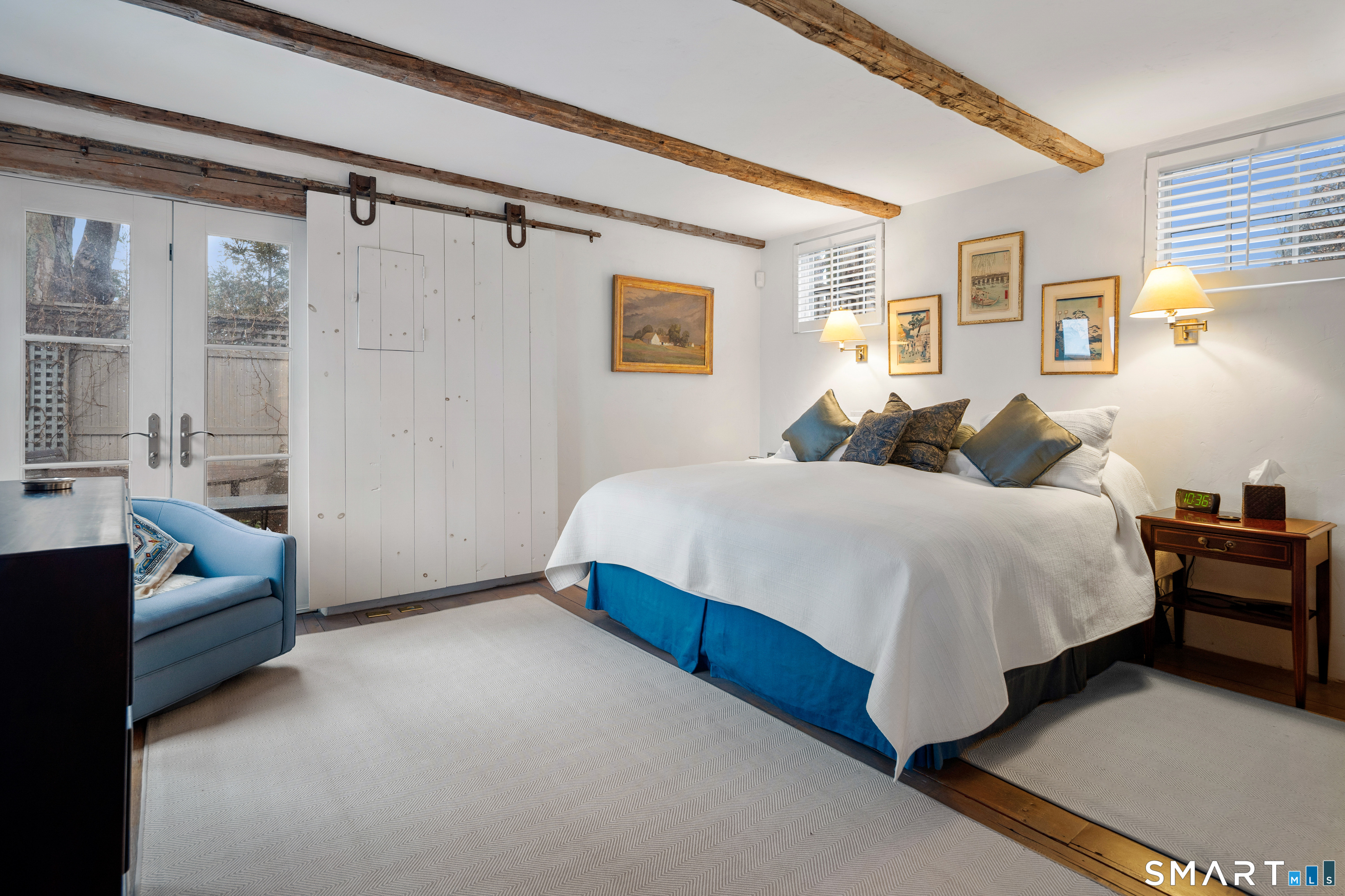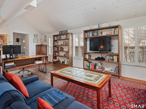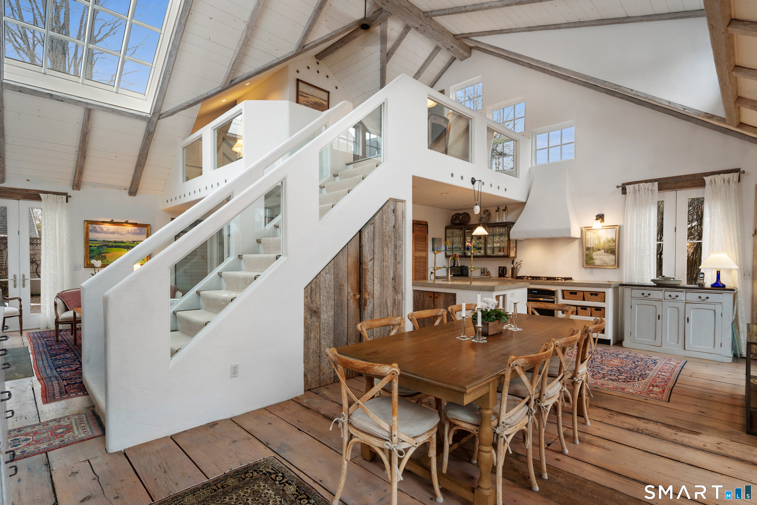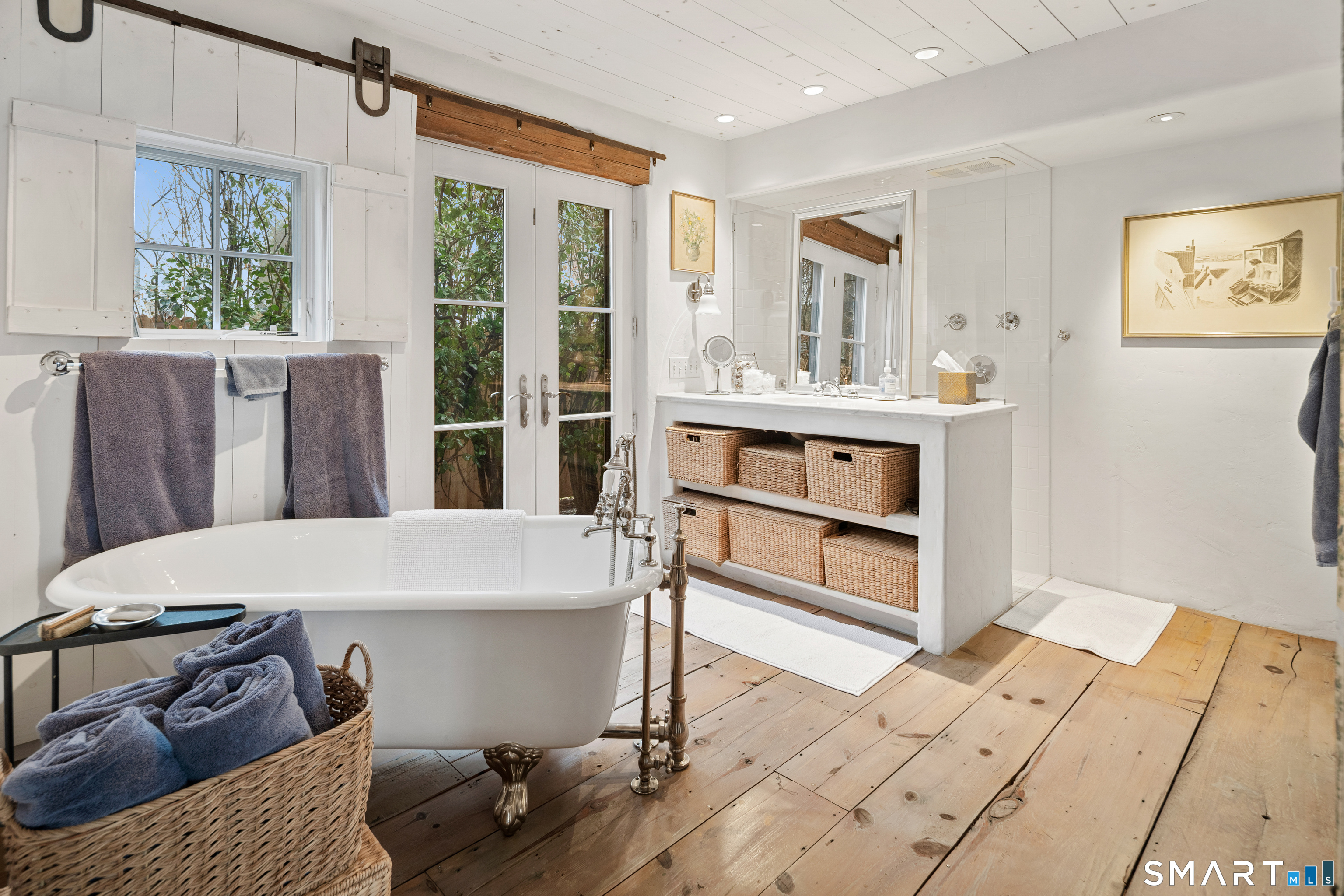 Step into this magical home and be transported to the South of France-Provence in Rowayton! Bathed in natural light, the residence blends refined, understated elegance with intimate yet open living spaces. Throughout the home, French doors open to serene outdoor settings including a koi pond, private sitting areas, and tranquil pebbled gardens. The main house features a beautiful living room with fireplace and soaring two-story ceiling, a charming Provencal-inspired dining room, and a thoughtfully designed kitchen. A 1st floor primary suite offers comfort and convenience, while the 2nd floor loft provides Five Mile River and treetop views along with an additional bedroom and full bath. "The Smithy," originally built in 1775 and completely rebuilt in 2002, is a charming detached structure offering a versatile office or studio space with full bath and its own private patio -perfect for guests, work-from-home, or creative pursuits. A delightful barn/garage features a lattice wall that welcomes natural light and frames views of the garden and wisteria vine. The entire property was thoughtfully designed by Barbara Garfield, celebrated for her distinctive attention to detail. Special features include wrought iron accents, random-width flooring, reclaimed wood and beams from historic barns in Connecticut and the South of France. All in the heart of Rowayton. Walk to shops, restaurants, beach, town dock, tennis, pickleball, library, dog park and train to NYC. Truly a special offering