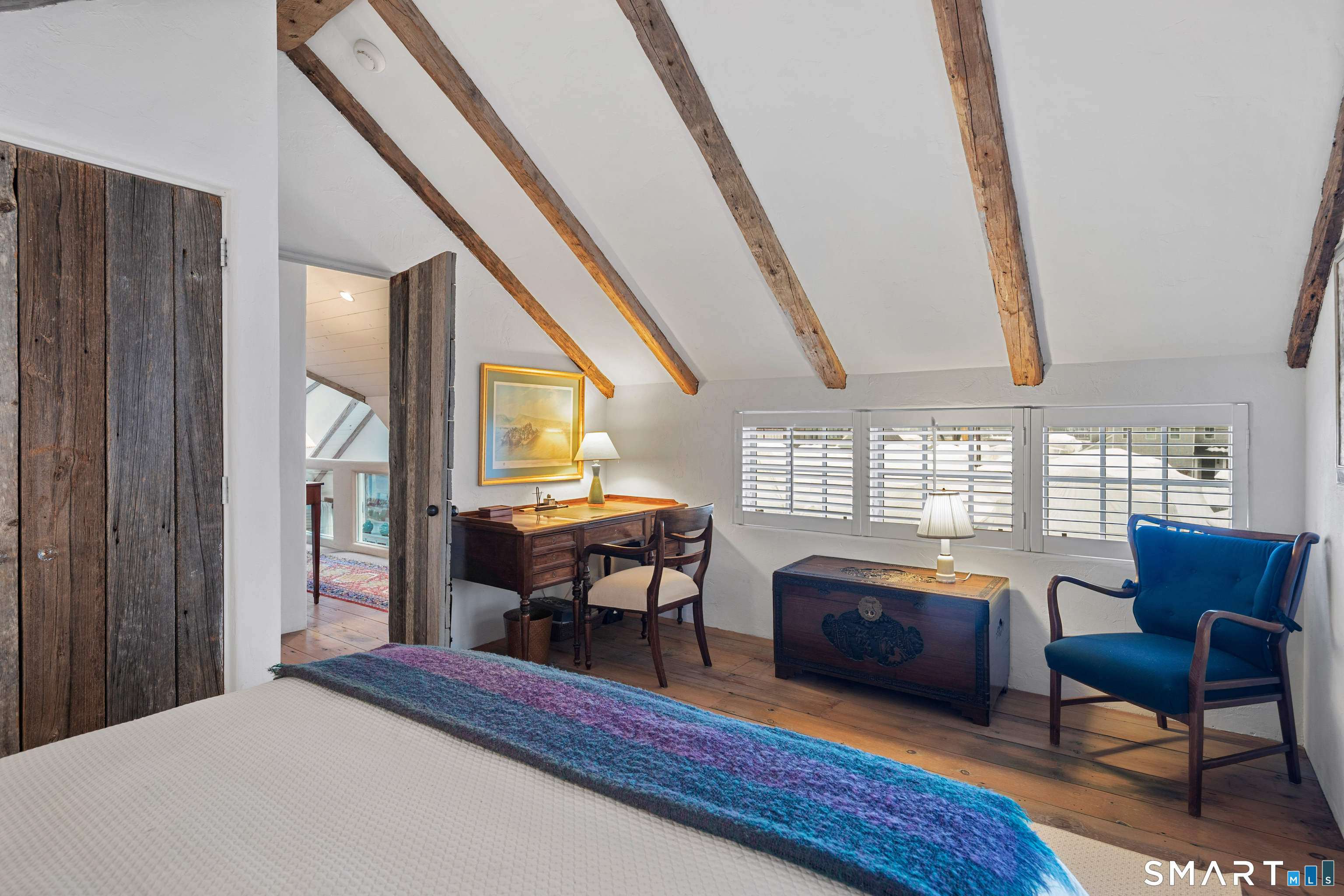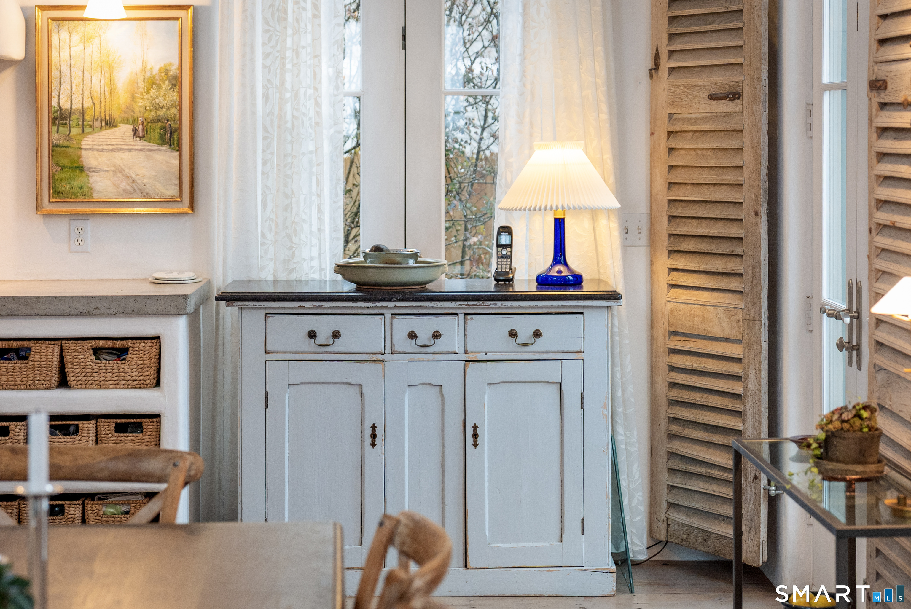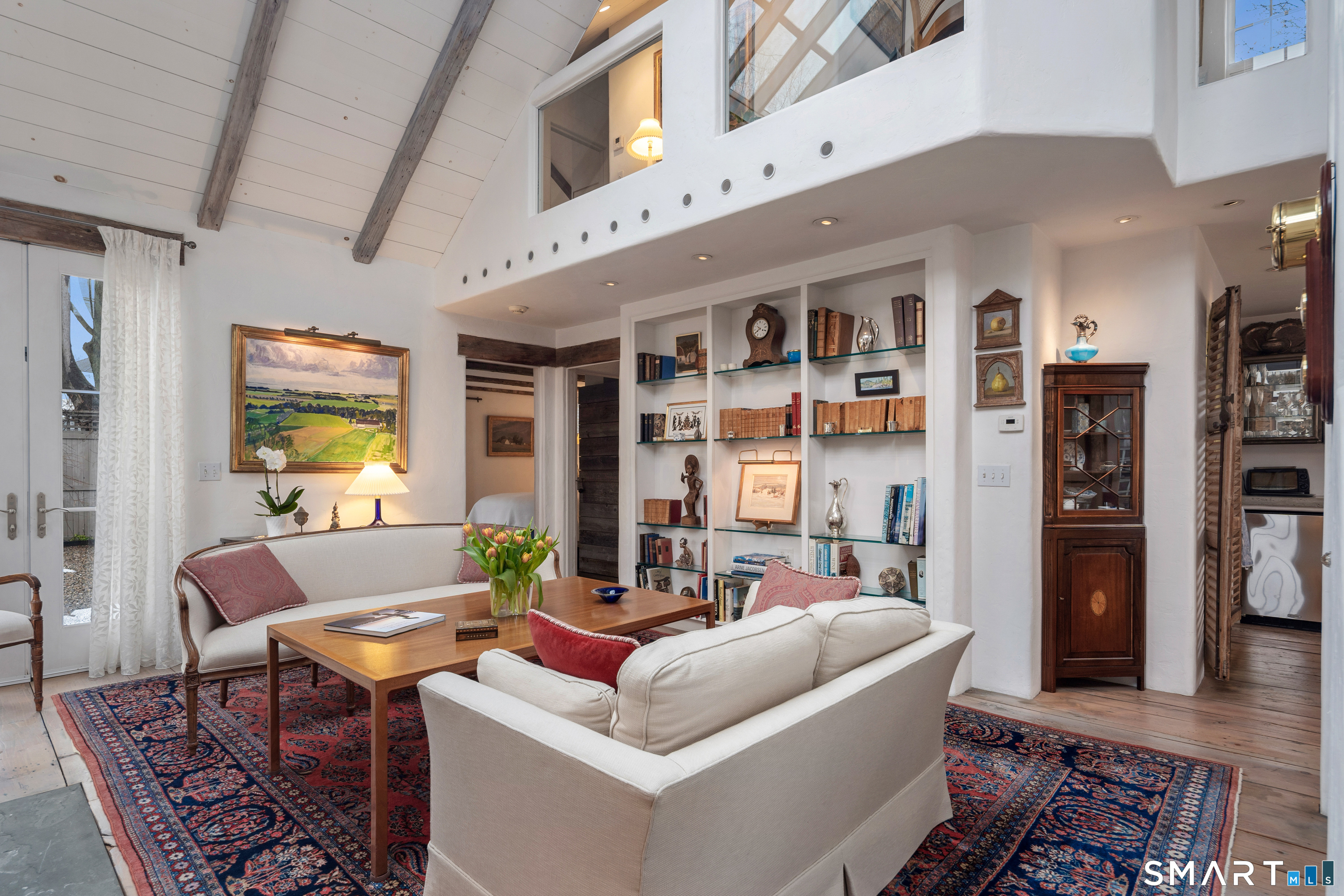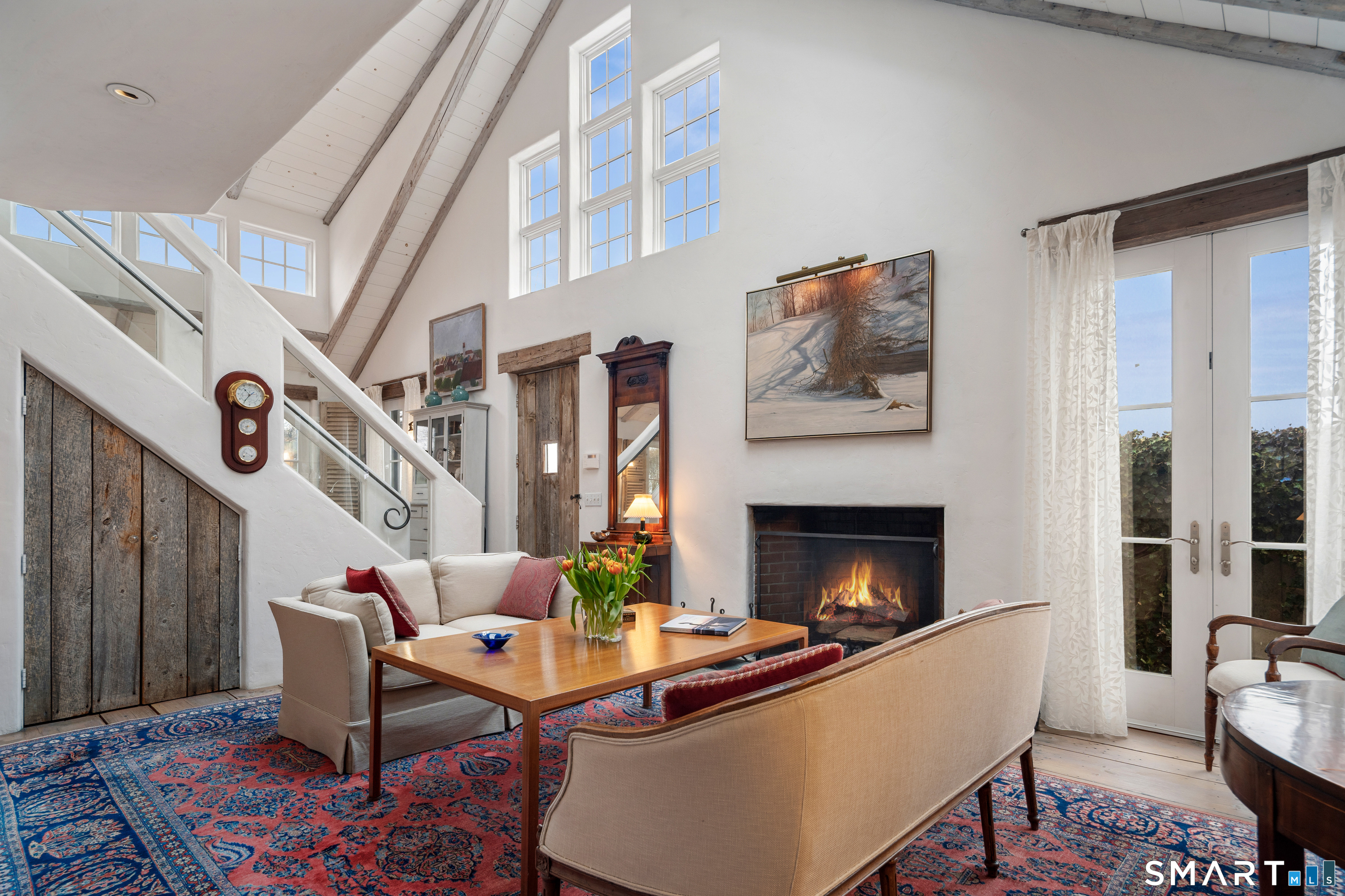 Step into this magical home and be transported to the South of France-Provence in Rowayton! Bathed in natural light, the residence blends refined, understated elegance with intimate yet open living spaces. Throughout the home, French doors open to serene outdoor settings including a koi pond, private sitting areas, and tranquil pebbled gardens. The main house features a beautiful living room with fireplace and soaring two-story ceiling, a charming Provencal-inspired dining room, and a thoughtfully designed kitchen. A 1st floor primary suite offers comfort and convenience, while the 2nd floor loft provides Five Mile River and treetop views along with an additional bedroom and full bath. "The Smithy," originally built in 1775 and completely rebuilt in 2002, is a charming detached structure offering a versatile office or studio space with full bath and its own private patio -perfect for guests, work-from-home, or creative pursuits. A delightful barn/garage features a lattice wall that welcomes natural light and frames views of the garden and wisteria vine. The entire property was thoughtfully designed by Barbara Garfield, celebrated for her distinctive attention to detail. Special features include wrought iron accents, random-width flooring, reclaimed wood and beams from historic barns in Connecticut and the South of France. All in the heart of Rowayton. Walk to shops, restaurants, beach, town dock, tennis, pickleball, library, dog park and train to NYC. Truly a special offering