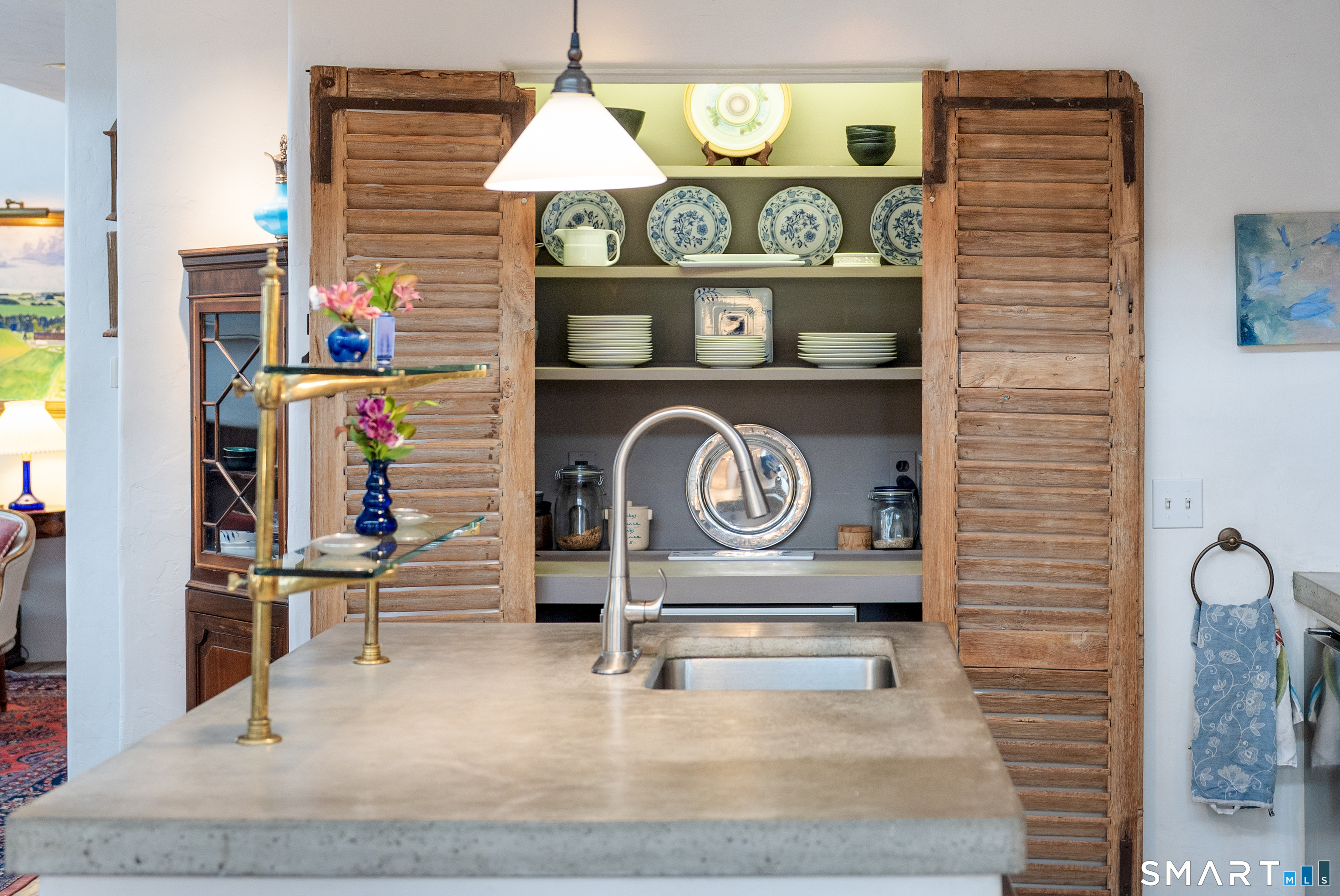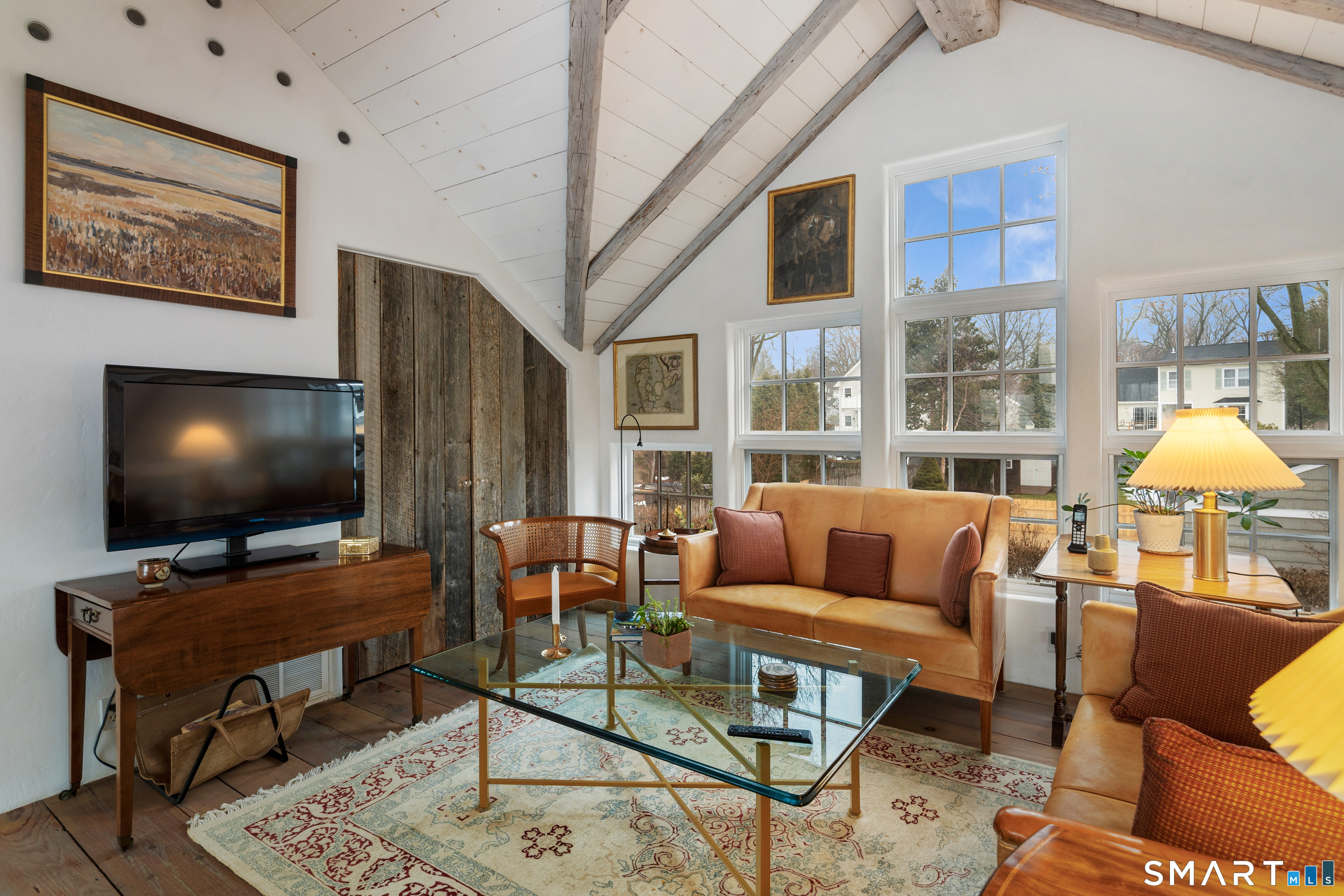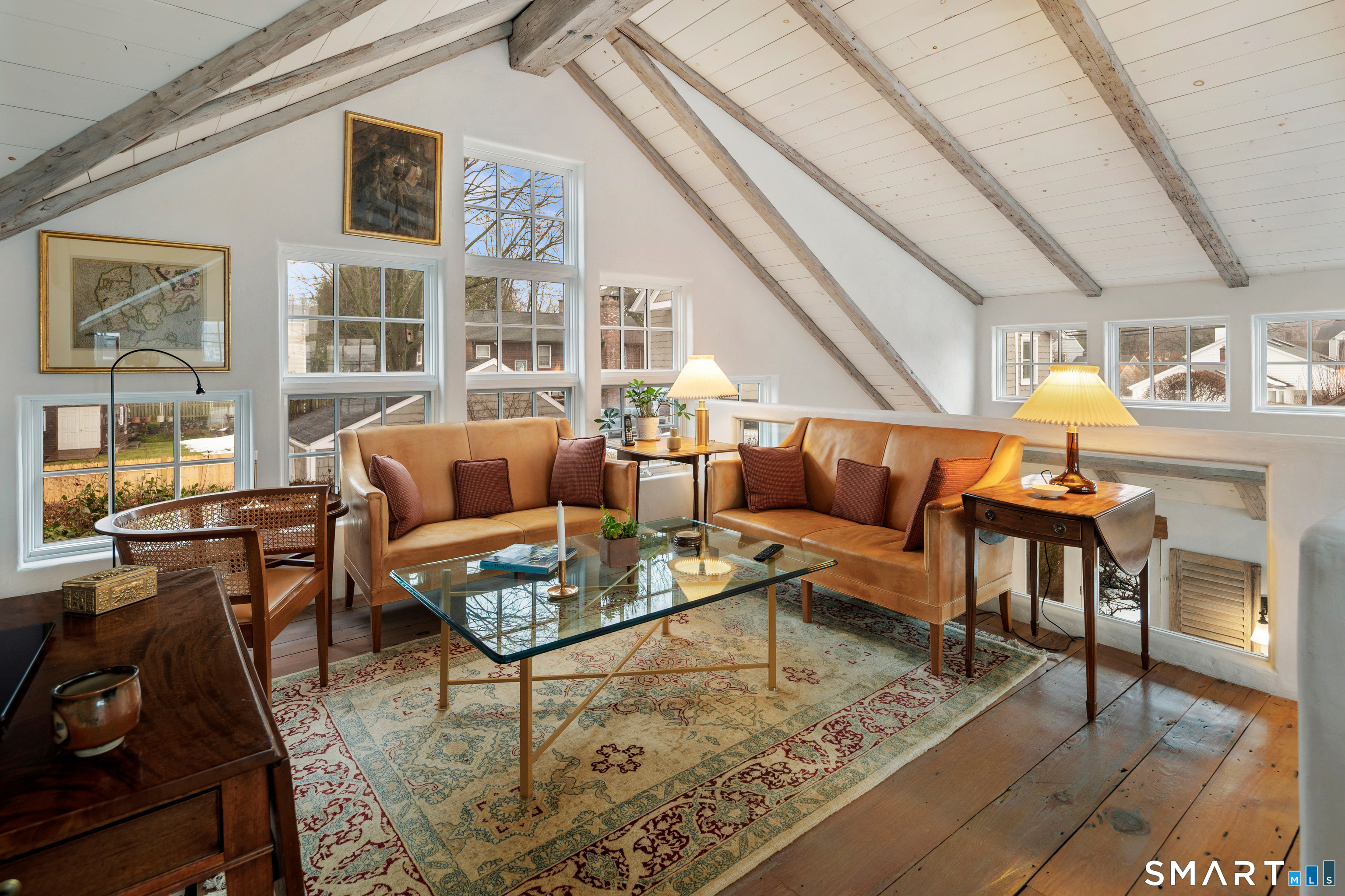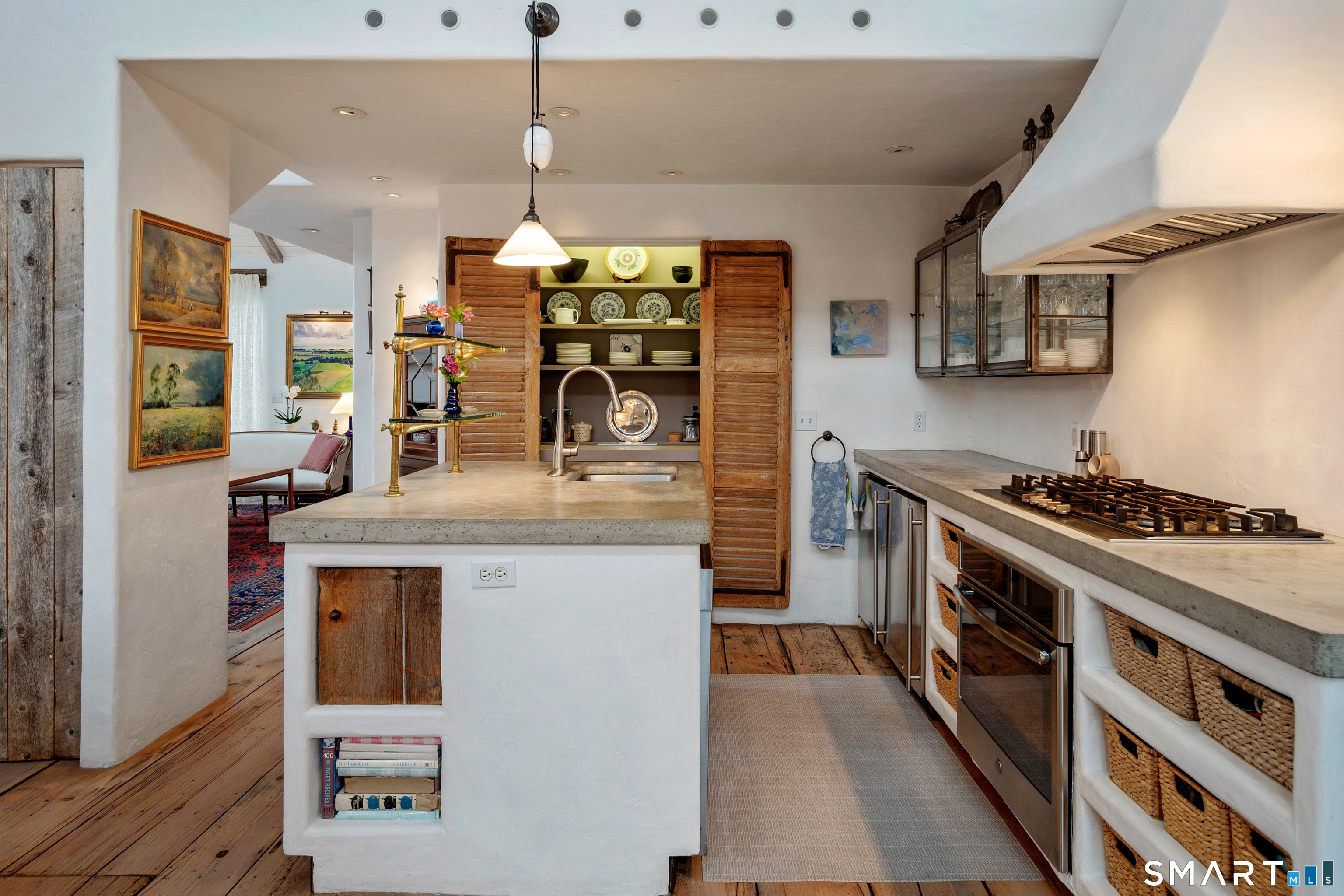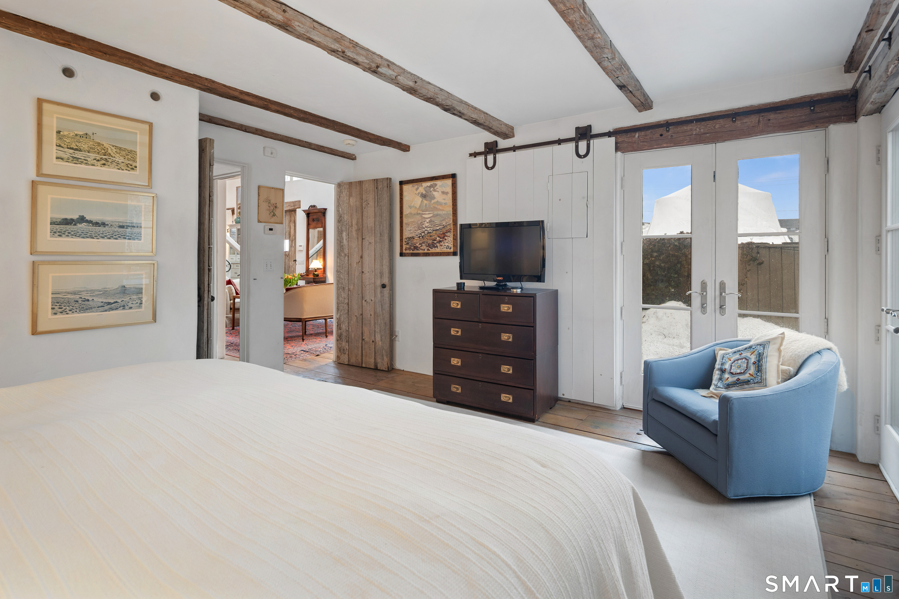 Step into this magical home and be transported to the South of France-Provence in Rowayton! Bathed in natural light, the residence blends refined, understated elegance with intimate yet open living spaces. Throughout the home, French doors open to serene outdoor settings including a koi pond, private sitting areas, and tranquil pebbled gardens. The main house features a beautiful living room with fireplace and soaring two-story ceiling, a charming Provencal-inspired dining room, and a thoughtfully designed kitchen. A 1st floor primary suite offers comfort and convenience, while the 2nd floor loft provides Five Mile River and treetop views along with an additional bedroom and full bath. "The Smithy," originally built in 1775 and completely rebuilt in 2002, is a charming detached structure offering a versatile office or studio space with full bath and its own private patio -perfect for guests, work-from-home, or creative pursuits. A delightful barn/garage features a lattice wall that welcomes natural light and frames views of the garden and wisteria vine. The entire property was thoughtfully designed by Barbara Garfield, celebrated for her distinctive attention to detail. Special features include wrought iron accents, random-width flooring, reclaimed wood and beams from historic barns in Connecticut and the South of France. All in the heart of Rowayton. Walk to shops, restaurants, beach, town dock, tennis, pickleball, library, dog park and train to NYC. Truly a special offering