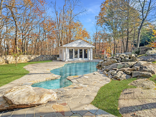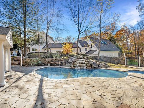 Sophisticated, timeless, and flawlessly reimagined, this 7,600 sq ft transitional Hamptons-style Colonial-Cape delivers luxury living with effortless ease. Offering 21 beautifully scaled rooms - including 5 spacious bedrooms, 6 full baths, and multiple inviting gathering spaces - this home balances grand entertaining with relaxed everyday comfort. Exquisite millwork, sleek transitional finishes, and four fireplaces create warmth throughout, while sunlit formal rooms flow seamlessly into casual living areas. The chef's kitchen with service galley anchors the home and opens naturally to outdoor spaces. Private retreats, work-from-home areas, and a separate in-law apartment with private entrance enhance the home's versatility. The grounds are exceptional - lush landscaping, fieldstone walls, tiered patios, a resort-style pool with spa and waterfall, a heated pool house, and an elevated firepit patio all offer unmatched outdoor living. Tucked up on a quiet cul-de-sac, this property blends true neighborhood charm with the privacy of its own enclave. A premier location, superb craftsmanship, and every modern amenity - this is refined living at its best. Discover the lifestyle awaiting you ... schedule your private tour today.