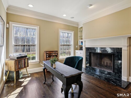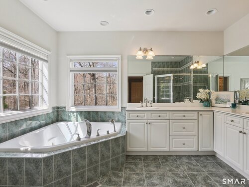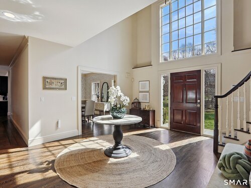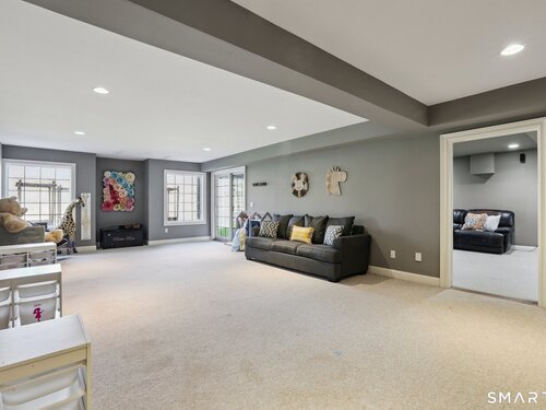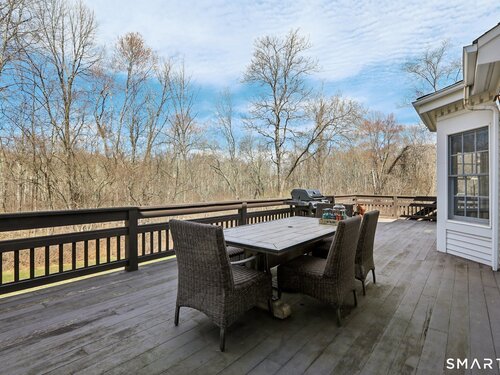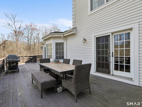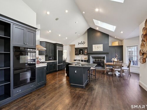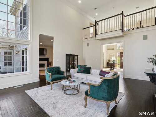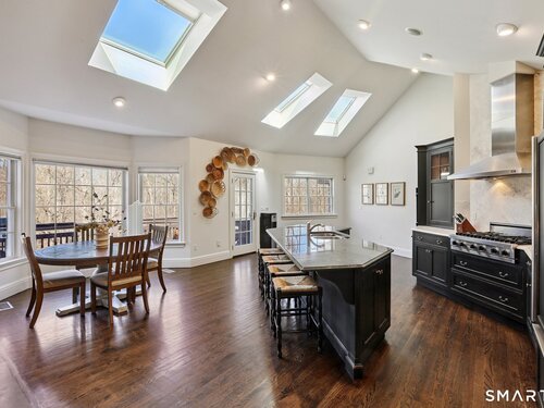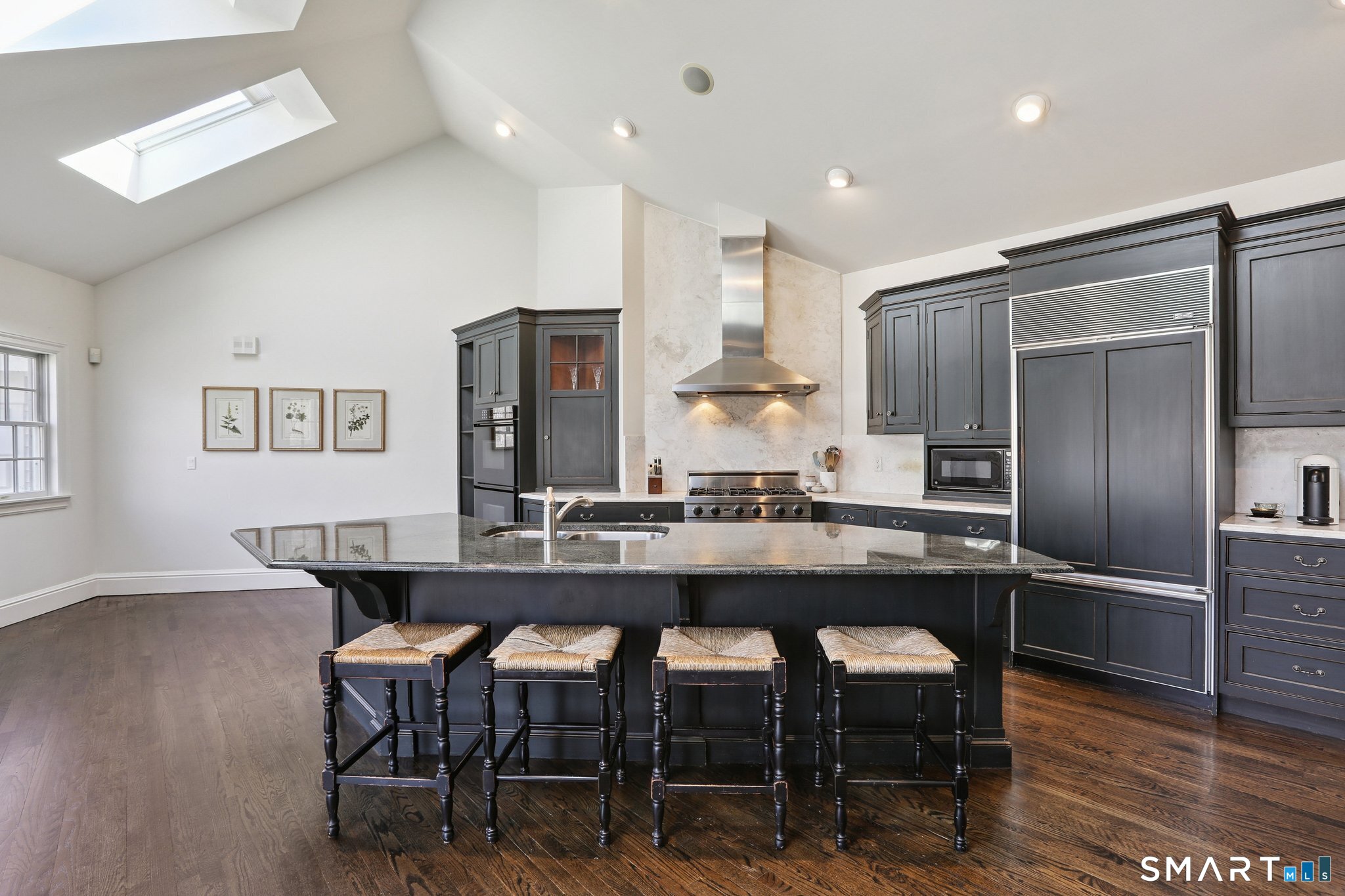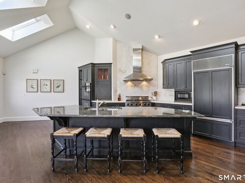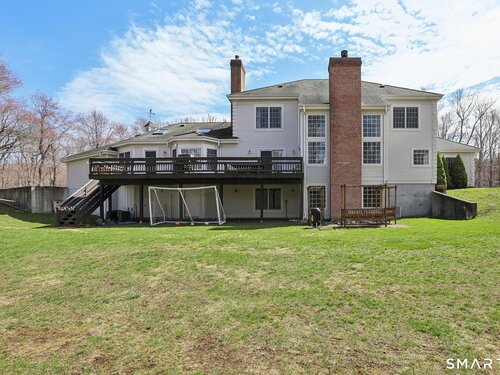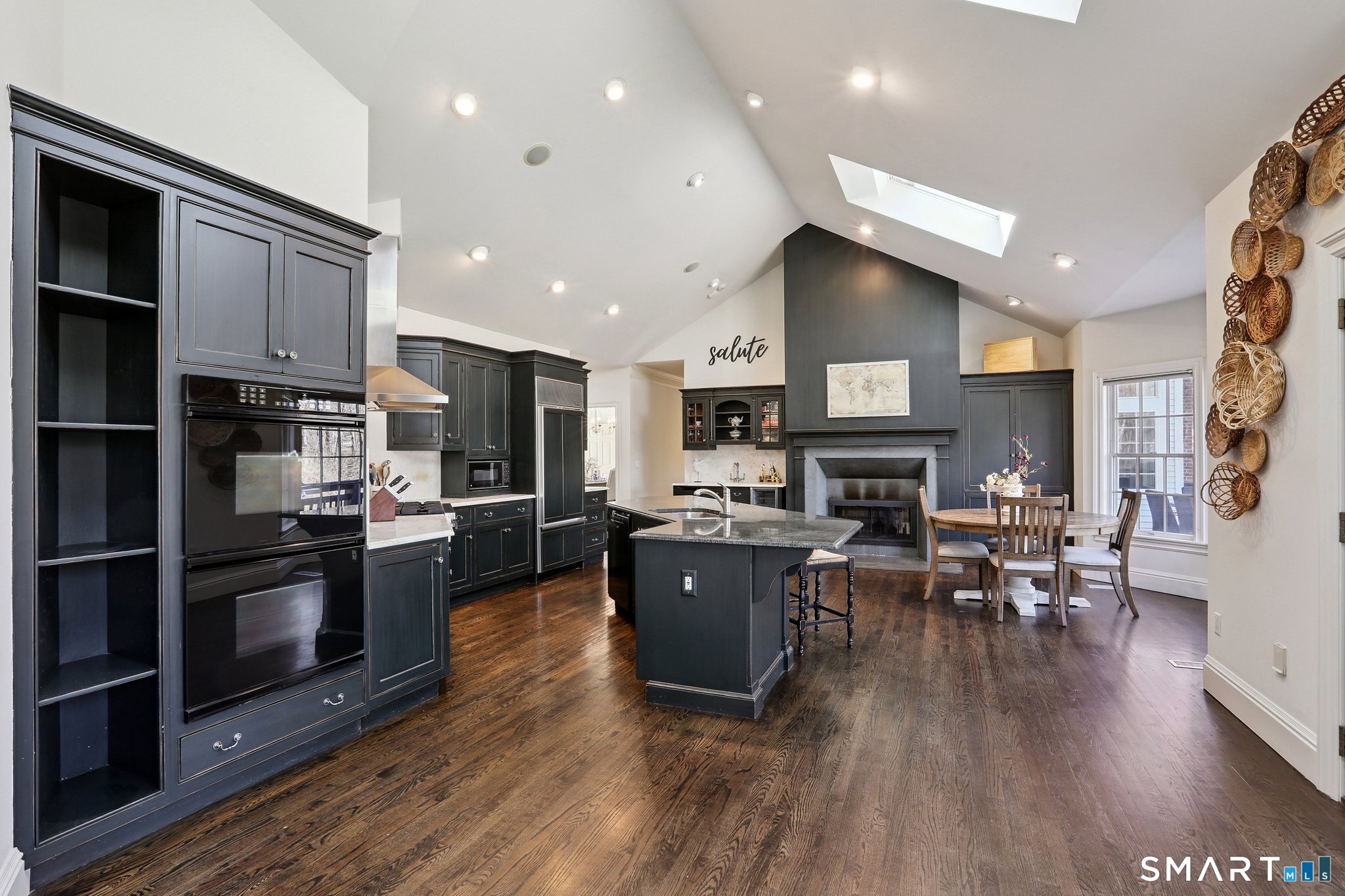 A dramatic two-story entry sets the tone, drawing your eye to the sun-drenched great room, where soaring ceilings and walls of glass frame ever-changing light. The eat-in kitchen with vaulted ceiling and skylights feels bright and inviting, complimented by premium appliances including a six-burner Viking cooktop, double ovens, Sub-Zero refrigerator, and Bosch dishwasher. A marble backsplash, expansive center island, and wet bar with beverage refrigerator complete the space. Designed for both everyday living and effortless entertaining, the kitchen flows into the family room with a striking double-sided fireplace, as well as the formal dining room. The main level primary features a vaulted ceiling, dual walk-in closets, and ensuite bath. The office offers a refined work-from-home setting, complete with custom built-ins and a marble fireplace. Upstairs, four bedrooms and two full baths are thoughtfully arranged into two suite-style layouts, offering flexibility for family, guests, or additional workspace. The finished walk-out lower level expands the home's versatility, featuring a large rec space and a separate area currently used as a media room, also ideal for an in-law or au pair suite with its own full bath. Outdoors, a full-length deck spans the rear of the home, accessible from both the kitchen and family room, creating seamless indoor-outdoor living. Located minutes from top-rated schools, golf, dining, shopping, and commuting routes.