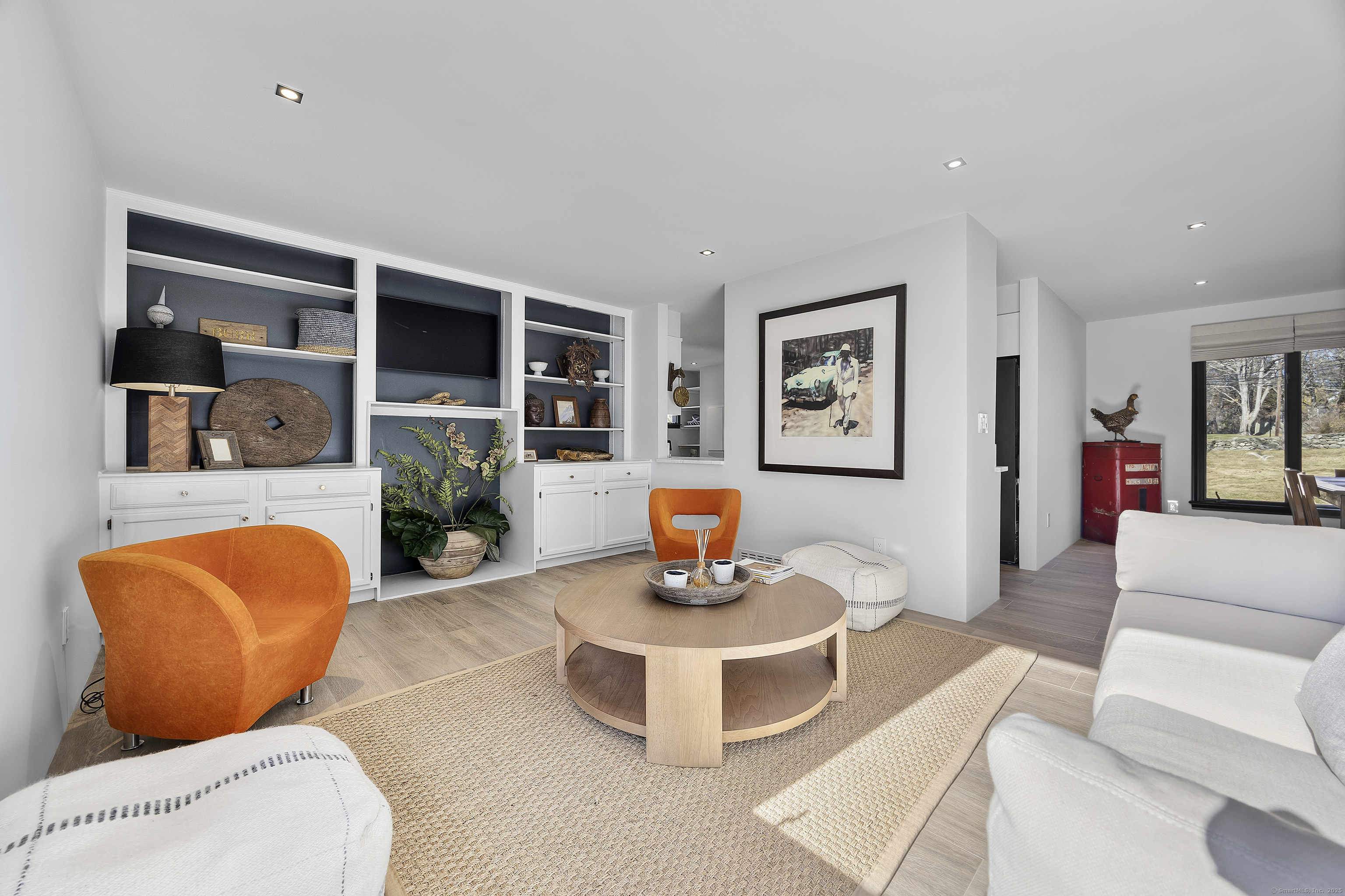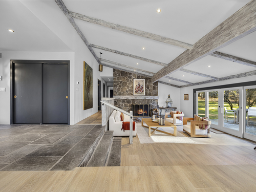Vaulted Ceiling, Beams, Fireplace, Patio/Terrace, Sliders, Tile Floor