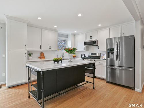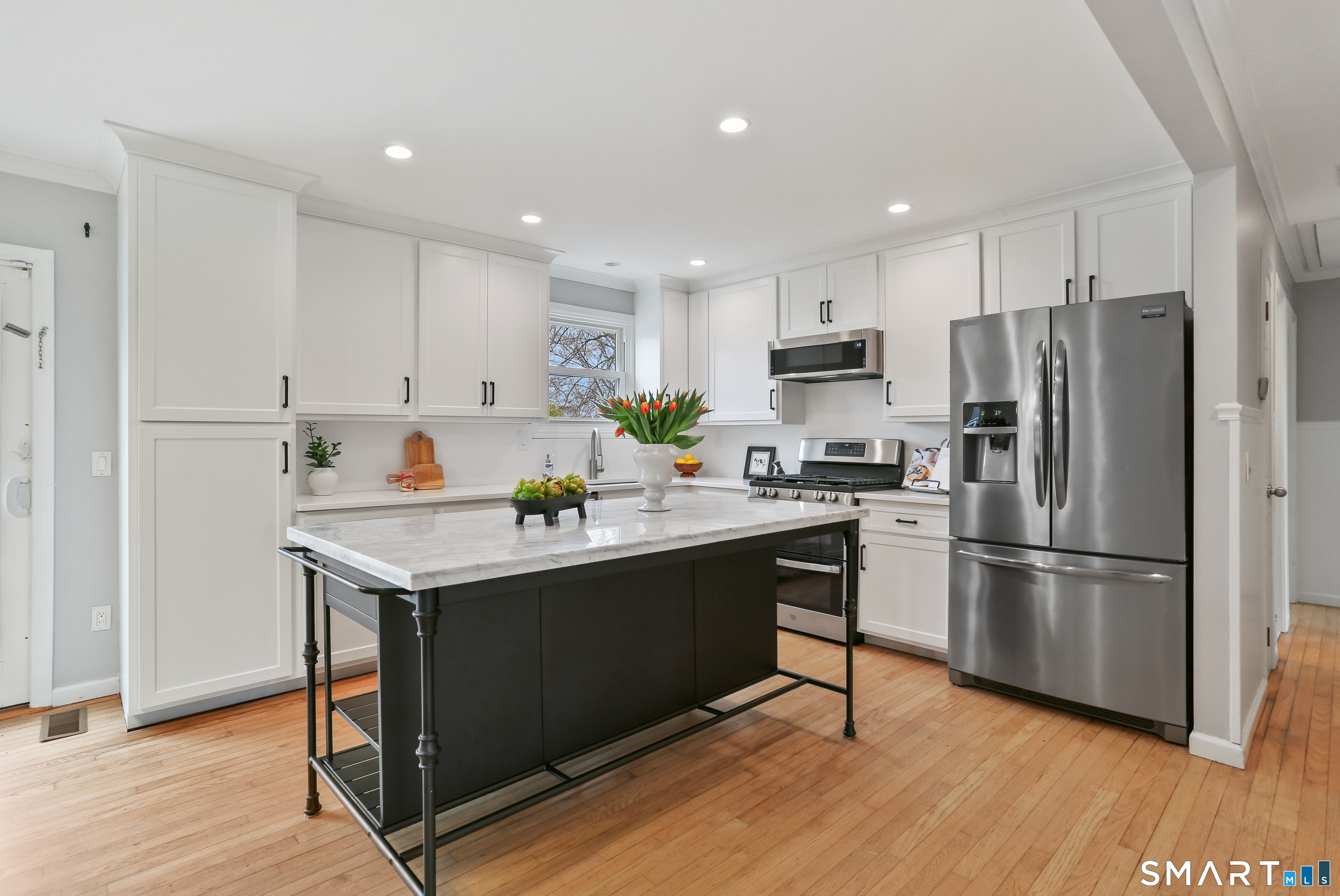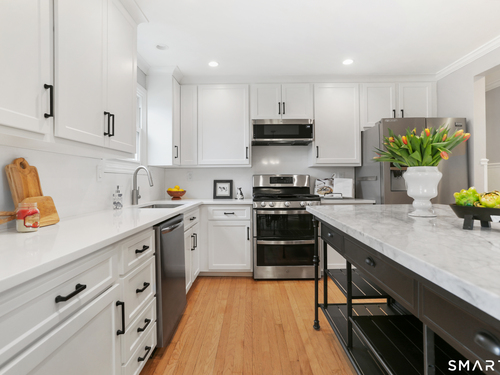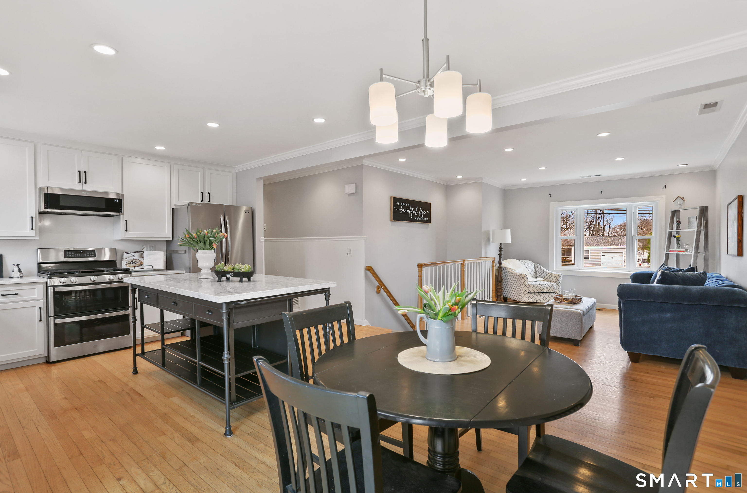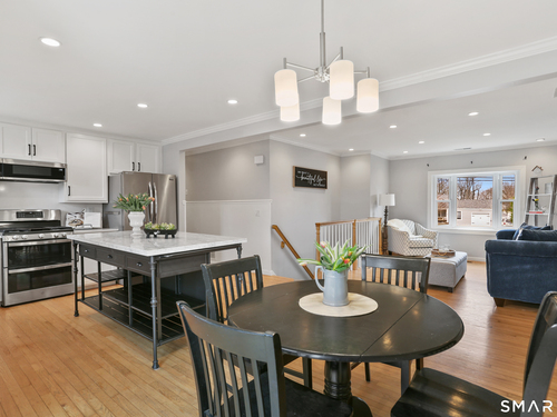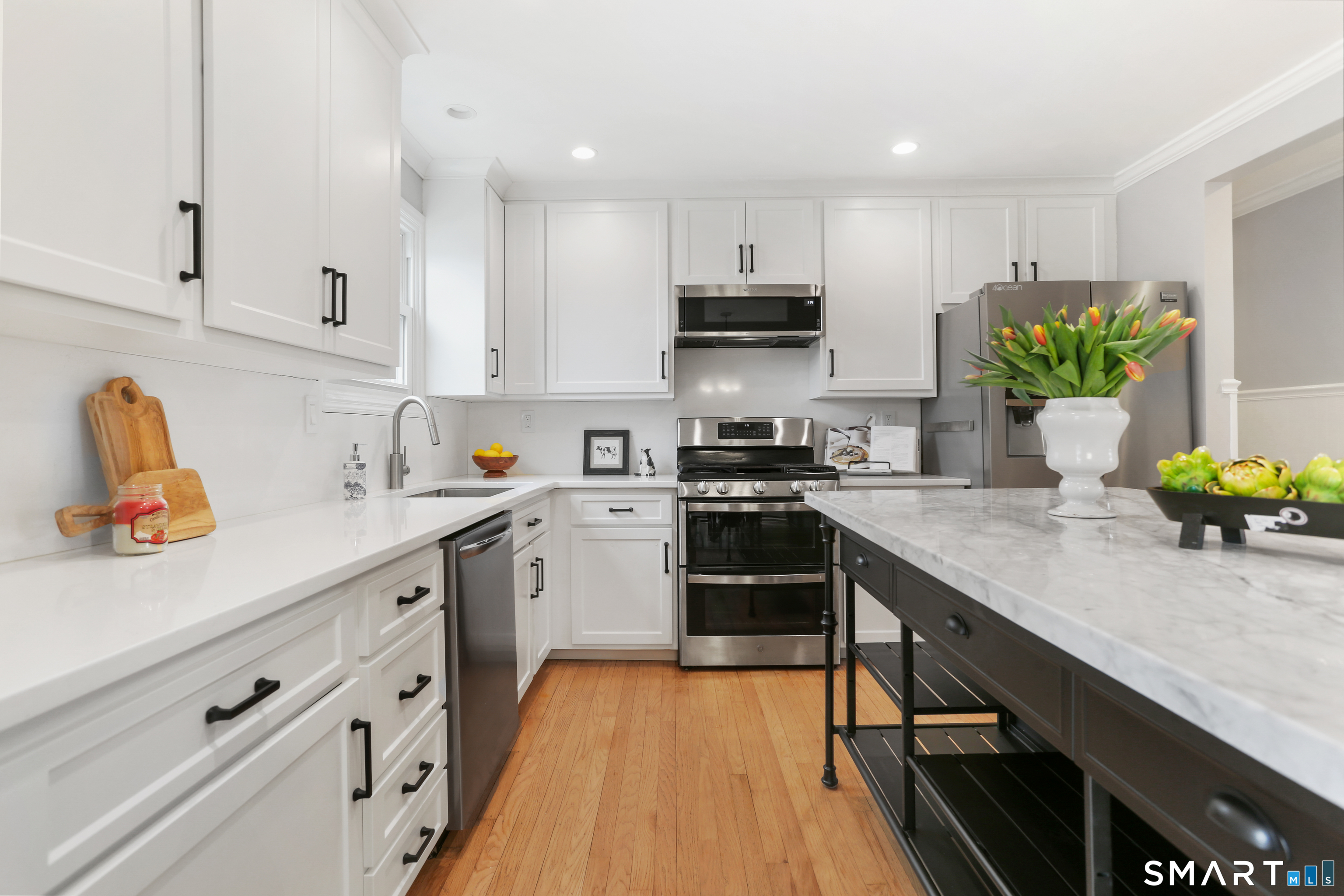 Welcome to this beautifully maintained Hi-Ranch in Norwalk, CT, offering the perfect blend of space, functionality, and modern updates. The upper level features an open-concept layout with an updated kitchen complete with stainless steel appliances and an oversized island that flows naturally into the living room. From the dining area you can step out onto a generously sized deck, great for entertaining and it also allows for great views of the beautiful sunsets. There are 3 generously sized bedrooms, and a full bathroom with a jetted tub to complete this level. The lower level features a fourth bedroom, spacious family room/playroom with sliding doors to a private patio, full bathroom, and laundry room - well-suited for guests, extended family, or an in-law setup. Additional highlights include hardwood floors throughout, central air, ample storage, 200-amp electrical service, an energy-efficient tankless hot water heater, and an oversized two-car garage with plenty of room for storage. Perfectly located within walking distance to all three schools and just minutes to major highways and the Metro North train station, this home offers both comfort and commuter convenience.