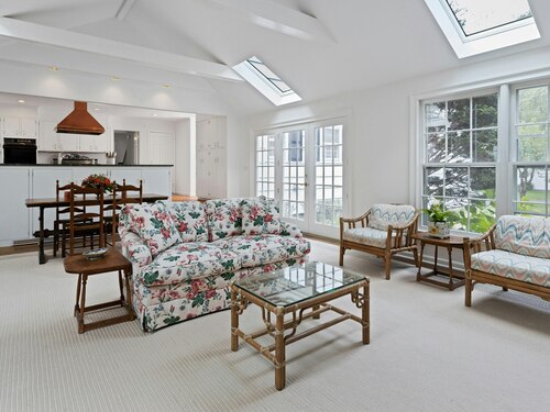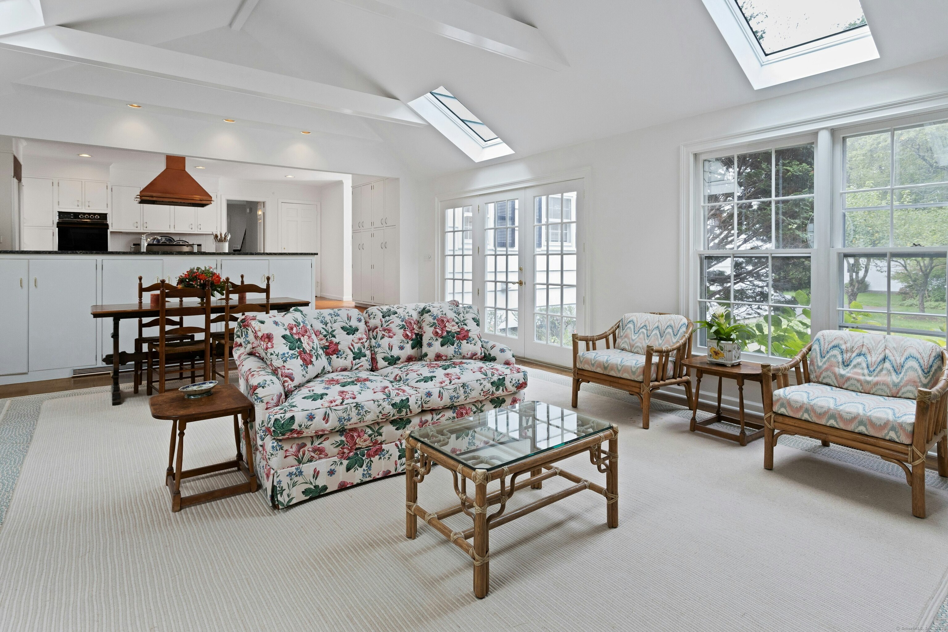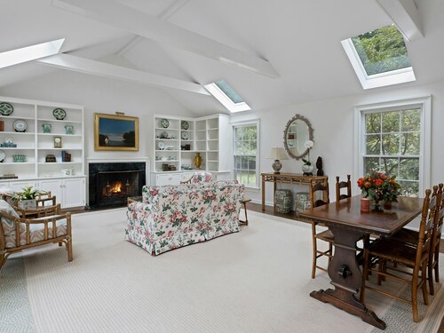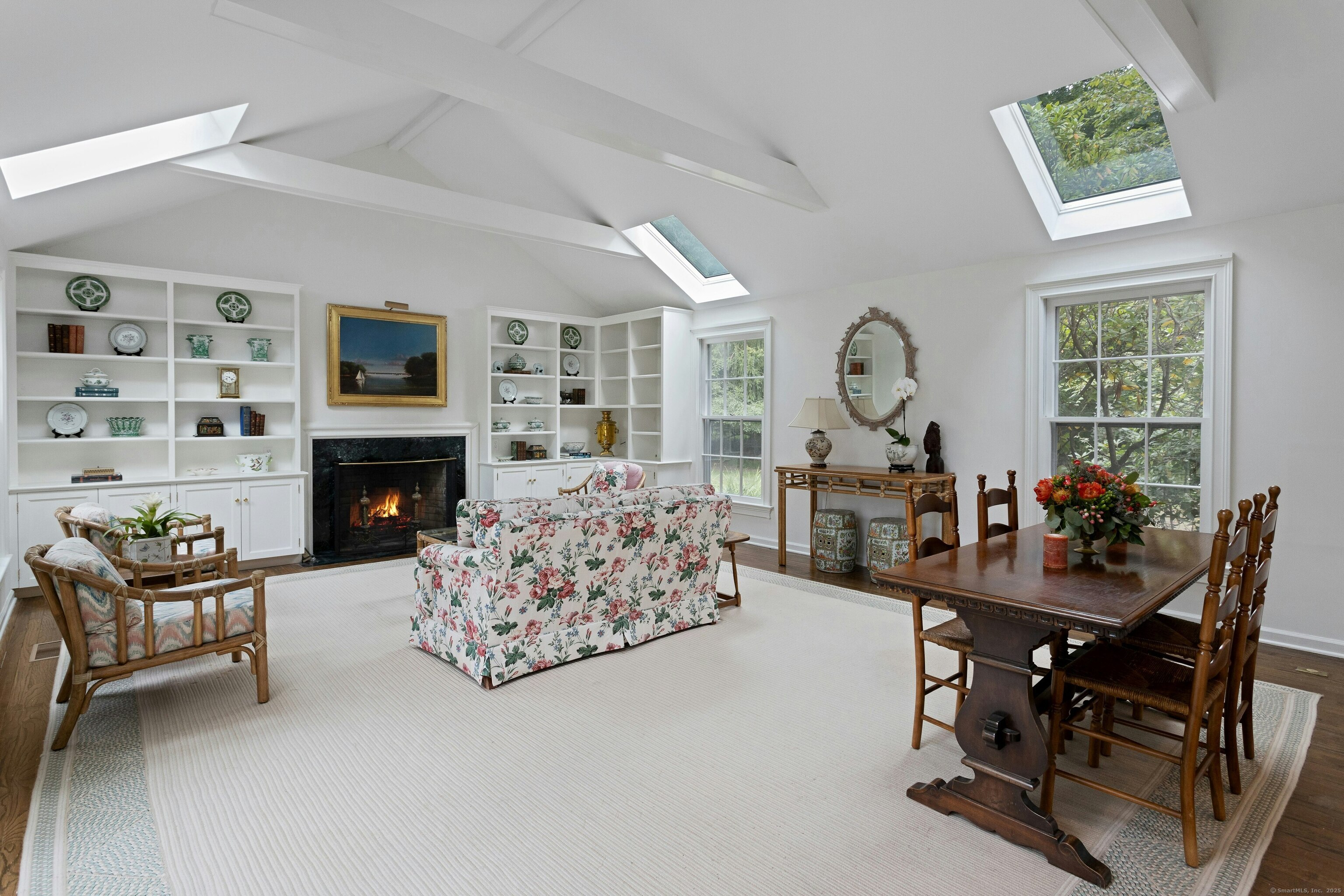 Skylight, Cathedral Ceiling, Beams, Fireplace, French Doors, Hardwood Floor