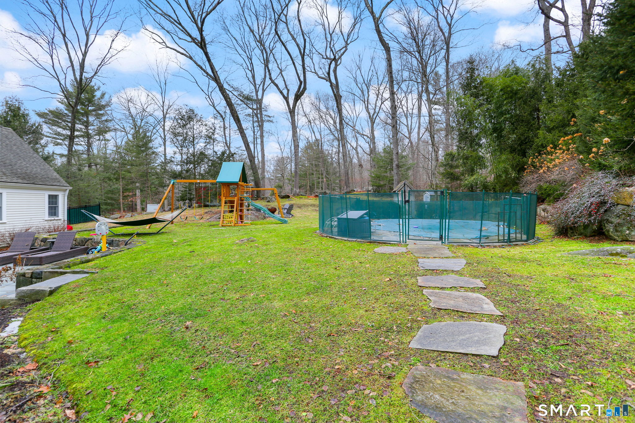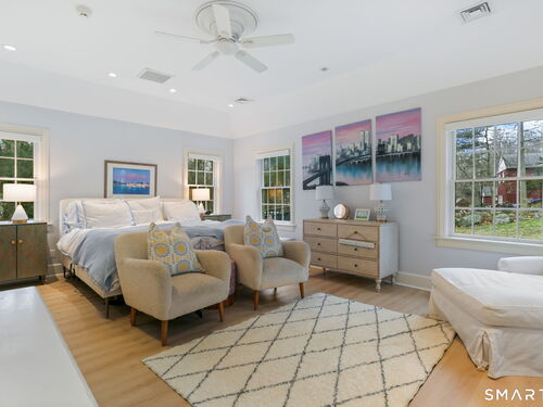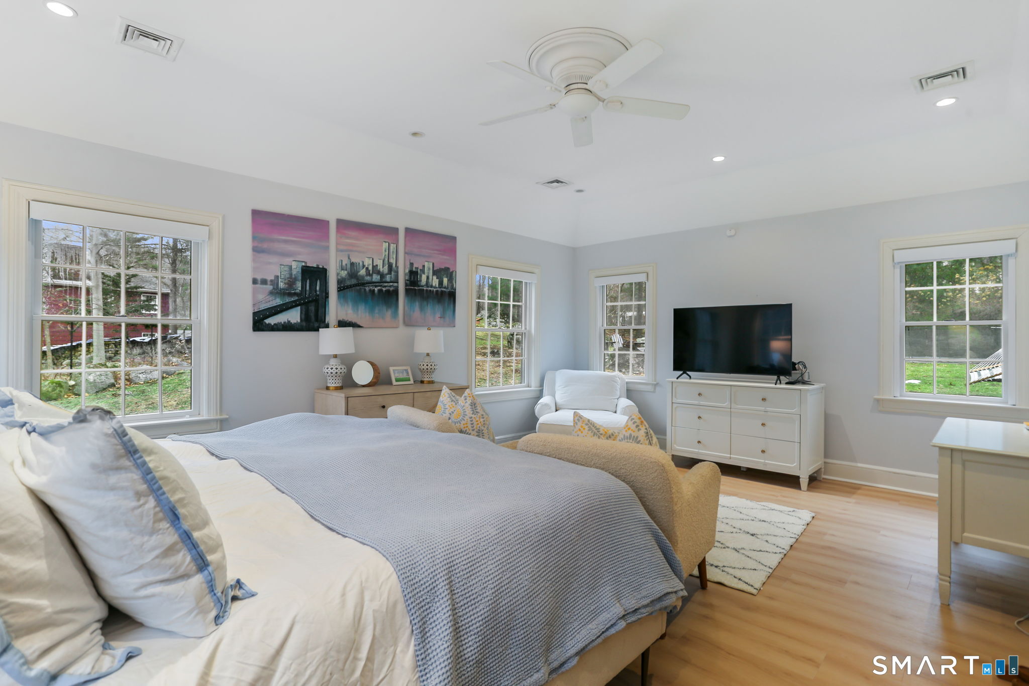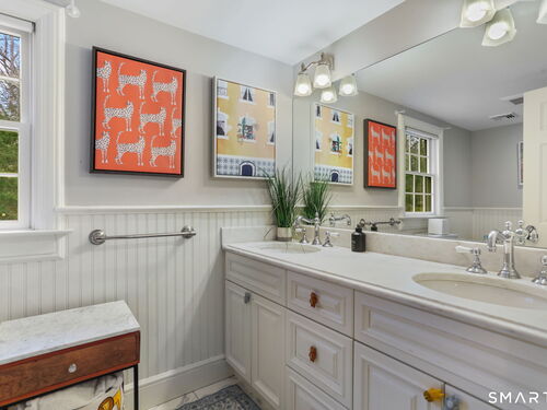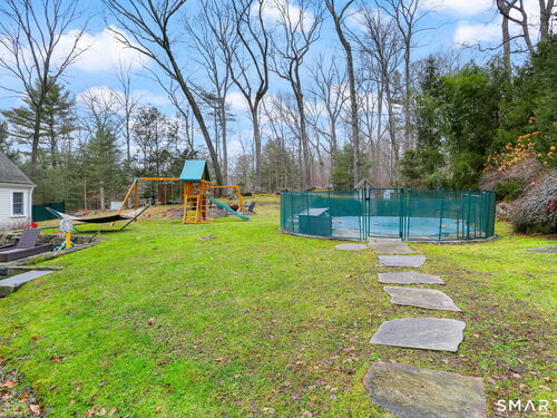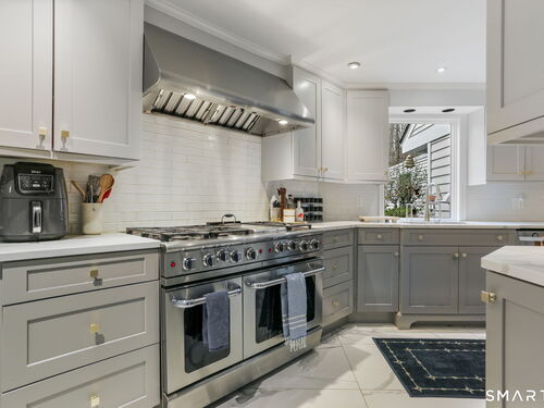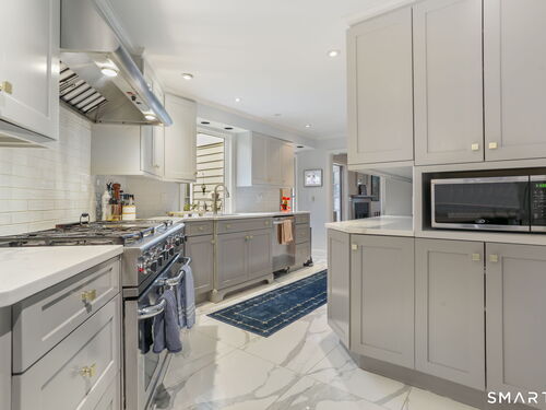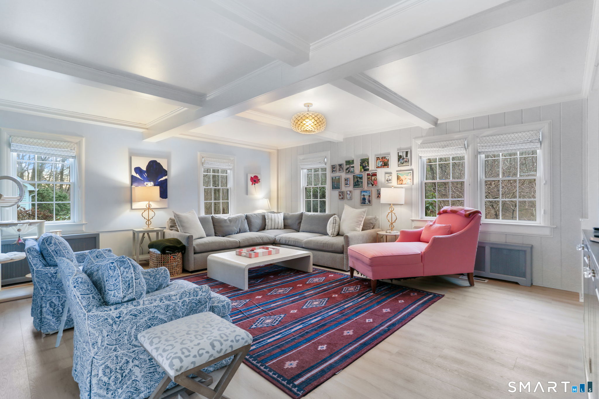 Beautifully updated 4-bedroom home with 4 full baths, set on a private, park-like acre in one of North Stamford's most convenient neighborhoods. The thoughtfully designed layout features a gracious formal living room with fireplace and an oversized dining room with fireplace-ideal for both elegant entertaining and everyday gatherings. The heart of the home is the expansive family room, filled with natural light from abundant windows and skylights, and offering seamless access to the patio, beautifully landscaped backyard, and pool. The updated eat-in kitchen is a chef's delight, featuring quartz countertops, a high-end stainless-steel gas range, and direct walkout access to the patio for easy indoor-outdoor living. A full bath conveniently located off this area is perfect for pool guests. The main level also boasts a luxurious primary suite complete with two generous walk-in closets and an oversized spa-like bathroom with soaking tub and steam shower. Upstairs, you'll find a spacious bedroom with en-suite bath, two additional well-sized bedrooms, and finished storage space. Outside, the private backyard retreat shines with a heated, saltwater in-ground gunite pool and mature landscaping that creates a serene escape. Additional highlights include a detached two-car garage and a full-house generator.