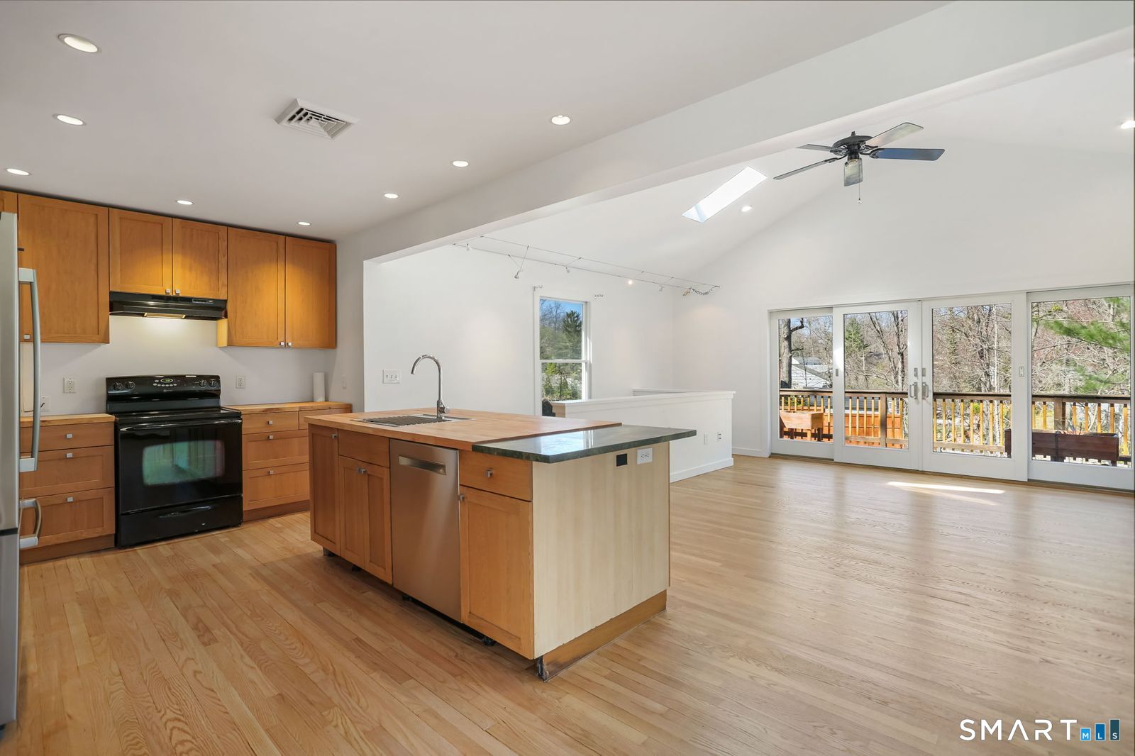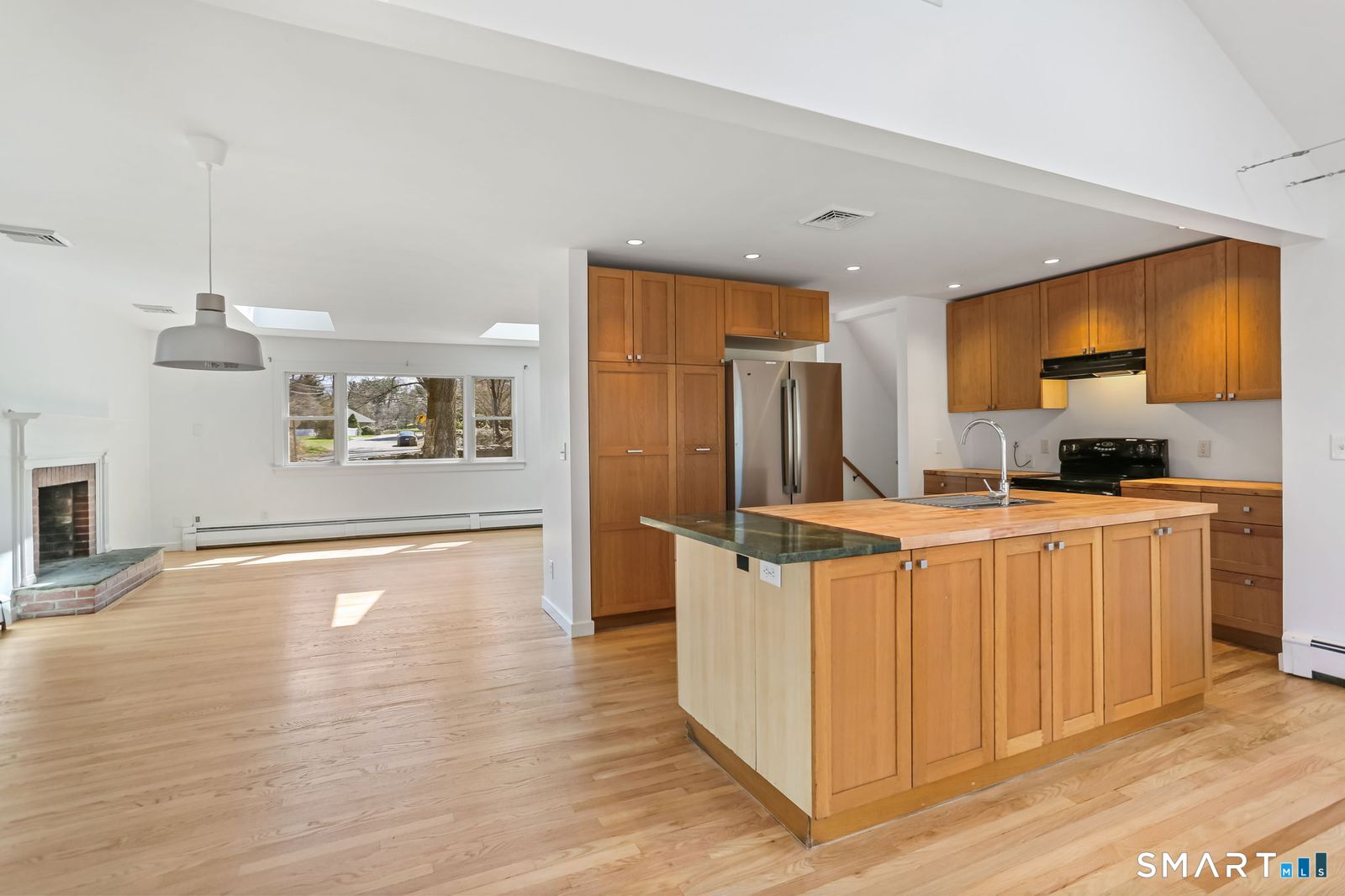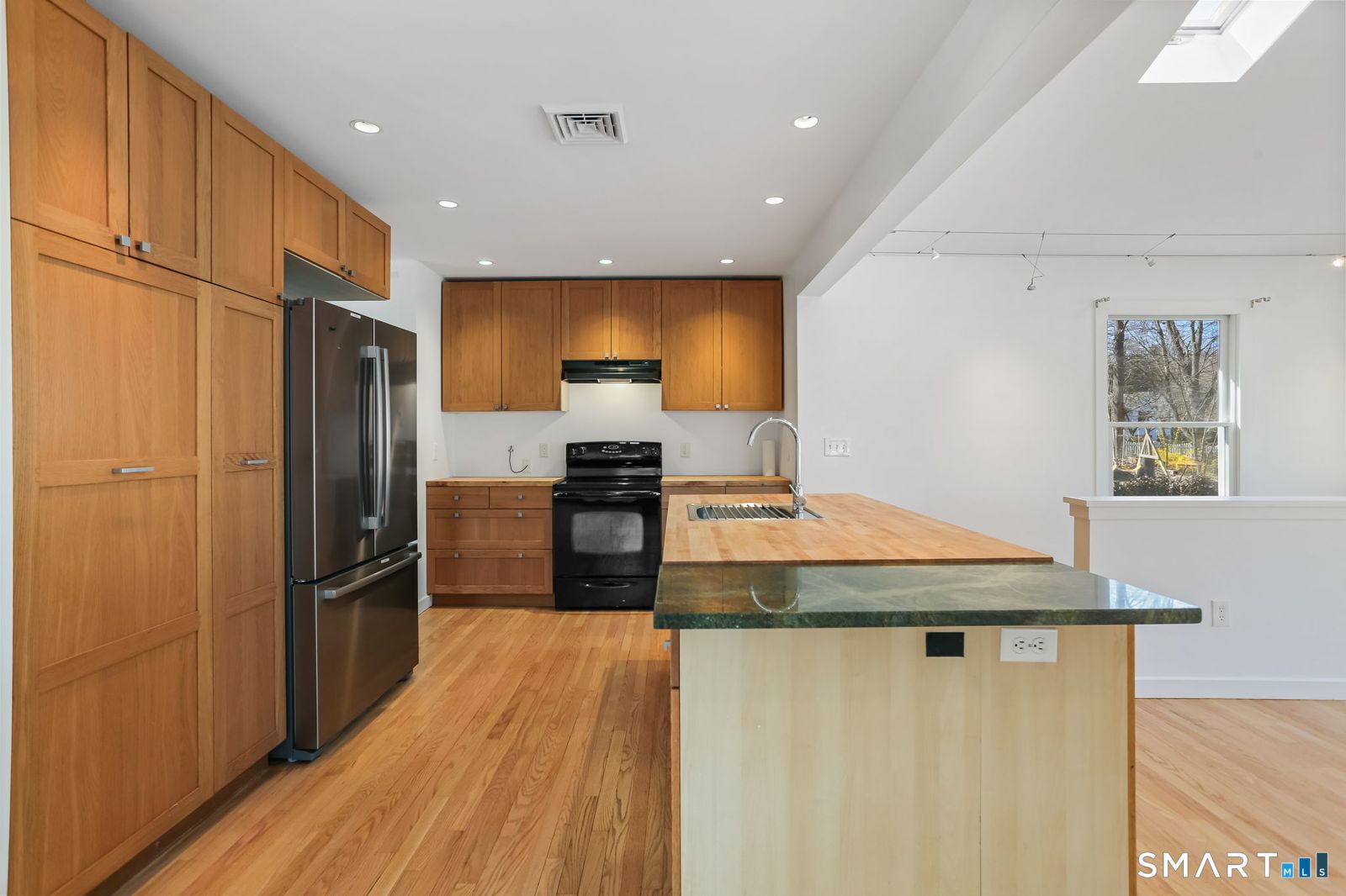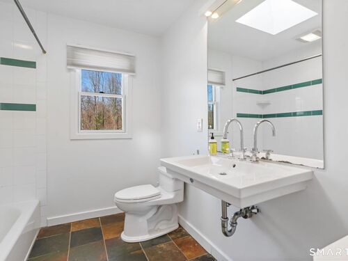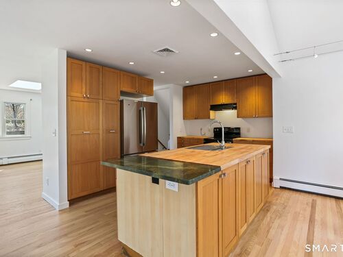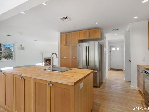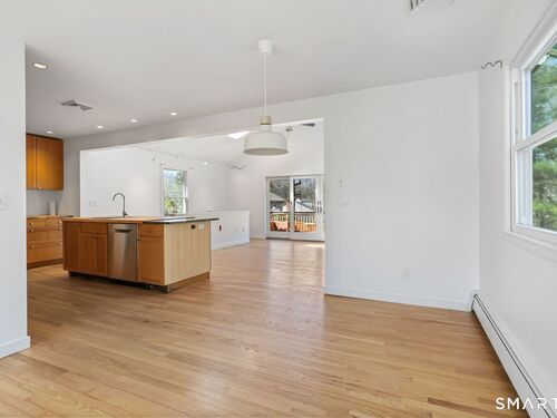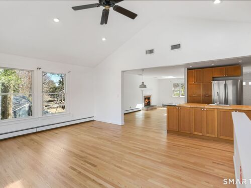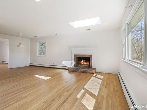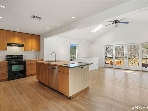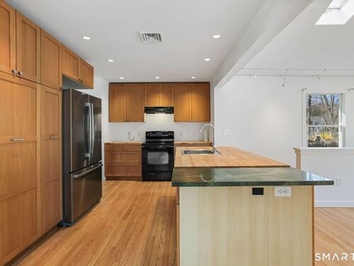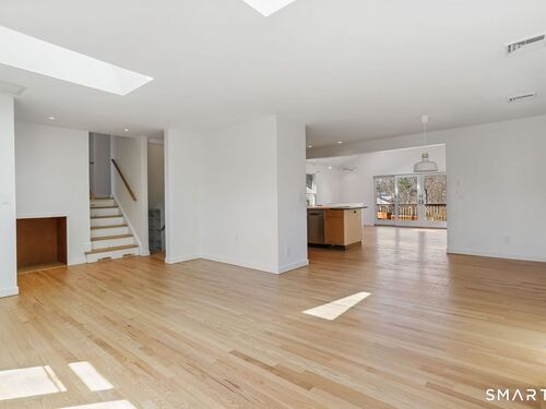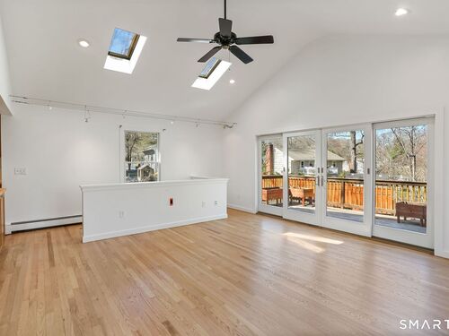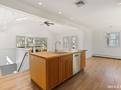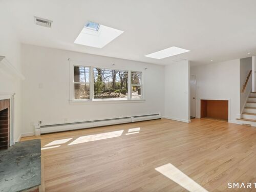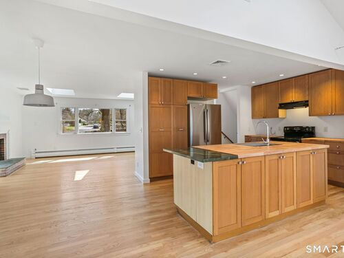 Welcome to 140 Ponus Avenue, a sun-filled 4-bedroom split-level in desirable West Norwalk. This meticulously maintained 2,200+ sq ft home sits on a peaceful 0.36-acre lot with a fenced backyard overlooking beautiful woods, creating a private retreat. Enter through the central foyer and step into an impressive open floor plan connecting the living room with fireplace and skylights to the dining area, and completely renovated kitchen featuring butcher block countertops, center island with Bosch dishwasher, pull-out pantry cabinets with oak doors, and 2021 Bosch three-door refrigerator. The family room has cathedral ceilings and more skylights and flows from the kitchen seamlessly. It opens to the yard with a large wall of windows and a slider to a 2018 cedar deck. The upstairs has 3 bedrooms and another updated full bath. With a completely unique layout, two lower levels expand your living space with two recreation rooms or a fourth bedroom, a full bathroom with slate flooring, oversized walk-in shower, and Dornbracht fixtures, laundry room/bathroom, and ample storage. This home has been loved and upgraded extensively: 2017 roof, 2019 C/A, 2021 boiler and hot water system with zoned heating, 2023 Andersen windows, 2022 electric car charger, 2024 driveway work, 2025 new fence, and 2026 refinished floors and fresh paint throughout (and more). The circular driveway and extra basement storage add convenience. A rare find that's move-in ready close to everything you may need!