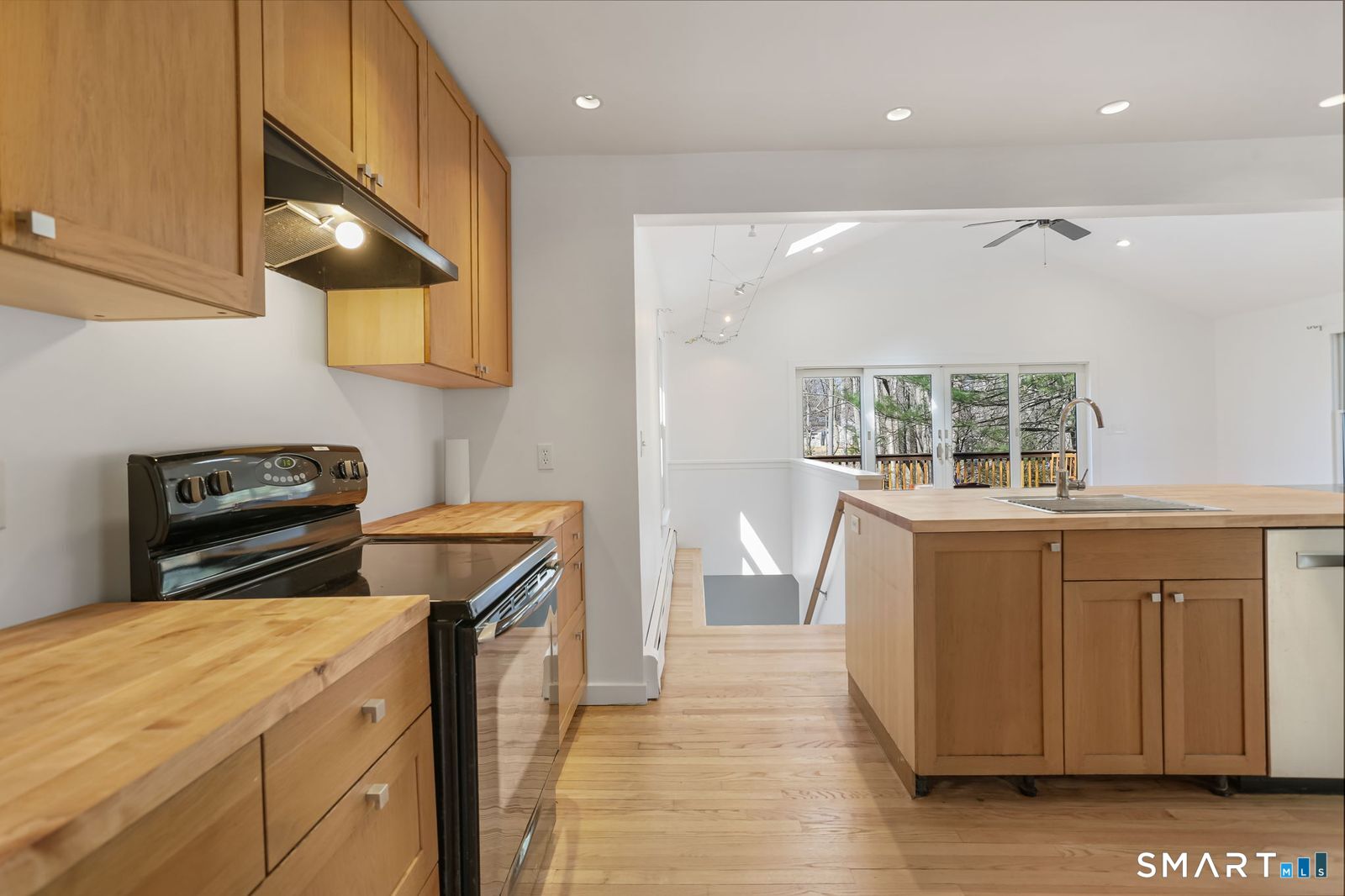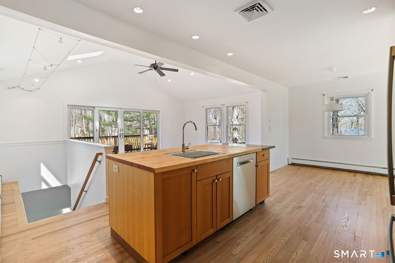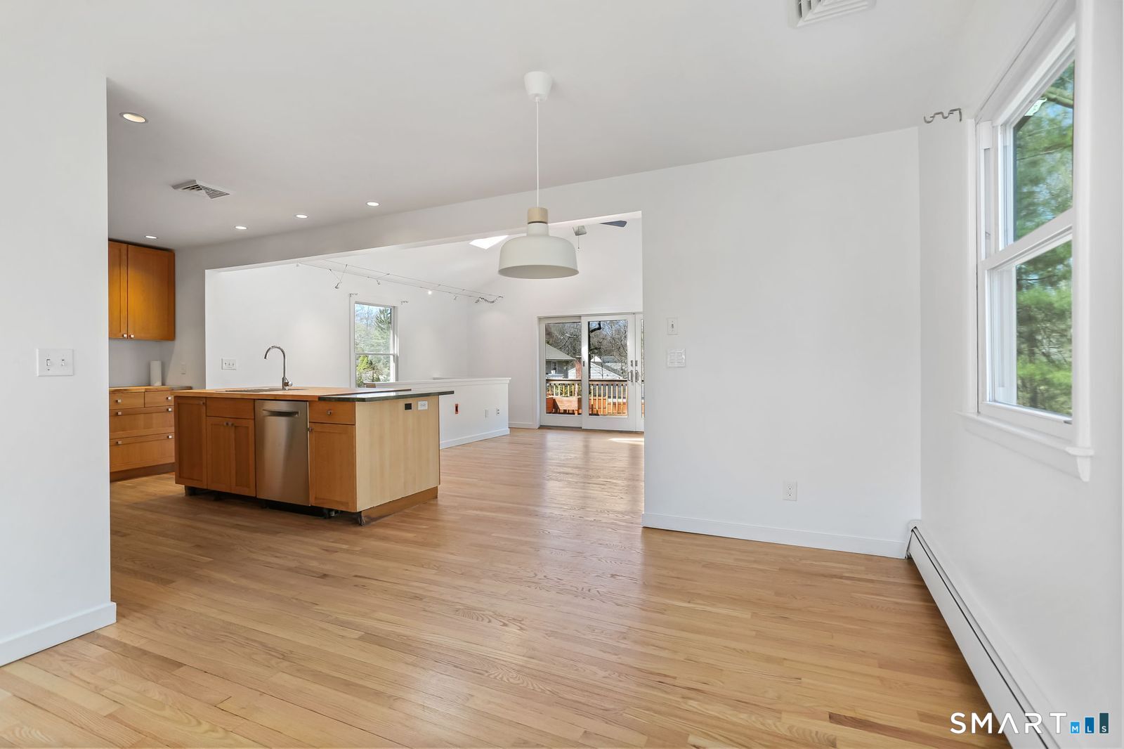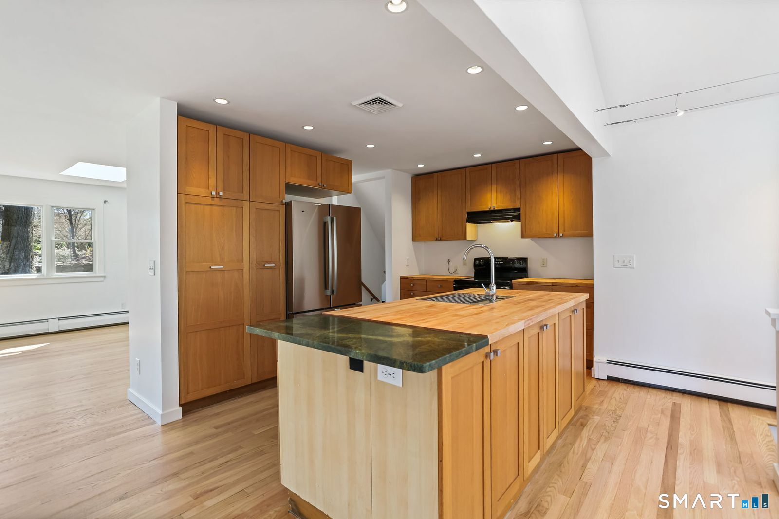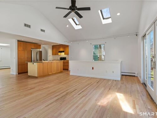 Welcome to 140 Ponus Avenue, a sun-filled 4-bedroom split-level in desirable West Norwalk. This meticulously maintained 2,200+ sq ft home sits on a peaceful 0.36-acre lot with a fenced backyard overlooking beautiful woods, creating a private retreat. Enter through the central foyer and step into an impressive open floor plan connecting the living room with fireplace and skylights to the dining area, and completely renovated kitchen featuring butcher block countertops, center island with Bosch dishwasher, pull-out pantry cabinets with oak doors, and 2021 Bosch three-door refrigerator. The family room has cathedral ceilings and more skylights and flows from the kitchen seamlessly. It opens to the yard with a large wall of windows and a slider to a 2018 cedar deck. The upstairs has 3 bedrooms and another updated full bath. With a completely unique layout, two lower levels expand your living space with two recreation rooms or a fourth bedroom, a full bathroom with slate flooring, oversized walk-in shower, and Dornbracht fixtures, laundry room/bathroom, and ample storage. This home has been loved and upgraded extensively: 2017 roof, 2019 C/A, 2021 boiler and hot water system with zoned heating, 2023 Andersen windows, 2022 electric car charger, 2024 driveway work, 2025 new fence, and 2026 refinished floors and fresh paint throughout (and more). The circular driveway and extra basement storage add convenience. A rare find that's move-in ready close to everything you may need!