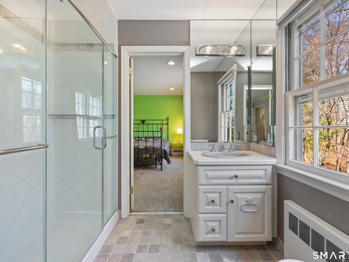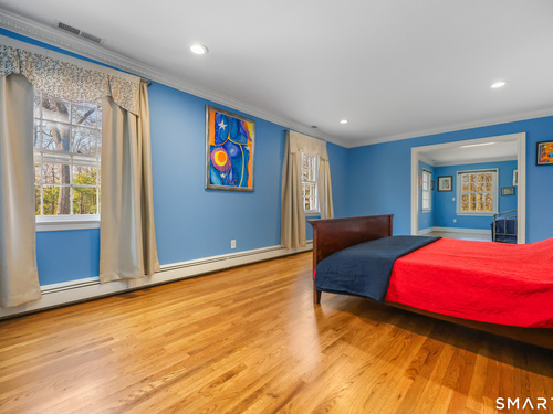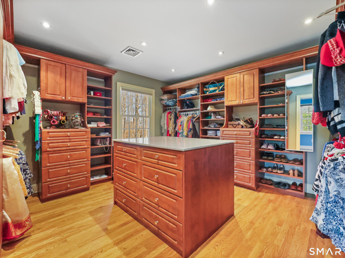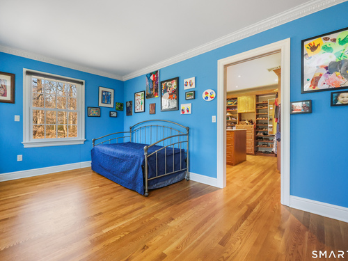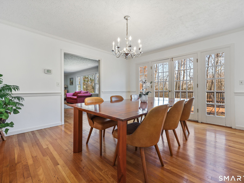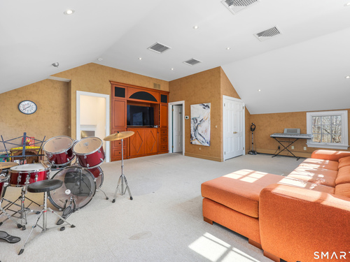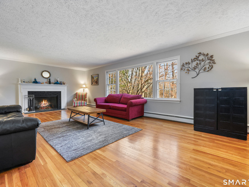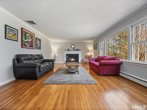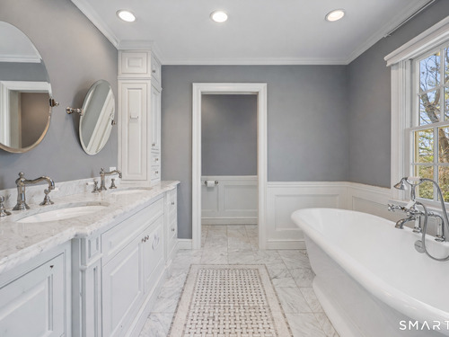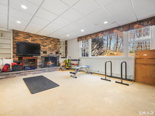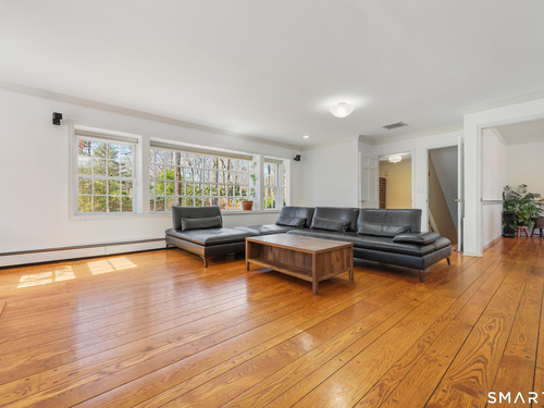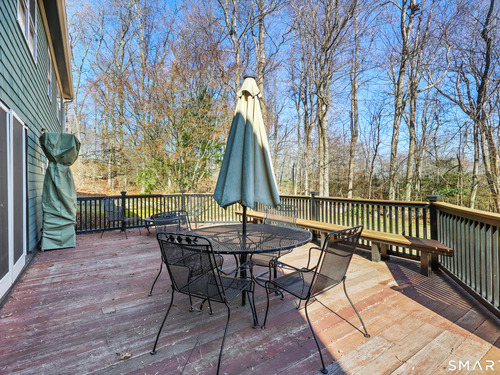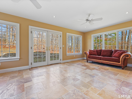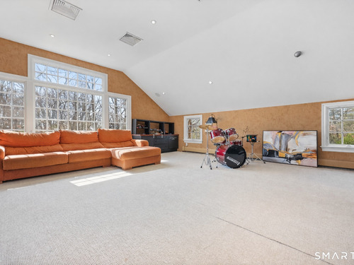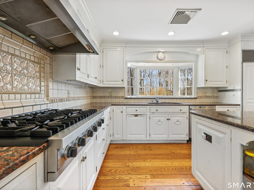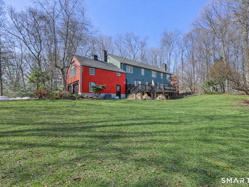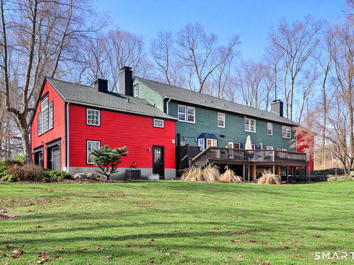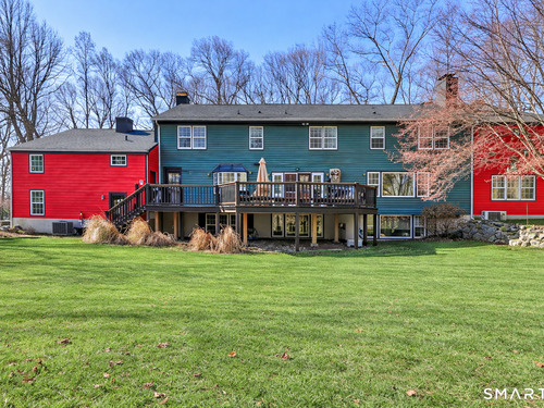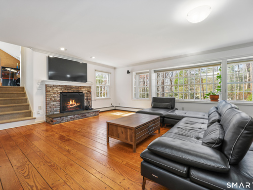 Tucked away on 2.18 private acres, this beautifully designed 5-bedroom, 6-bathroom home offers exceptional space, natural light, and a layout ideal for both everyday living and entertaining. Discover hardwood floors and a thoughtfully designed main level. The open kitchen flows seamlessly into the family room, anchored by a fireplace that creates a warm gathering space. A sun-filled den with a wall of windows and custom built-ins provides the perfect place to relax or work from home. Adjacent, convenient laundry room and half bath. The first floor includes a private home office with wet bar, spacious sunroom with tile flooring that brings the outdoors in. For entertaining, the formal living room with fireplace and elegant dining room open directly to a large deck overlooking the expansive property, creating effortless indoor-outdoor living. Upstairs, the primary suite offers a true retreat, featuring a spa-inspired bath with double sinks, soaking tub, separate shower, and dressing room with walk-in closet. Two bedrooms share a full bath, while two additional bedrooms and another hall bath provide comfortable accommodations for family and guests. The fully finished walk-out lower level with fireplace adds exceptional versatility-perfect for a recreation space, media room, gym, or additional entertaining area. A walk-up attic provides valuable storage and potential expansion. Located in a desirable Wilton setting, combining privacy, space, and classic New England comfort