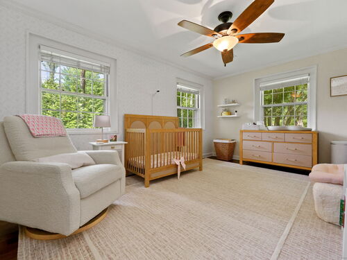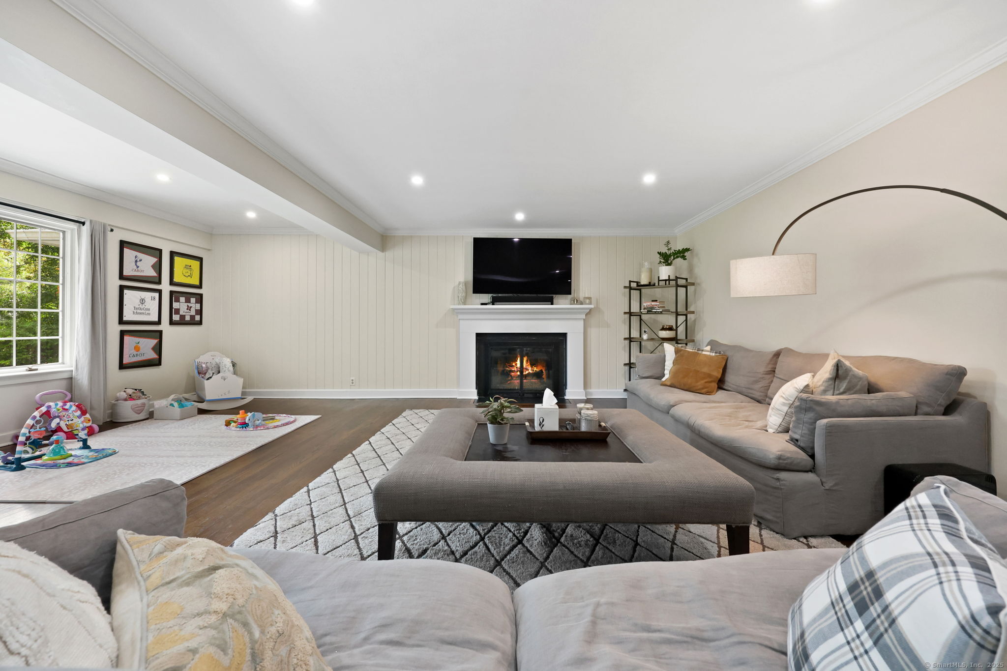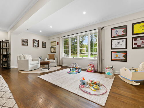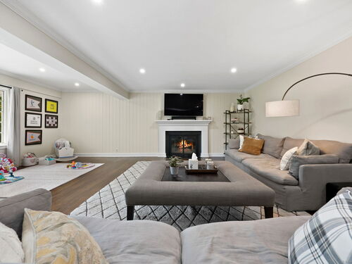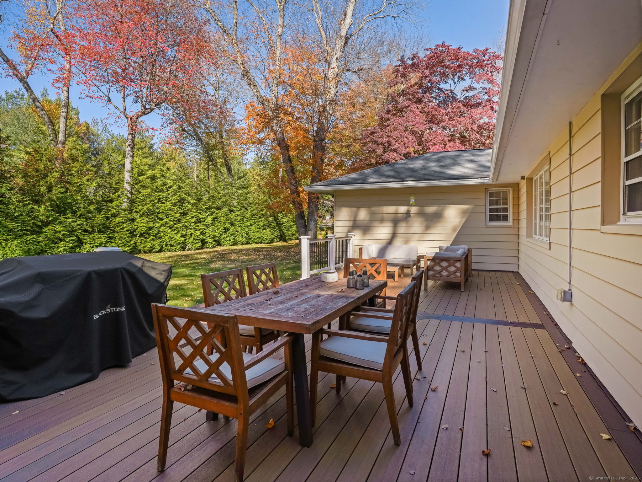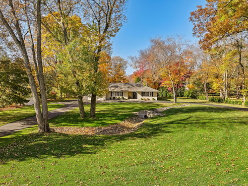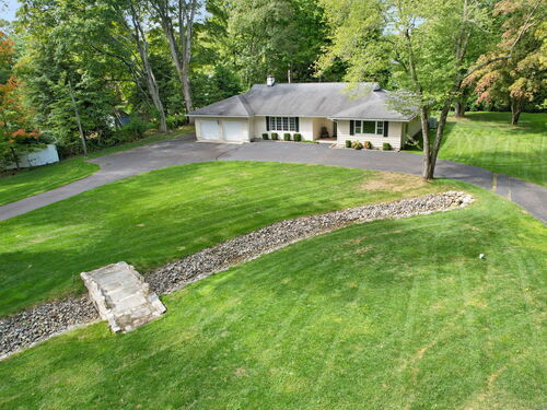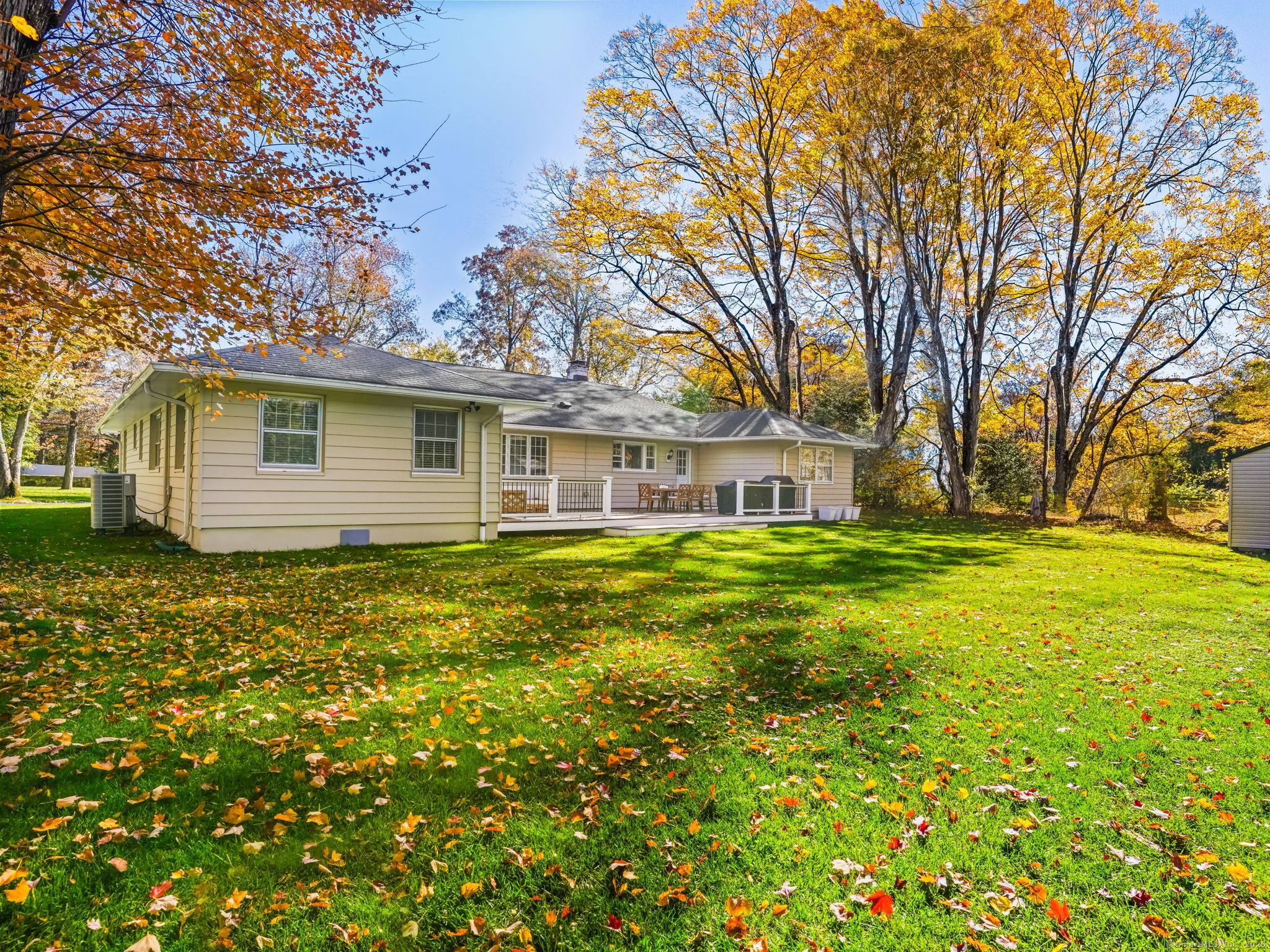 Beautifully updated 4-bedroom ranch on one level acre in a prime location close to train stations. A wraparound driveway leads to a spacious family room with fireplace, play area, and multiple seating areas. The primary suite includes a walk-in closet and en-suite bath, plus two additional bedrooms and a full bath. Dining room with bar and kitchen open to a large Azek deck, ideal for entertaining. Two-car garage and shed. Recent updates include landscaping with 55 Green Giant arborvitae for privacy and screening, new tile entry, fresh interior and exterior paint, upgraded HVAC, duct insulation, hot water heater (2024), and new attic and crawl space insulation for efficiency. A Tom Fazio-designed Swilcan Bridge replica adds a distinctive touch for golf enthusiasts.