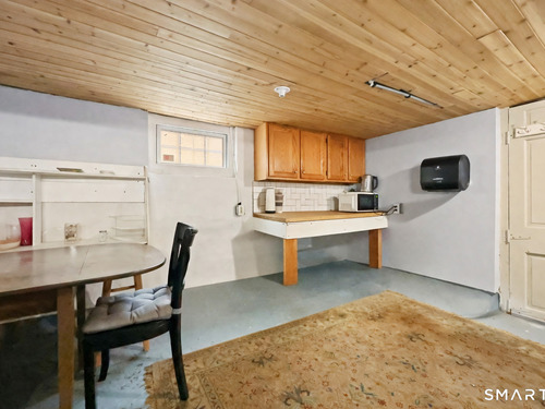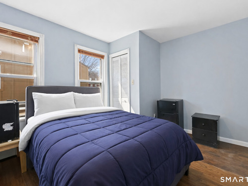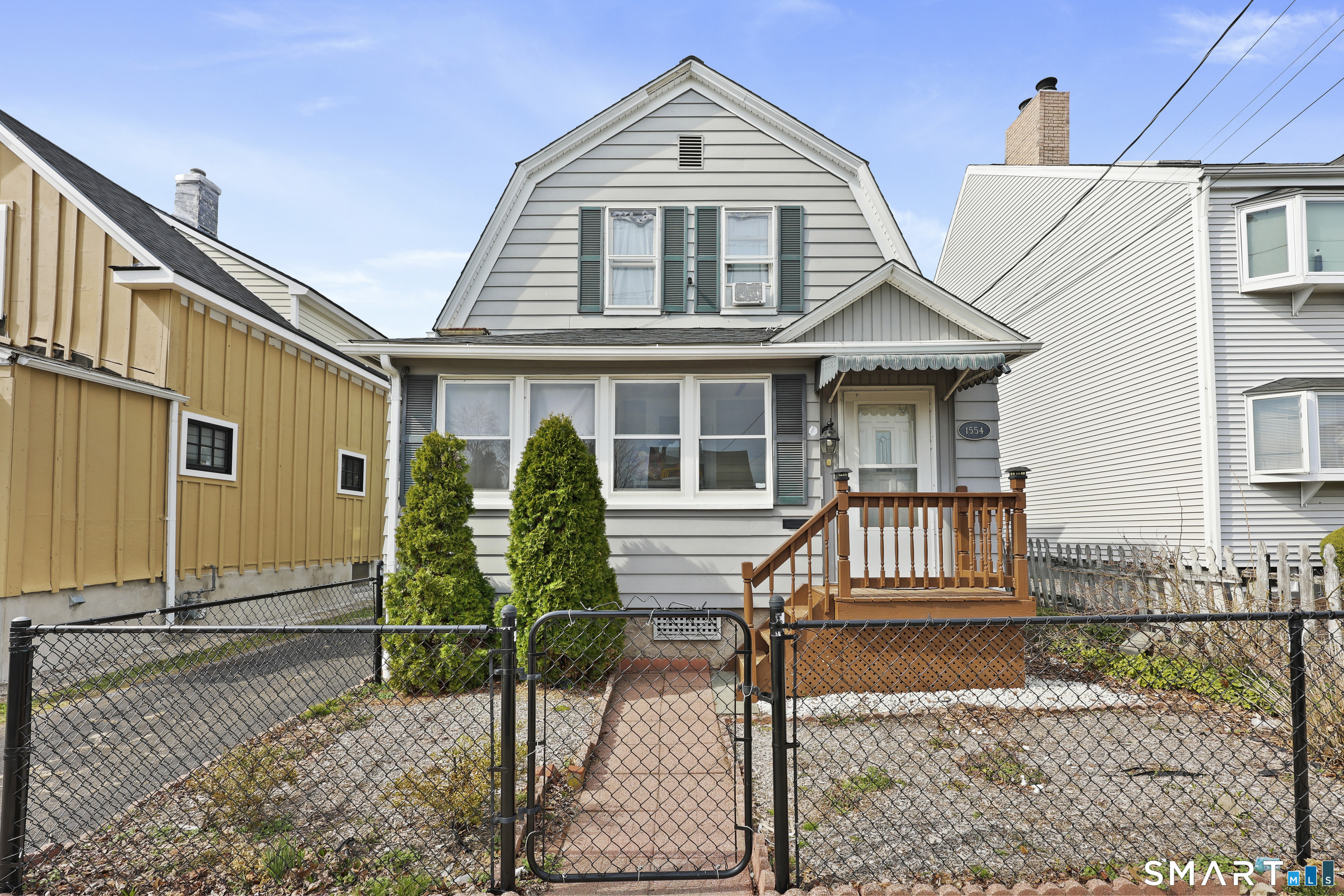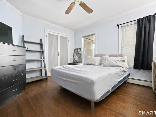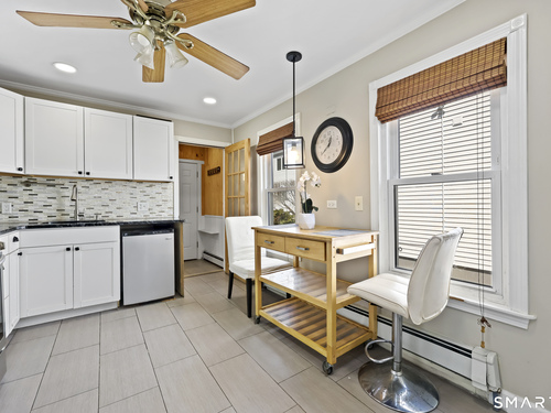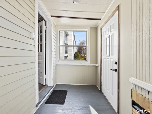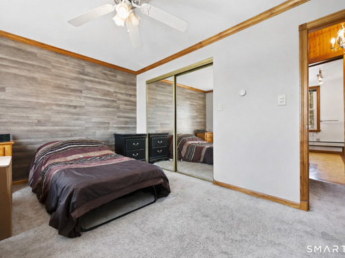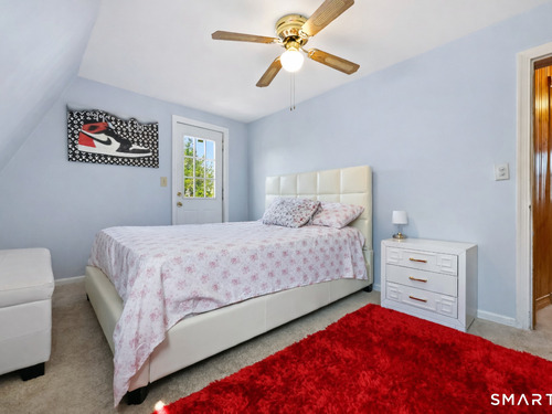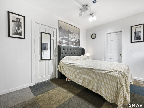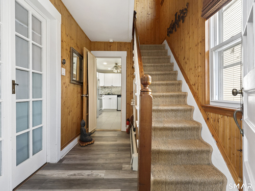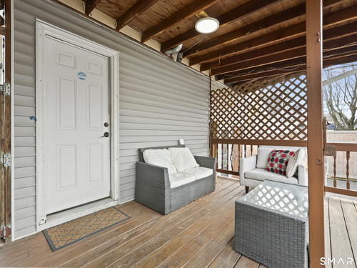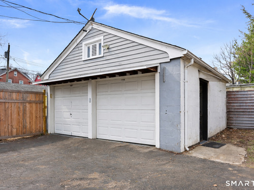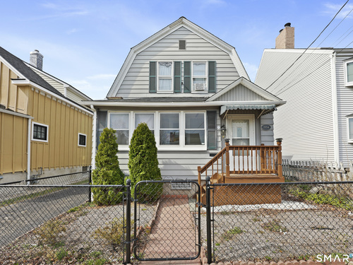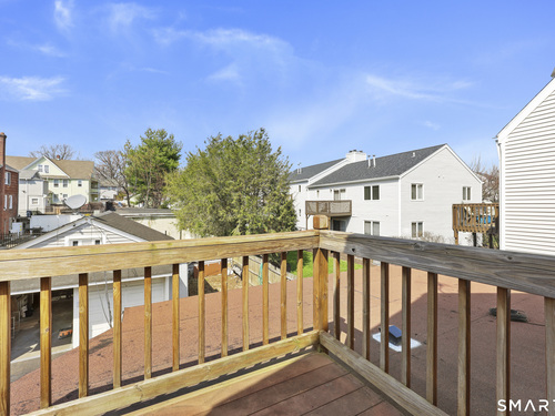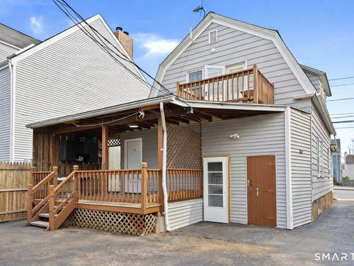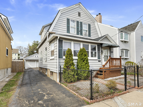 2-bedroom, 2-bathroom Colonial in Bridgeport, Connecticut. This single-family home offers a flexible layout with a one-car garage and adjacent studio space - ideal for a home office, art studio, or workshop. The main level features a living room with French doors, a formal dining room or den, a full bathroom, and a kitchen equipped with a gas range. Hardwood floors and carpeting run throughout the home. A rear porch off the kitchen opens to the backyard for outdoor dining and entertaining. The upper level includes two bedrooms, a full bathroom, and a private balcony. The finished basement adds valuable living space for a recreation room, guest suite, or additional storage. Ideally located with convenient access to major commuter routes, Metro-North stations, and the Fairfield County shoreline. A well-sized Colonial with studio space, finished basement, and outdoor living.