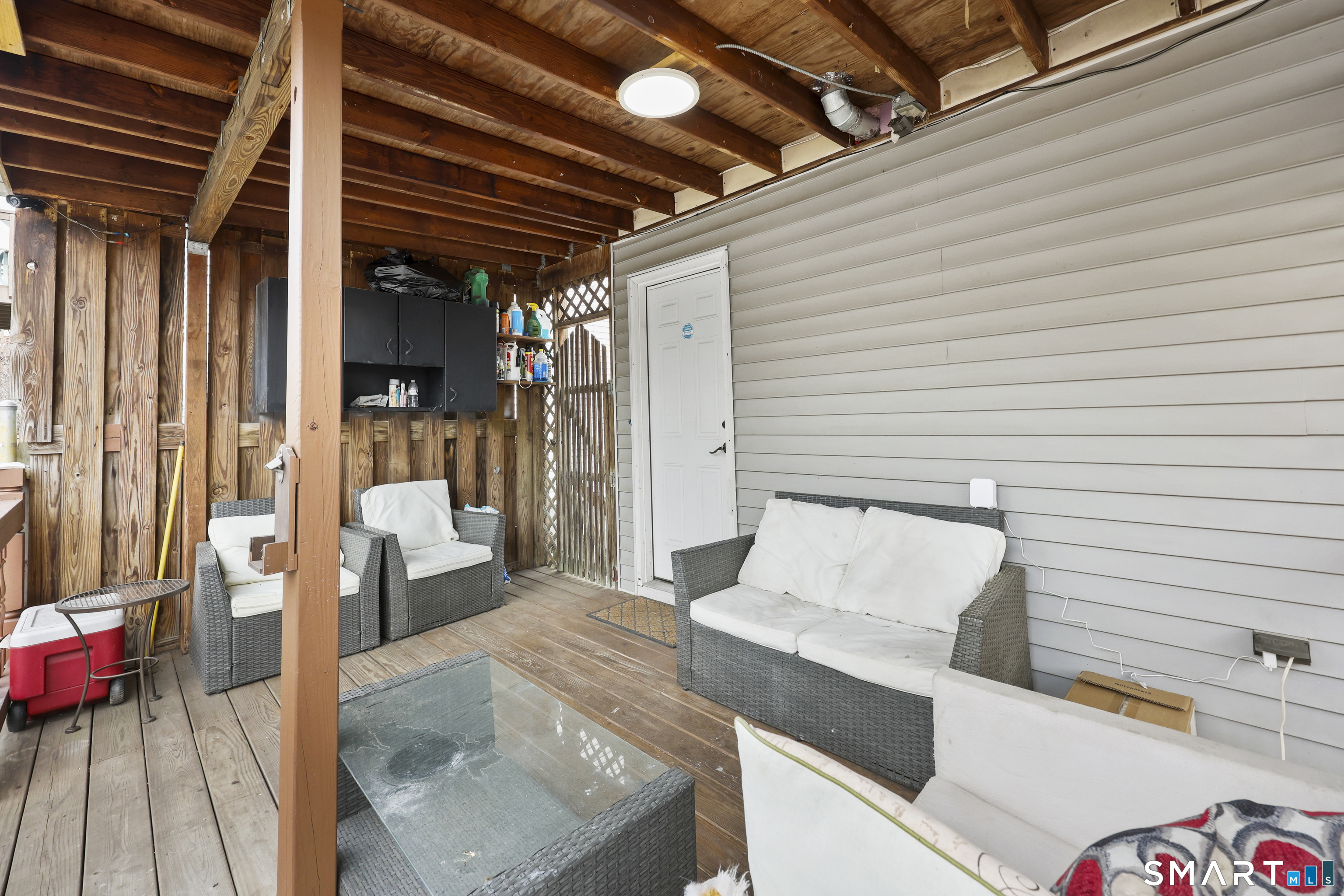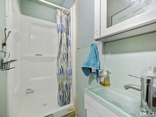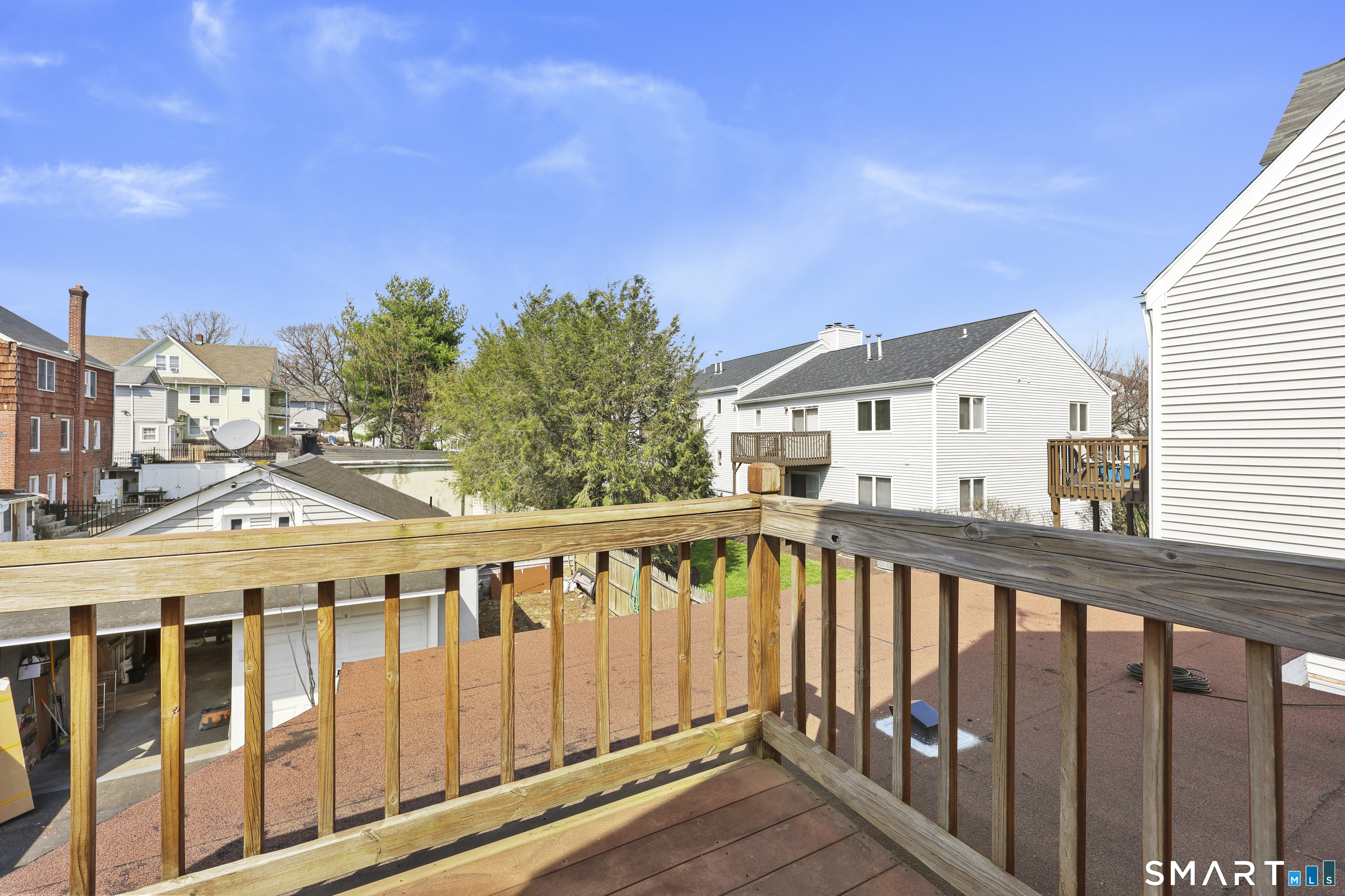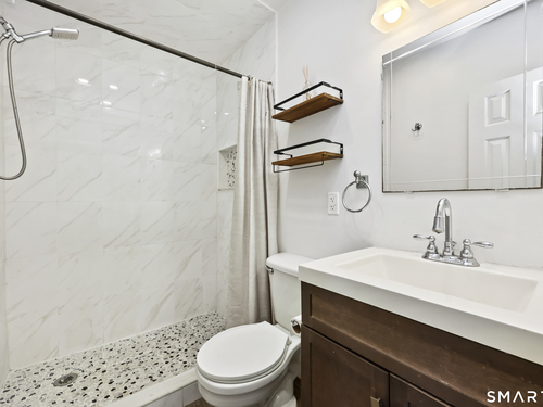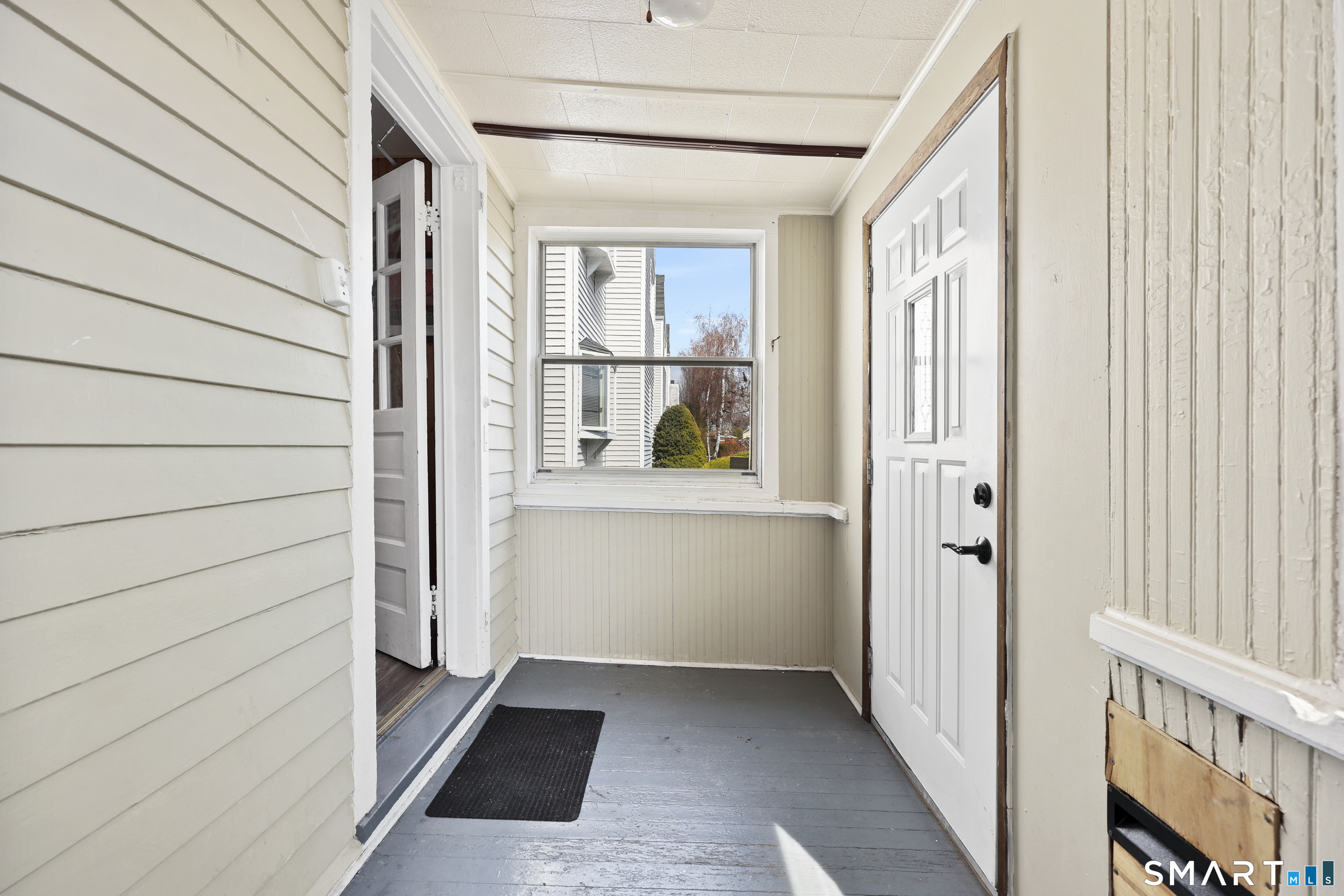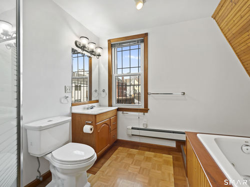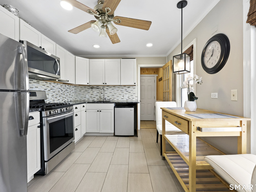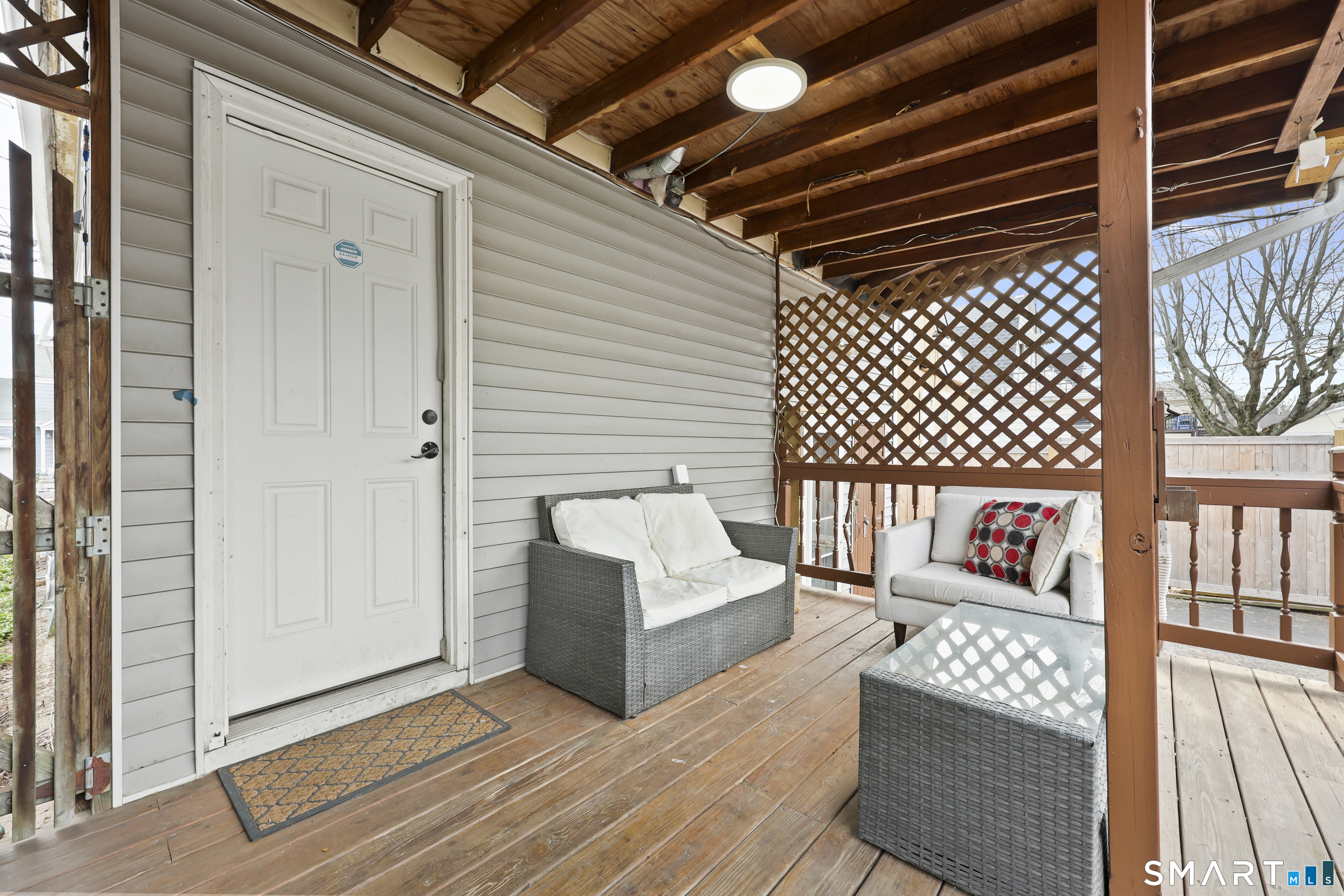 2-bedroom, 2-bathroom Colonial in Bridgeport, Connecticut. This single-family home offers a flexible layout with a one-car garage and adjacent studio space - ideal for a home office, art studio, or workshop. The main level features a living room with French doors, a formal dining room or den, a full bathroom, and a kitchen equipped with a gas range. Hardwood floors and carpeting run throughout the home. A rear porch off the kitchen opens to the backyard for outdoor dining and entertaining. The upper level includes two bedrooms, a full bathroom, and a private balcony. The finished basement adds valuable living space for a recreation room, guest suite, or additional storage. Ideally located with convenient access to major commuter routes, Metro-North stations, and the Fairfield County shoreline. A well-sized Colonial with studio space, finished basement, and outdoor living.