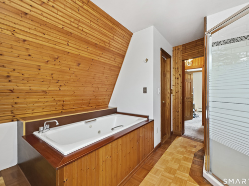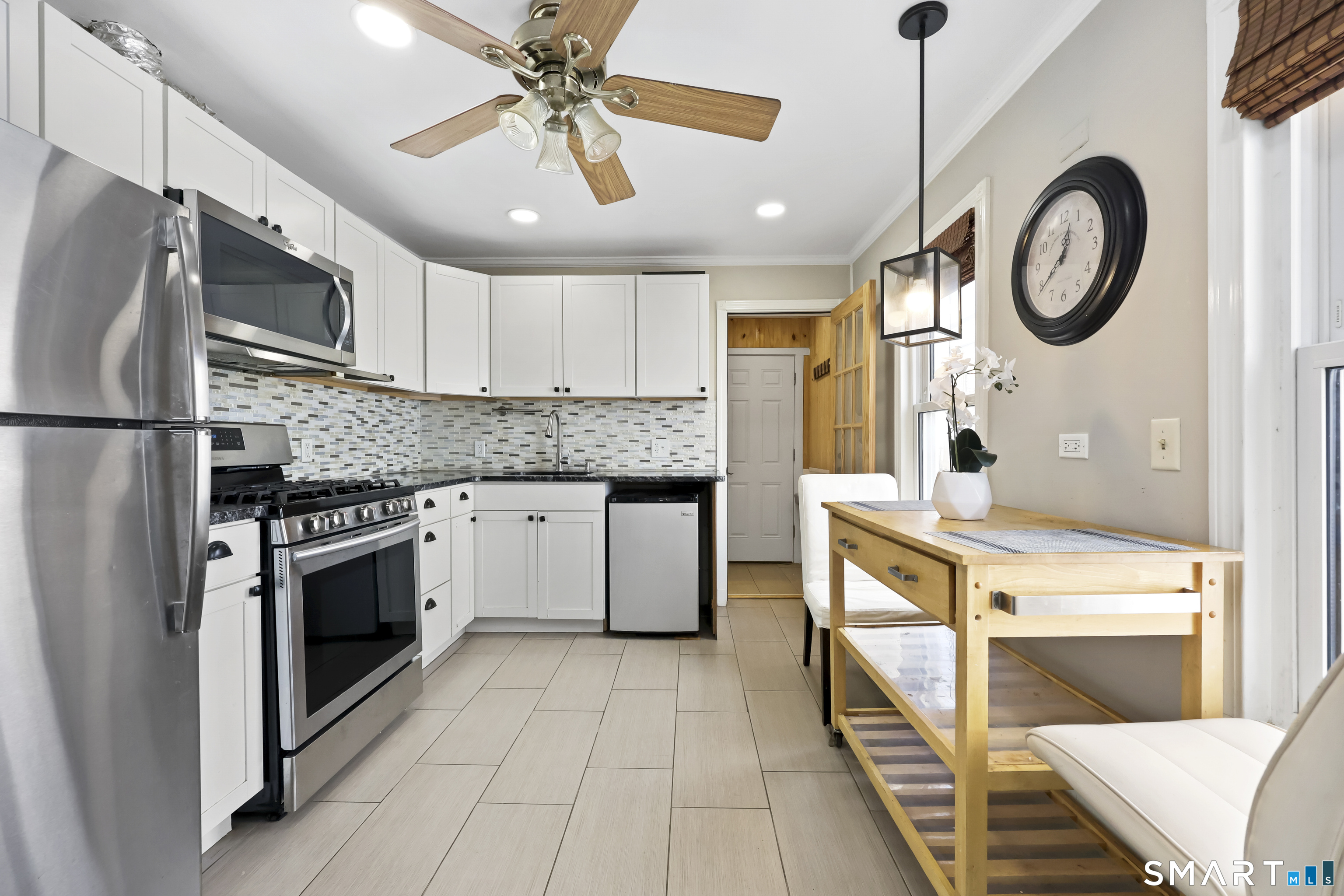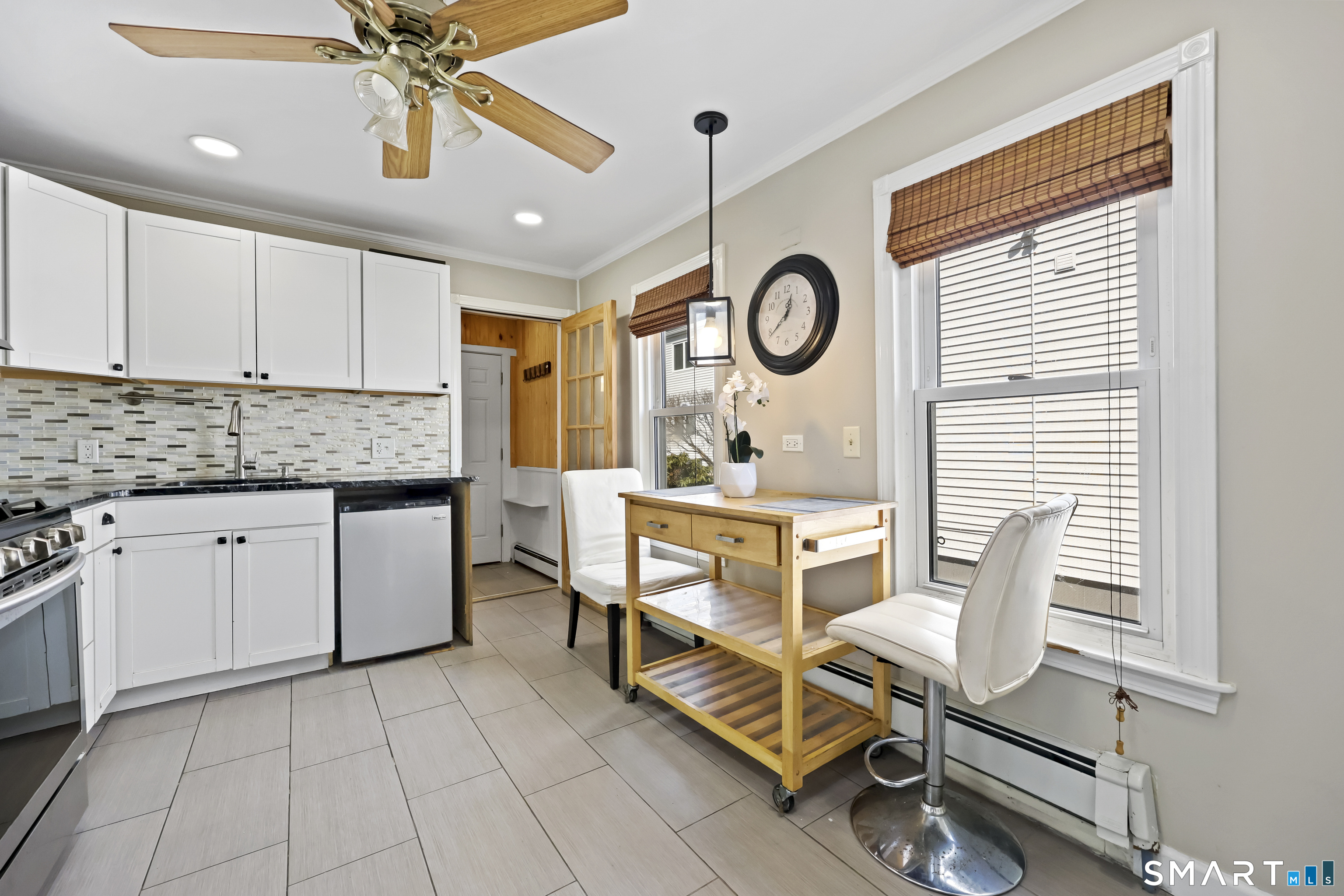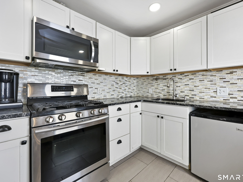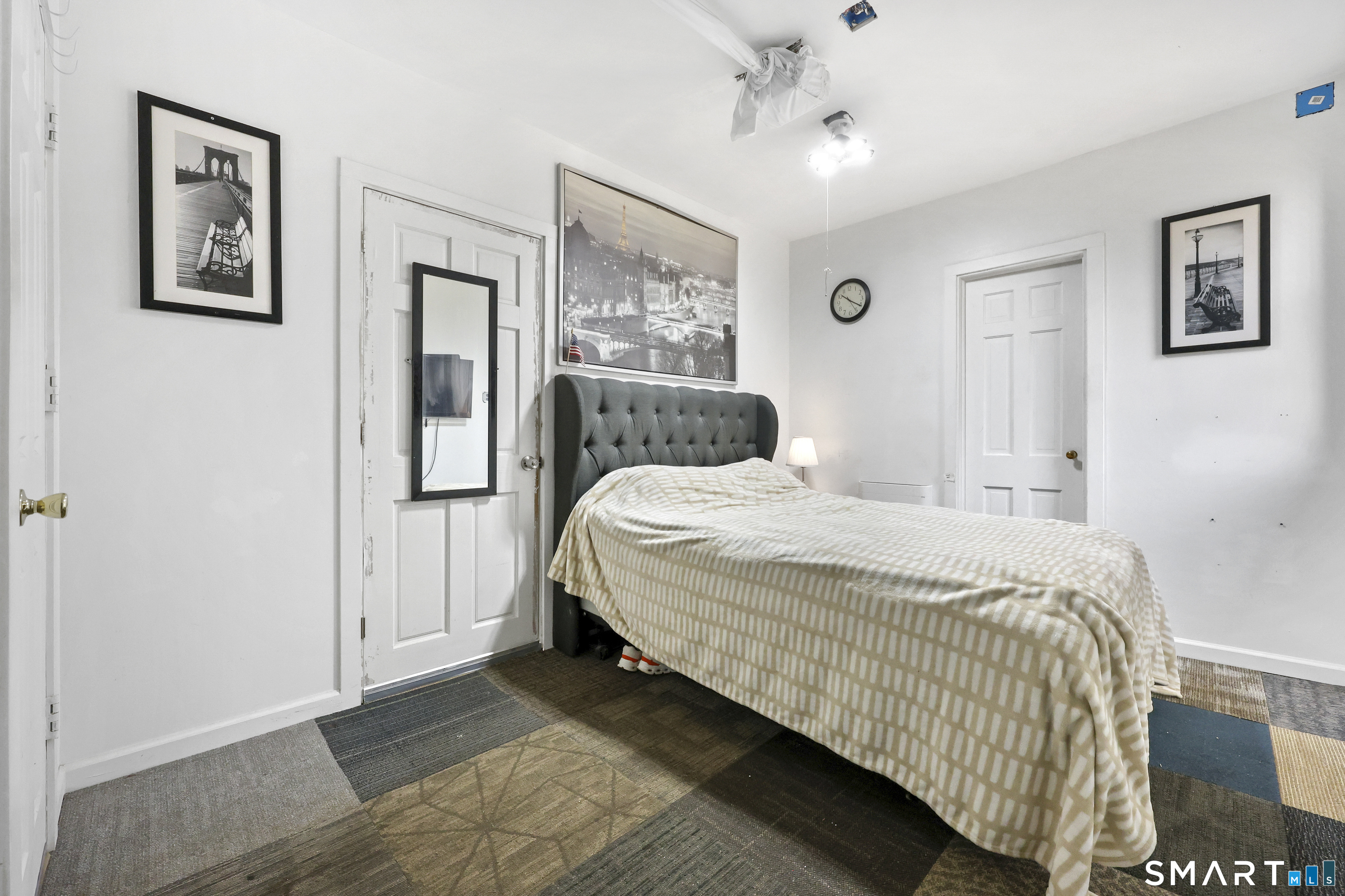 2-bedroom, 2-bathroom Colonial in Bridgeport, Connecticut. This single-family home offers a flexible layout with a one-car garage and adjacent studio space - ideal for a home office, art studio, or workshop. The main level features a living room with French doors, a formal dining room or den, a full bathroom, and a kitchen equipped with a gas range. Hardwood floors and carpeting run throughout the home. A rear porch off the kitchen opens to the backyard for outdoor dining and entertaining. The upper level includes two bedrooms, a full bathroom, and a private balcony. The finished basement adds valuable living space for a recreation room, guest suite, or additional storage. Ideally located with convenient access to major commuter routes, Metro-North stations, and the Fairfield County shoreline. A well-sized Colonial with studio space, finished basement, and outdoor living.