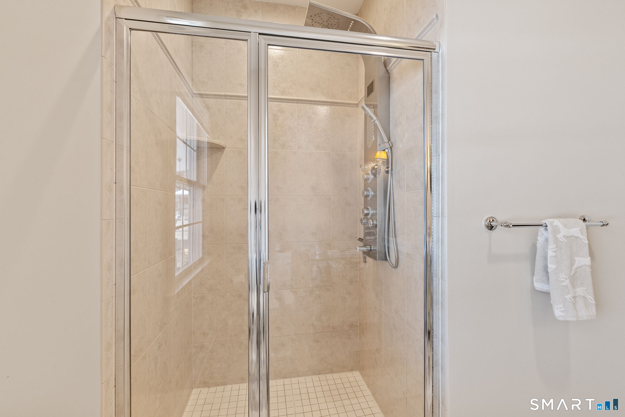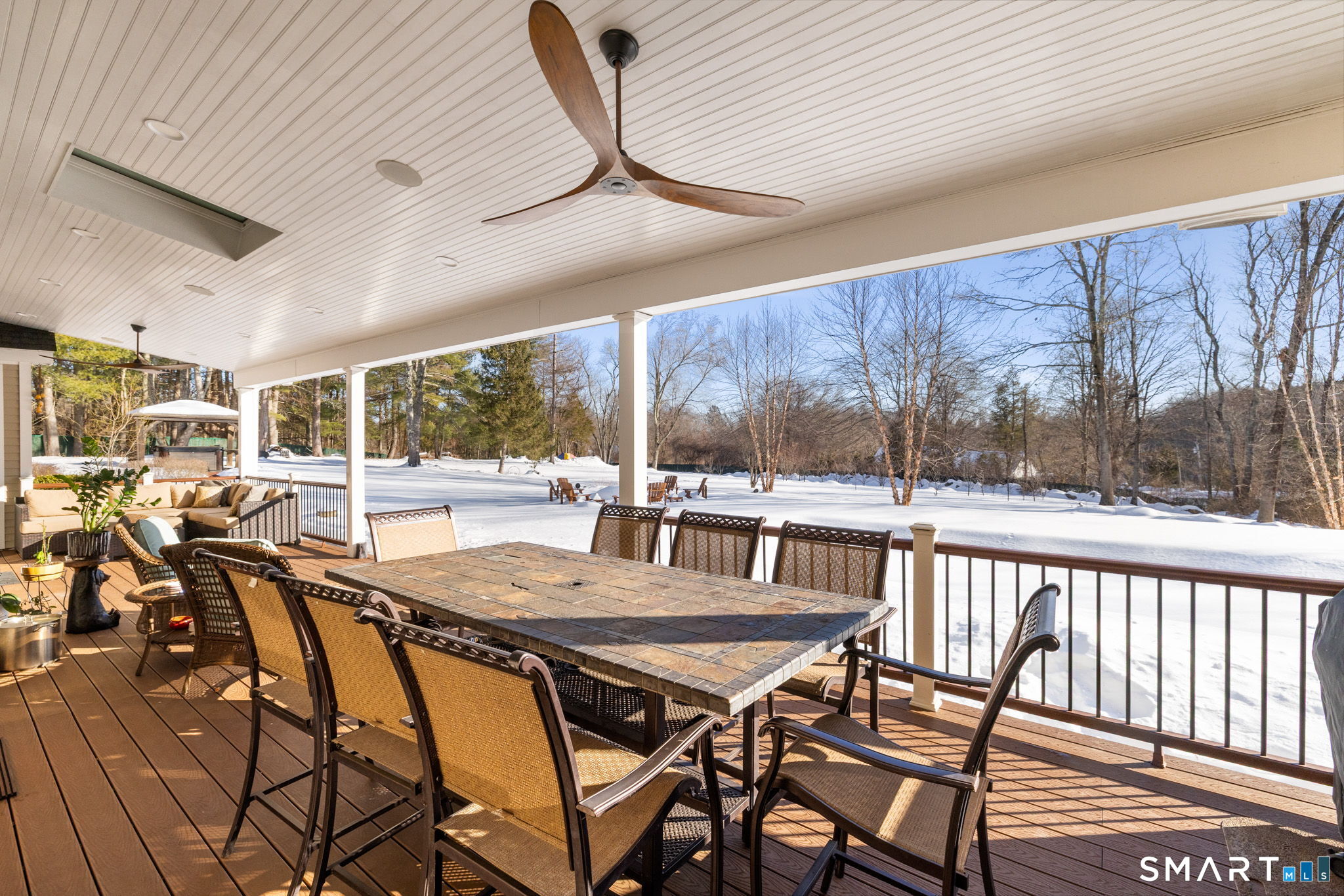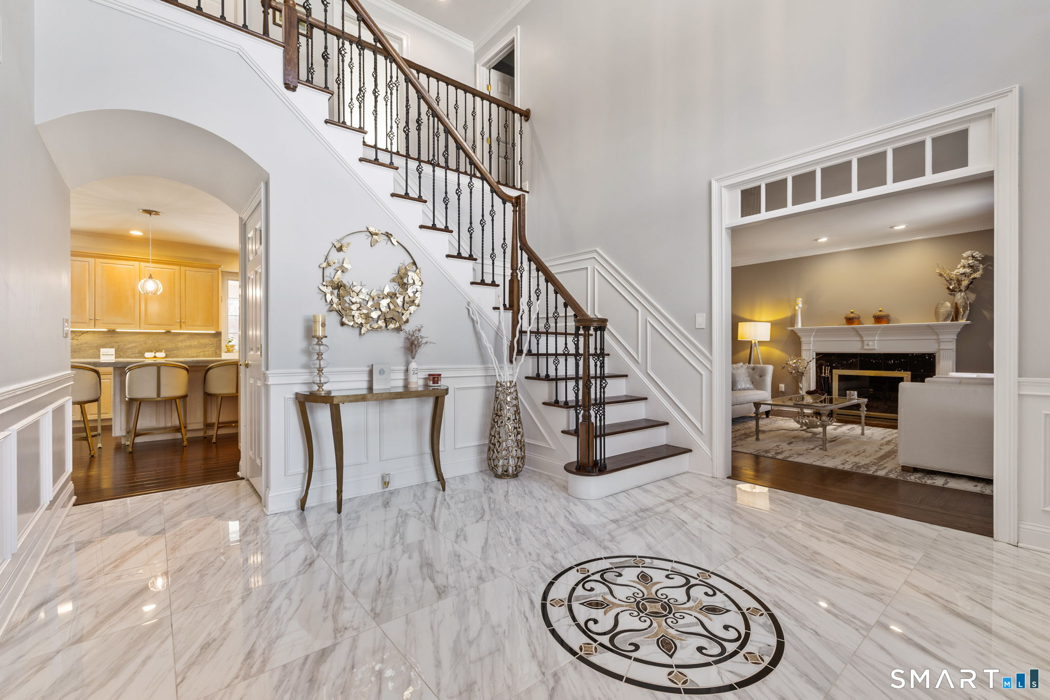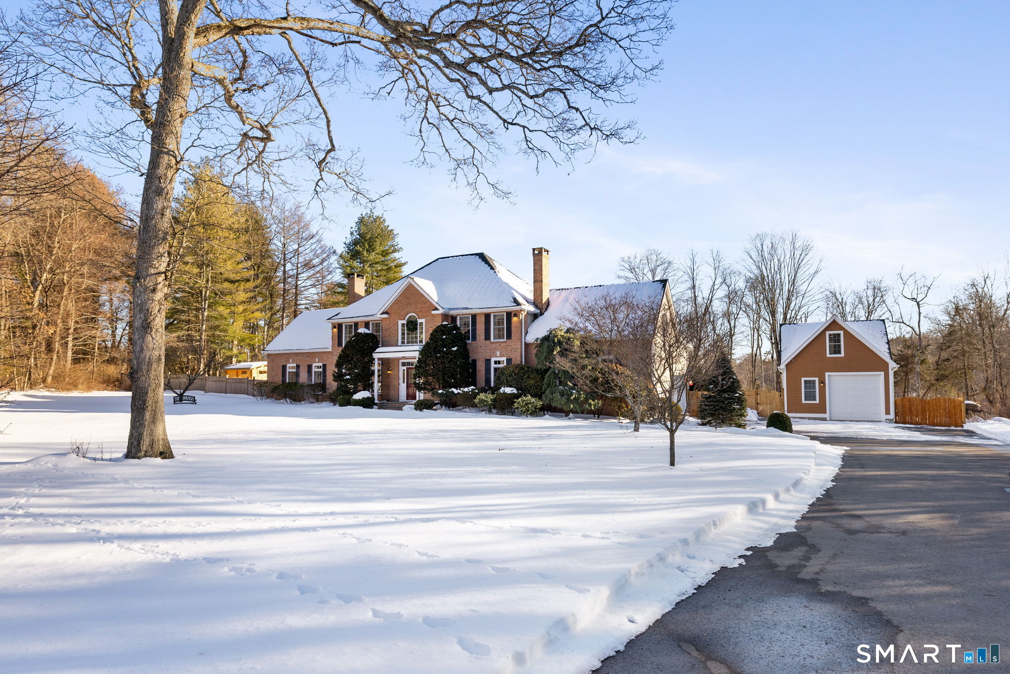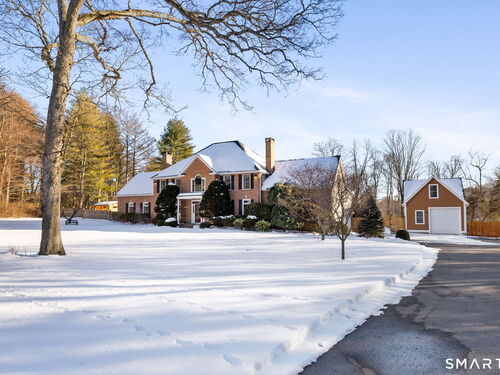 This stately Colonial tucked away at the end of a cul de sac in Easton, blends classic architecture with resort style living. From the moment you arrive, the brick facade and grand scale set the tone. Stepping inside, the impressive two story foyer with gleaming marble floors and Palladian windows creates a true magazine worthy first impression. Crown molding flows throughout the home along with hardwood floors and soaring ceilings. The kitchen is the heart of the home, featuring granite counters & backsplashes, a large center island, stainless appliances, and sliders leading to a heated deck complete with ceiling fans, an ideal space for outdoor dining across the seasons. Designed with flexibility in mind, the layout supports generational living with a bedroom and full bath on the lower level along with additional finished space for recreation or guests. Upstairs, the primary suite is a true retreat with a spa-like bath with whirlpool tub & stall shower, a walk-in closet and a stunning study with vaulted ceilings and Palladian windows offering the perfect work from home setting. Outside, your private backyard oasis awaits with a sauna, outdoor shower, and a hot tub set beneath a gazebo for year round enjoyment. Car enthusiasts and hobbyists will appreciate the three car garage as well as a detached single car garage with a loft style study above. Close to golf courses, parks, and shopping, this property offers refined living with the comfort and privacy of a retreat.
