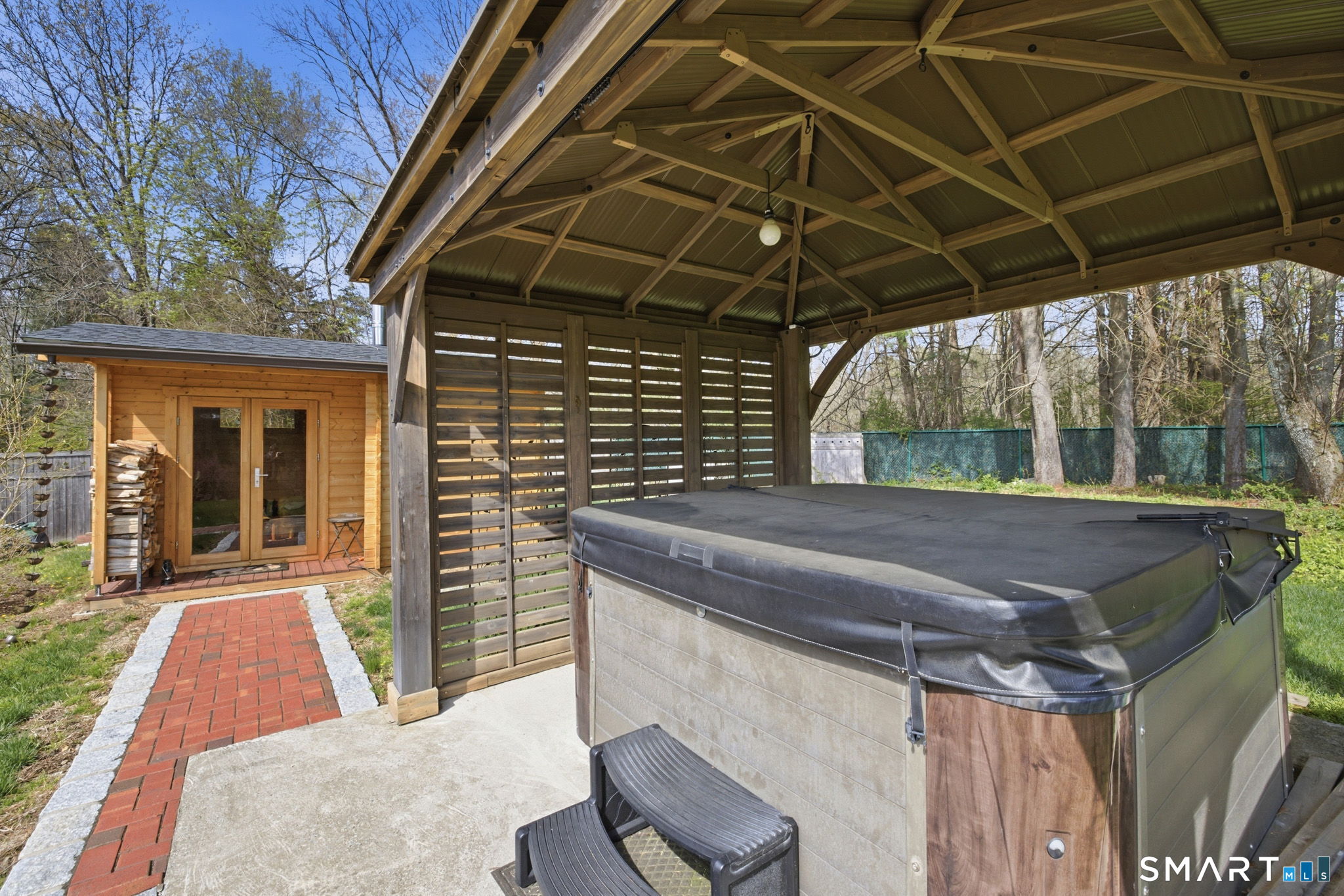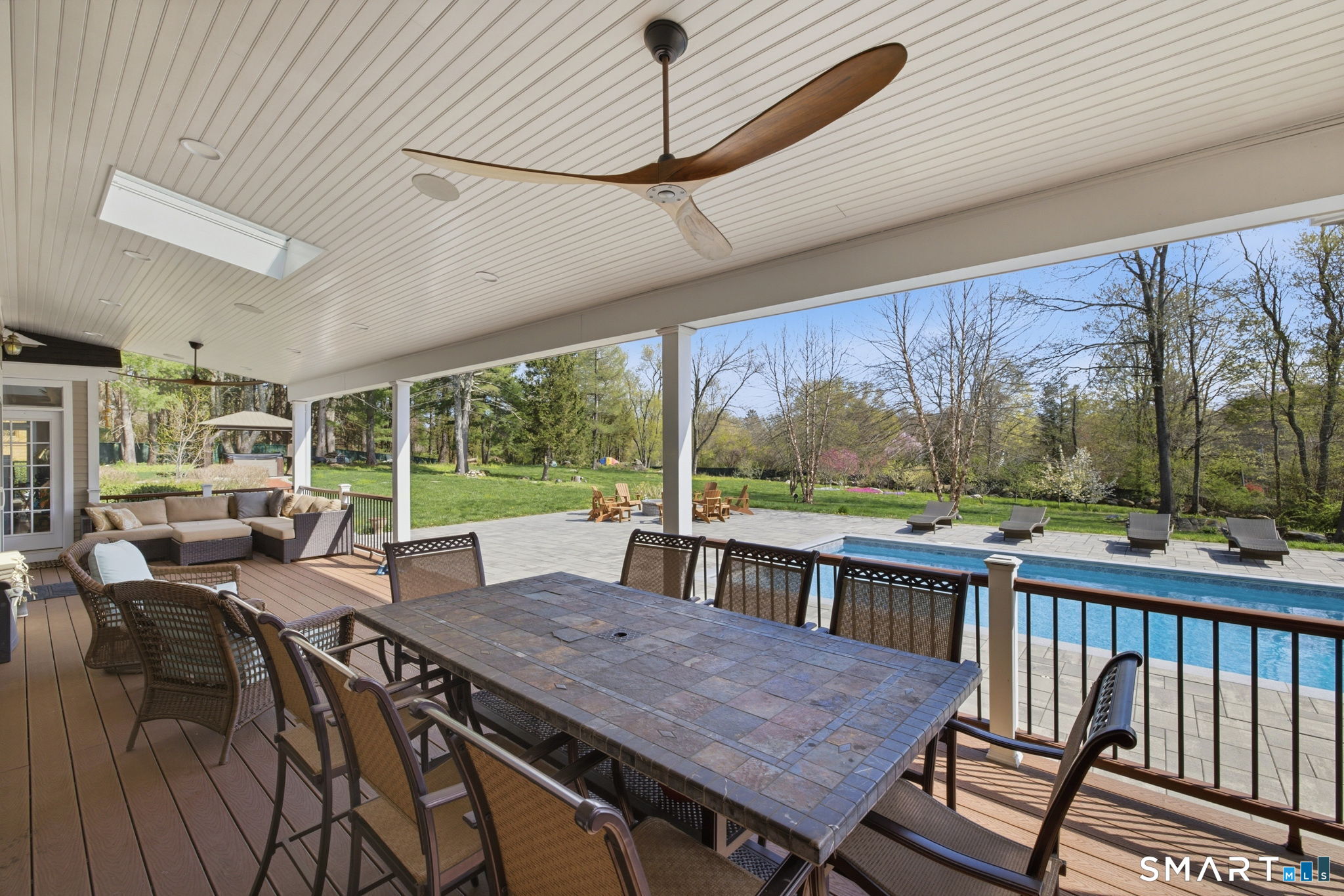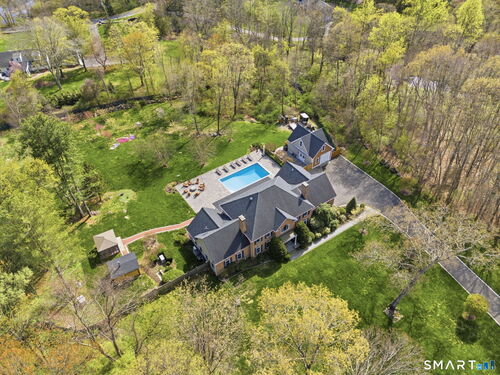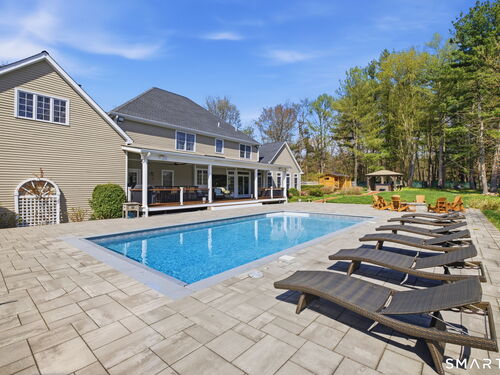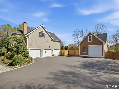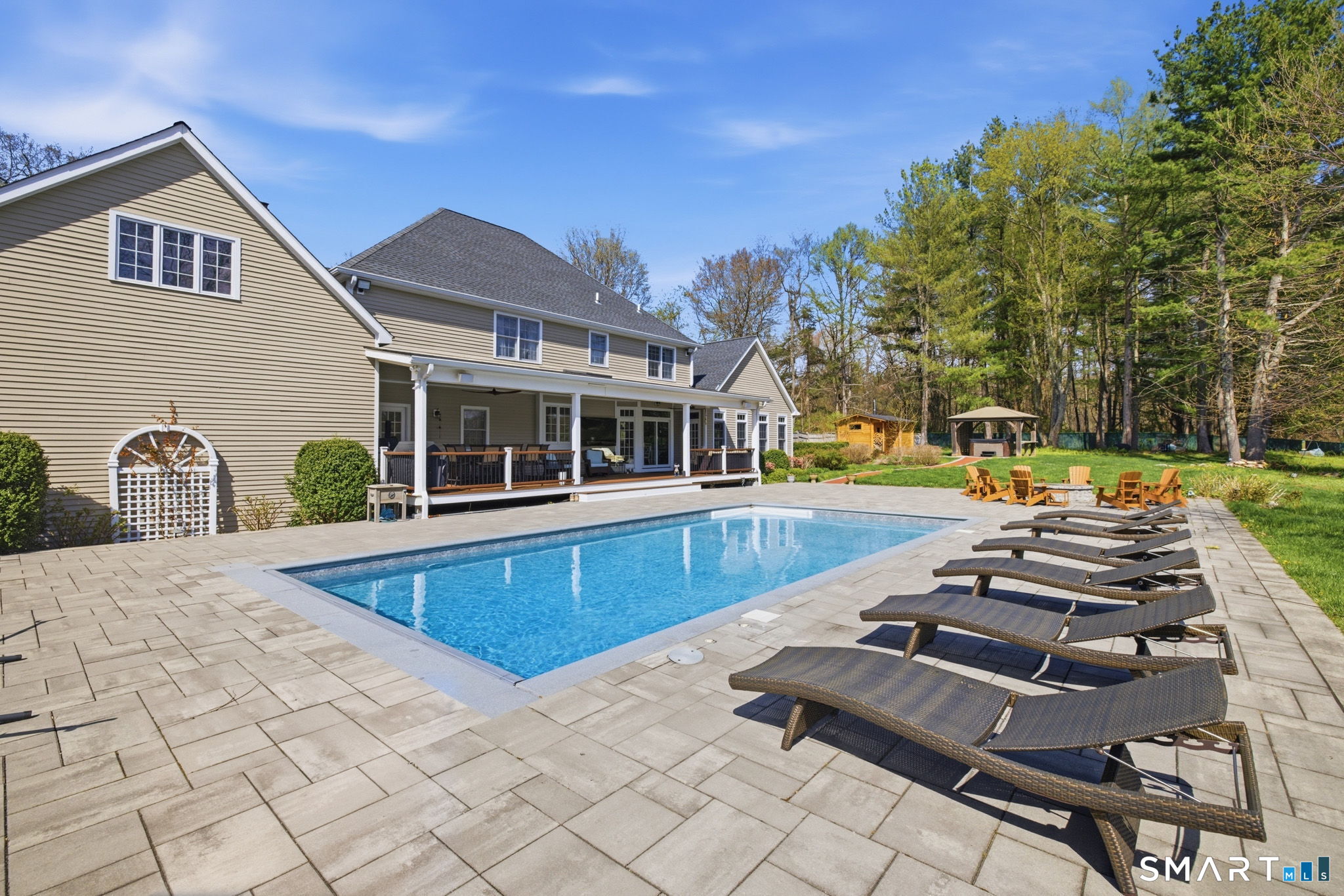 This stately Colonial tucked away at the end of a cul de sac in Easton, blends classic architecture with resort style living. From the moment you arrive, the brick facade and grand scale set the tone. Stepping inside, the impressive two story foyer with gleaming marble floors and Palladian windows creates a true magazine worthy first impression. Crown molding flows throughout the home along with hardwood floors and soaring ceilings. The kitchen is the heart of the home, featuring granite counters & backsplashes, a large center island, stainless appliances, and sliders leading to a covered deck complete with ceiling fans, an ideal space for outdoor dining across the seasons. Designed with flexibility in mind, the layout supports generational living with a bedroom and full bath on the lower level along with additional finished space for recreation or guests. Upstairs, the primary suite is a true retreat with a spa-like bath with whirlpool tub & stall shower, a walk-in closet and a stunning study with vaulted ceilings and Palladian windows offering the perfect work from home setting. Outside, your private backyard awaits with a sauna, outdoor shower, and a hot tub set beneath a gazebo for year round enjoyment. Car enthusiasts and hobbyists will appreciate the three car garage as well as a detached single car garage with a loft that can fit a 24' jet boat. Close to golf courses, parks, and shopping, this property offers refined living with the comfort and privacy of a retreat