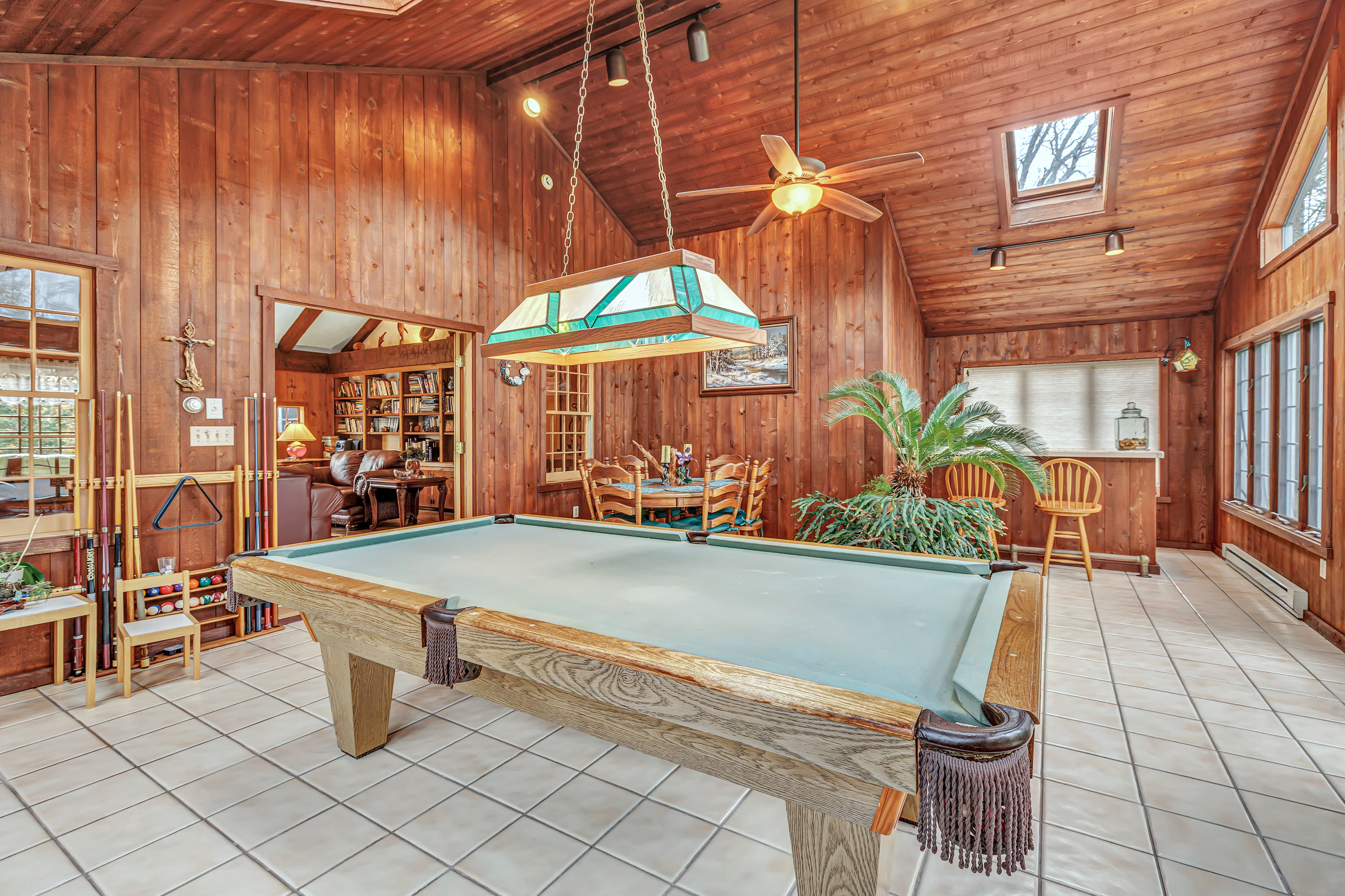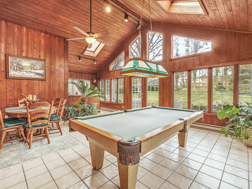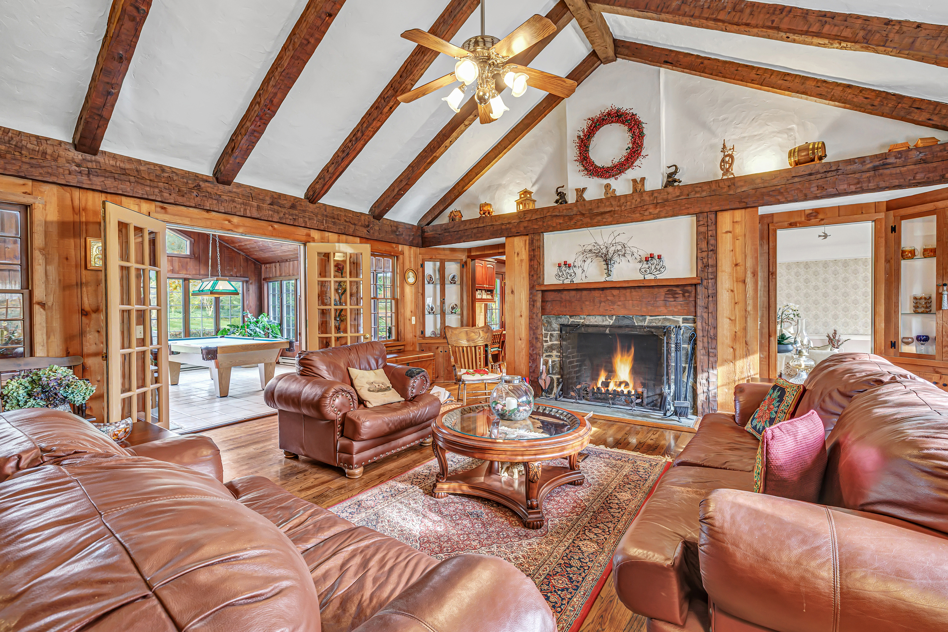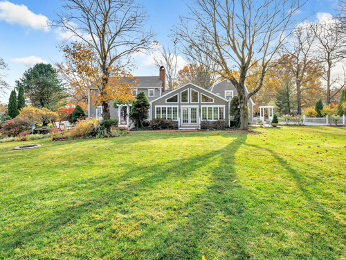 Experience timeless craftsmanship and modern comfort in this stunning Gunther-built custom home in Stratford, CT. Perfectly set on nearly one acre of beautifully landscaped property in one of Stratford's most desirable neighborhoods, this home is just steps from Booth Memorial Park. Inside, you'll find warm, light-filled spaces with classic design touches custom built-ins, exposed beams, and large windows throughout. The spacious dining room opens through French doors to a private patio and backyard, perfect for entertaining or relaxing outdoors. The great room features cathedral ceilings, rich woodwork, built-in bookcases, and a dramatic fireplace centerpiece. A four-season sunroom with wet bar, French doors, and pool table (included) offers the ultimate space for gatherings, game nights, or cozy weekends at home. The kitchen is beautifully updated with solid cherry cabinetry, granite countertops, and terra-cotta tile floors. Upstairs, enjoy three generous bedrooms, including a luxurious primary suite with walk-in closet, Jacuzzi soaking tub, and separate shower. A private one-bedroom, one-bath suite above the garage is ideal for guests or in-laws. This exceptional Stratford home combines timeless craftsmanship, quality finishes, and an unbeatable location-ready for you to move in and make it your own.