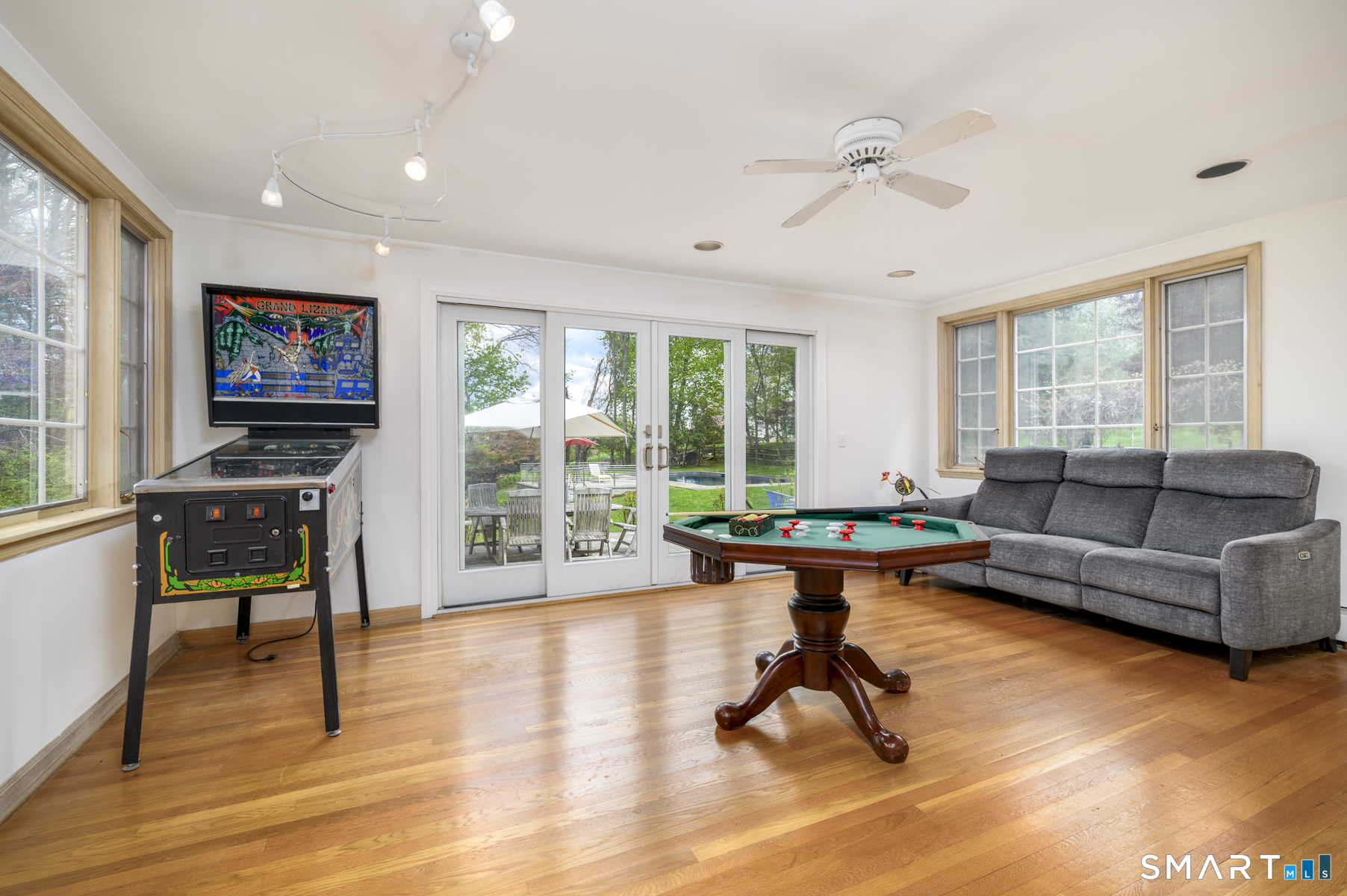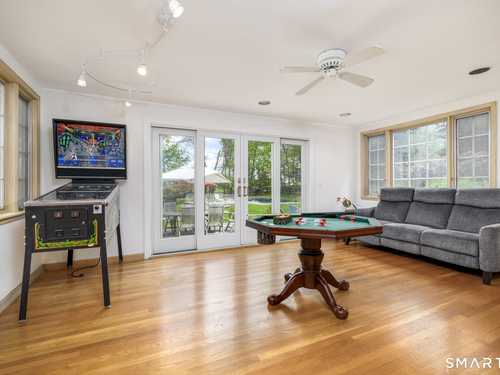 Den (Main Level)Ceiling Fan, Sliders, Hardwood Floor