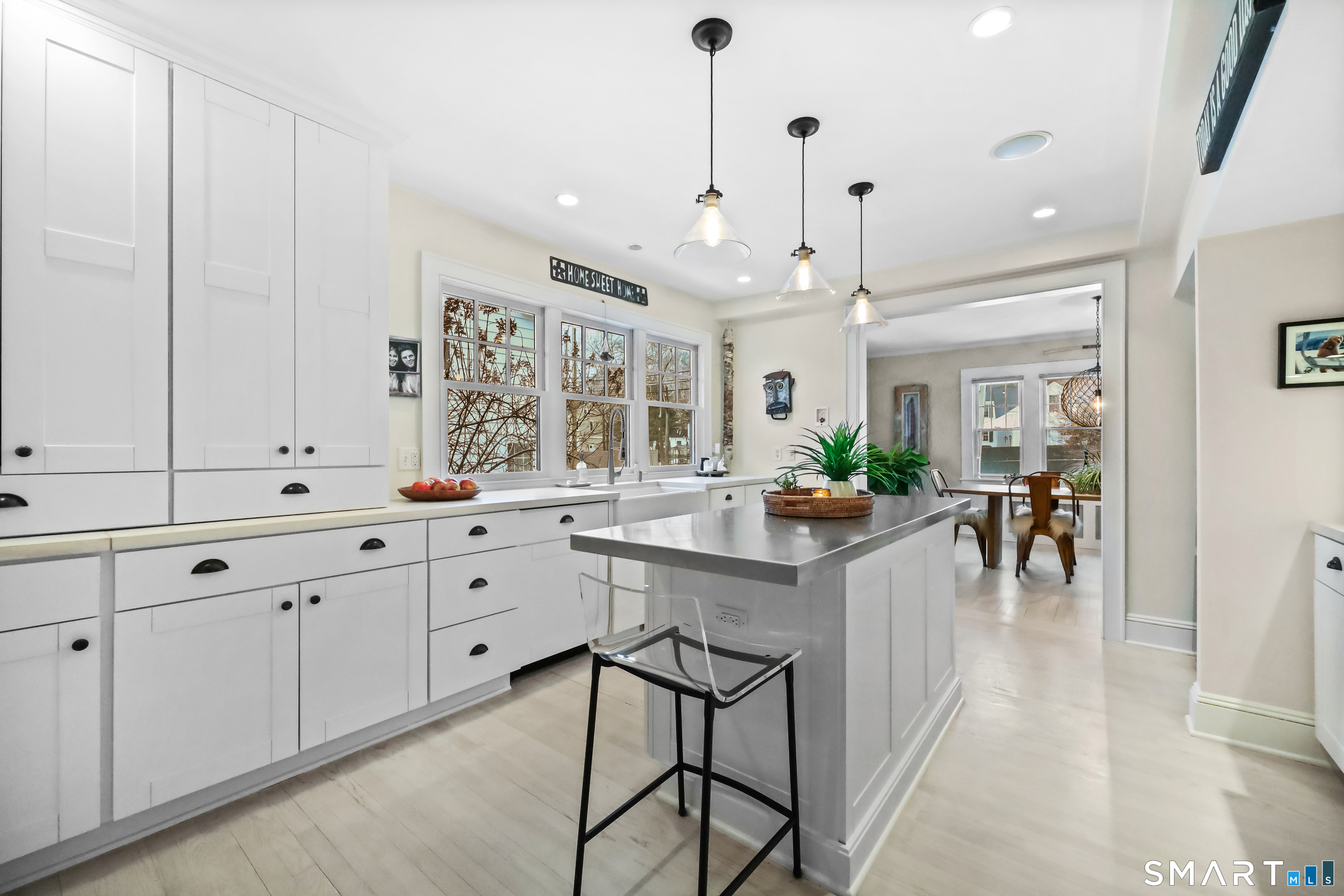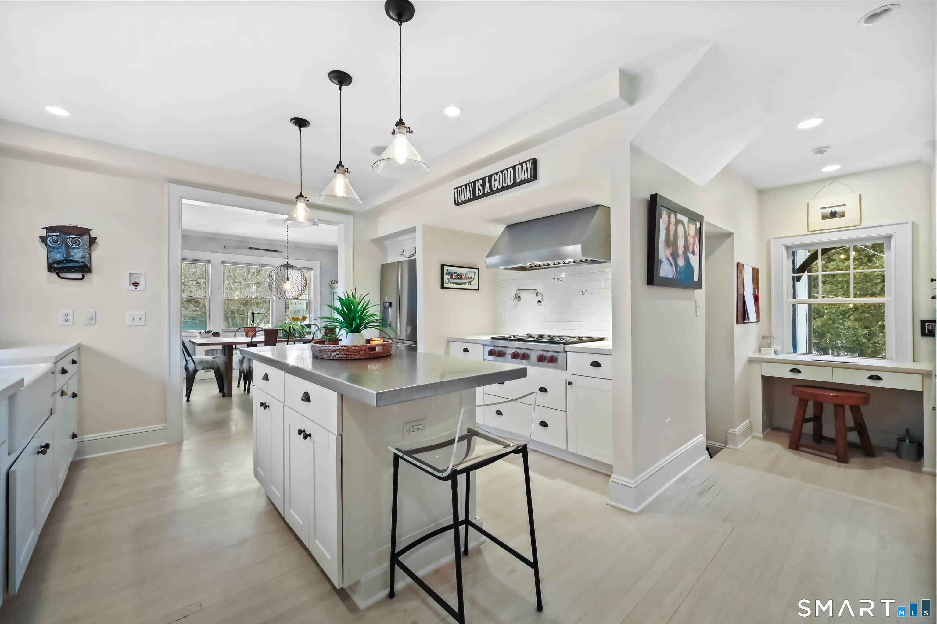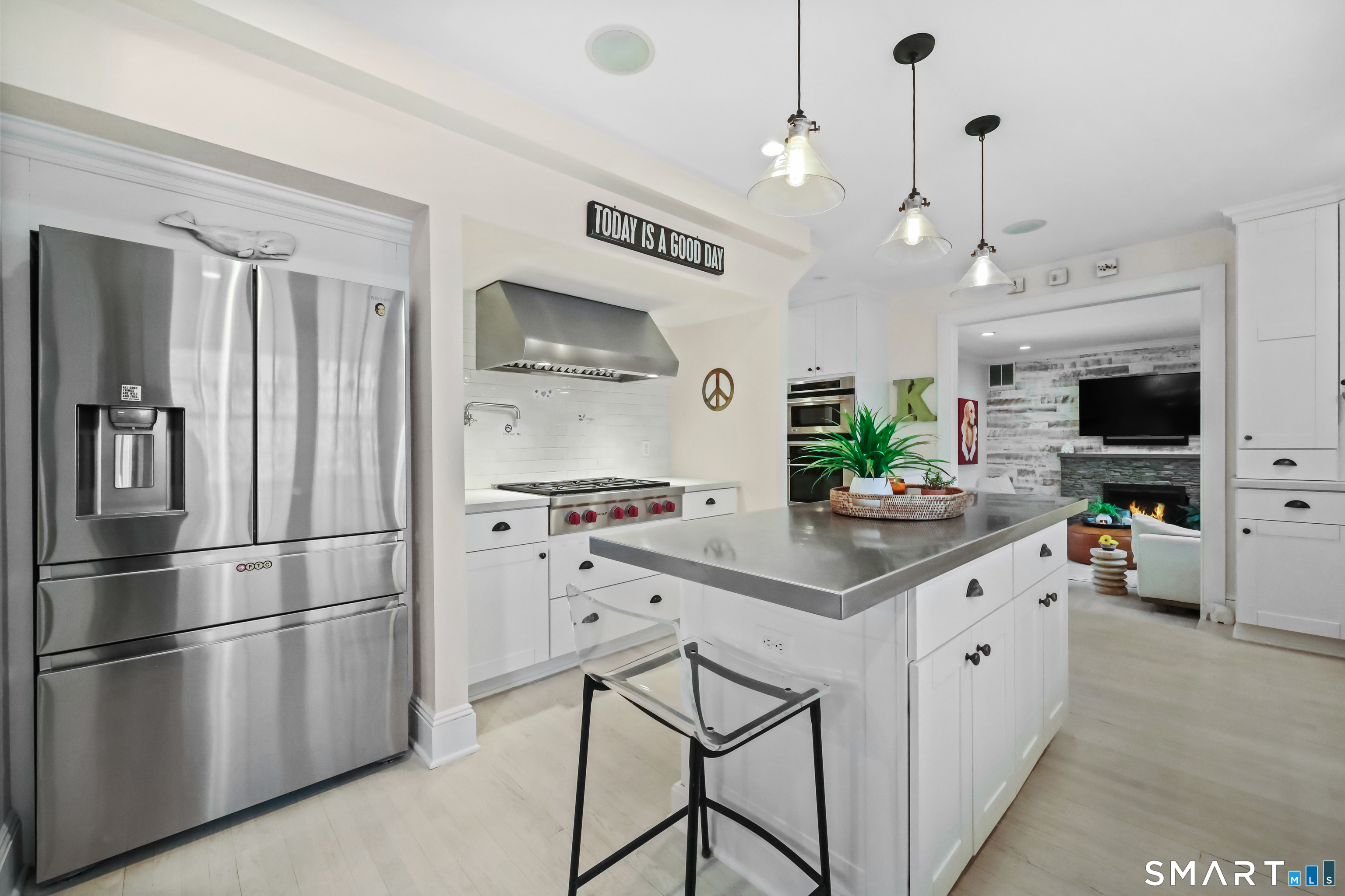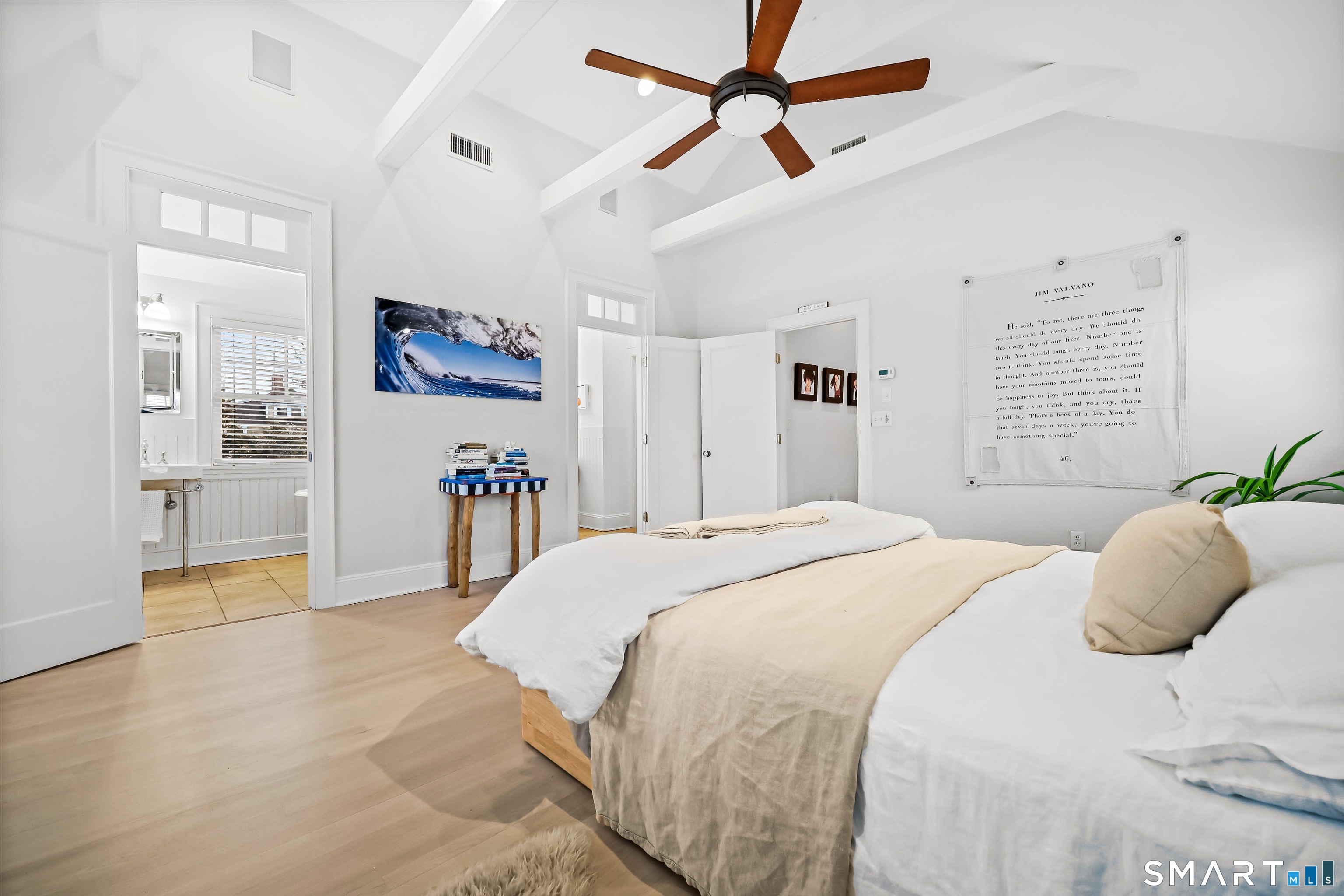Nestled in Fairfield's highly sought-after University neighborhood, this exceptional home beautifully blends timeless vintage charm with a warm, modern aesthetic. Set on a private, arborvitae-lined property, the outdoor space features a stone patio and gas fire rock seating area. Inside, the inviting layout offers effortless flow and abundant natural light. The living room, anchored by a wood-burning fireplace and French doors to the patio, opens seamlessly to the dining room and sunny kitchen. The custom kitchen connects to a family room with soaring 10-foot ceilings & roaring stone fireplace. Spacious primary bedroom with vaulted ceilings, beams, bath with glass shower, soaking tub & walk-in closet is a lovely oasis. Guest room with ensuite bath & walk-in closet plus 2 additional bedrooms complete the 2nd level. 3rd level bonus area offers flexible space with 5th bedroom. The finished lower level provides versatility and extra living space. Additional amenities include, study, mudroom, 2 laundry rooms, irrigation system, 2 car garage and much more. Ideally located just minutes from vibrant Fairfield town center and train (1 mi), Beach (1.3 mi), Marina (1.1 mi), Tennis & golf. Waterfront community offering historic charm, dining, shopping, arts & 2 universities, just 50 miles from NYC.