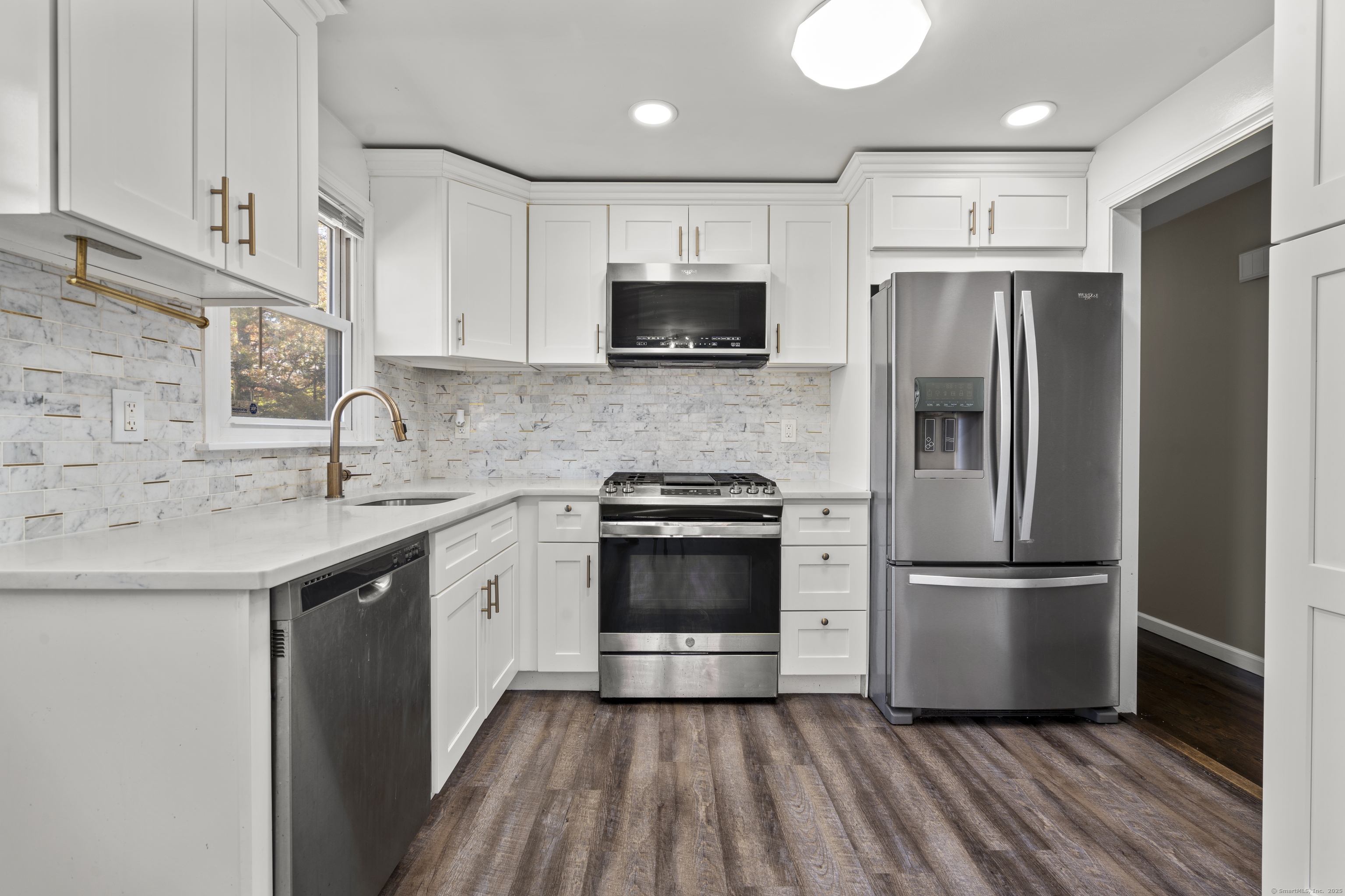 Charming and move-in ready, this ranch-style home is located in Bridgeport's desirable North End. Conveniently close to public transportation, shopping, Sacred Heart University, and the Merritt Parkway. The main level offers 1,140 sq. ft. of living space with three spacious bedrooms and two full baths, plus a fully finished walk-out basement. The updated kitchen features stainless steel appliances, modern cabinetry, and quartz countertops with newly refinished hardwood floors throughout. Relax or entertain in the fully fenced backyard. Ideal for homeowners, professionals, or investors seeking comfort and convenience in a prime location.